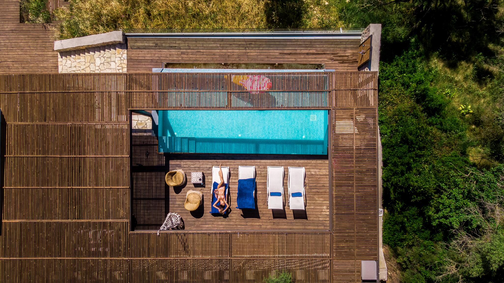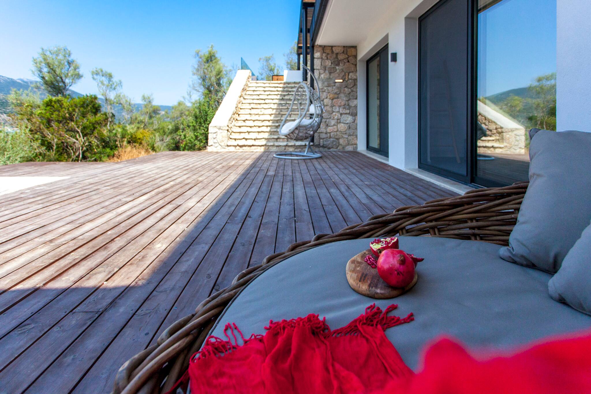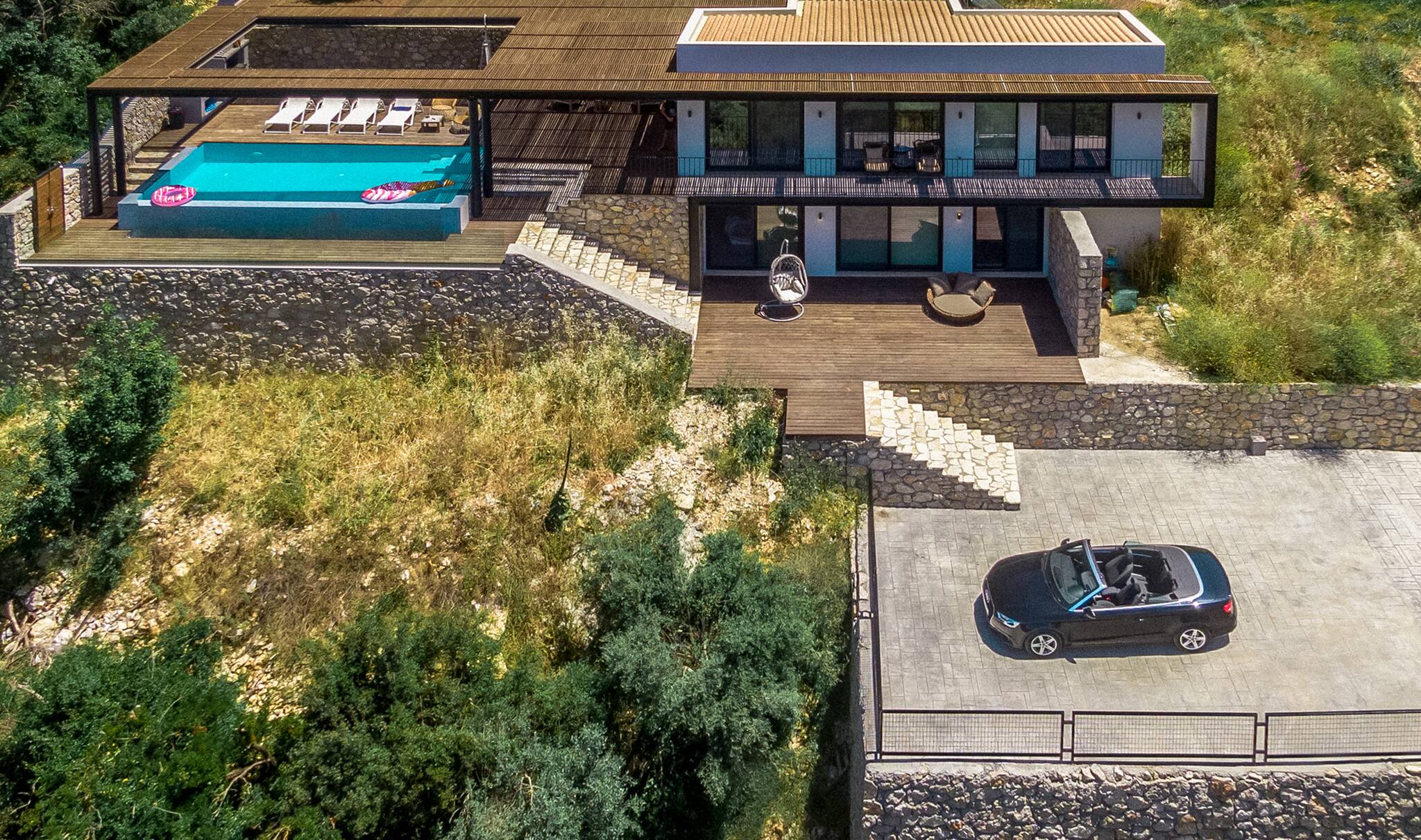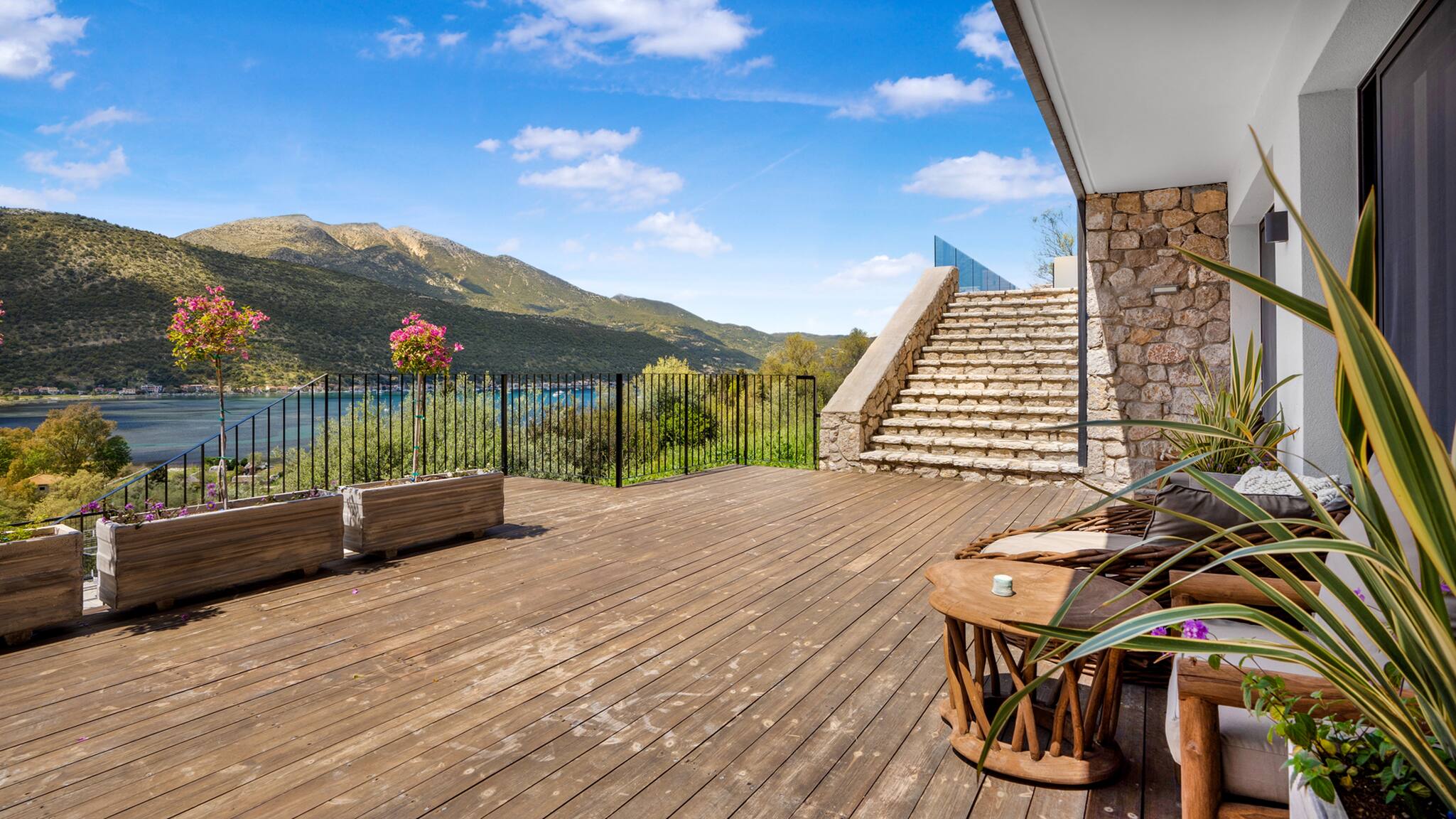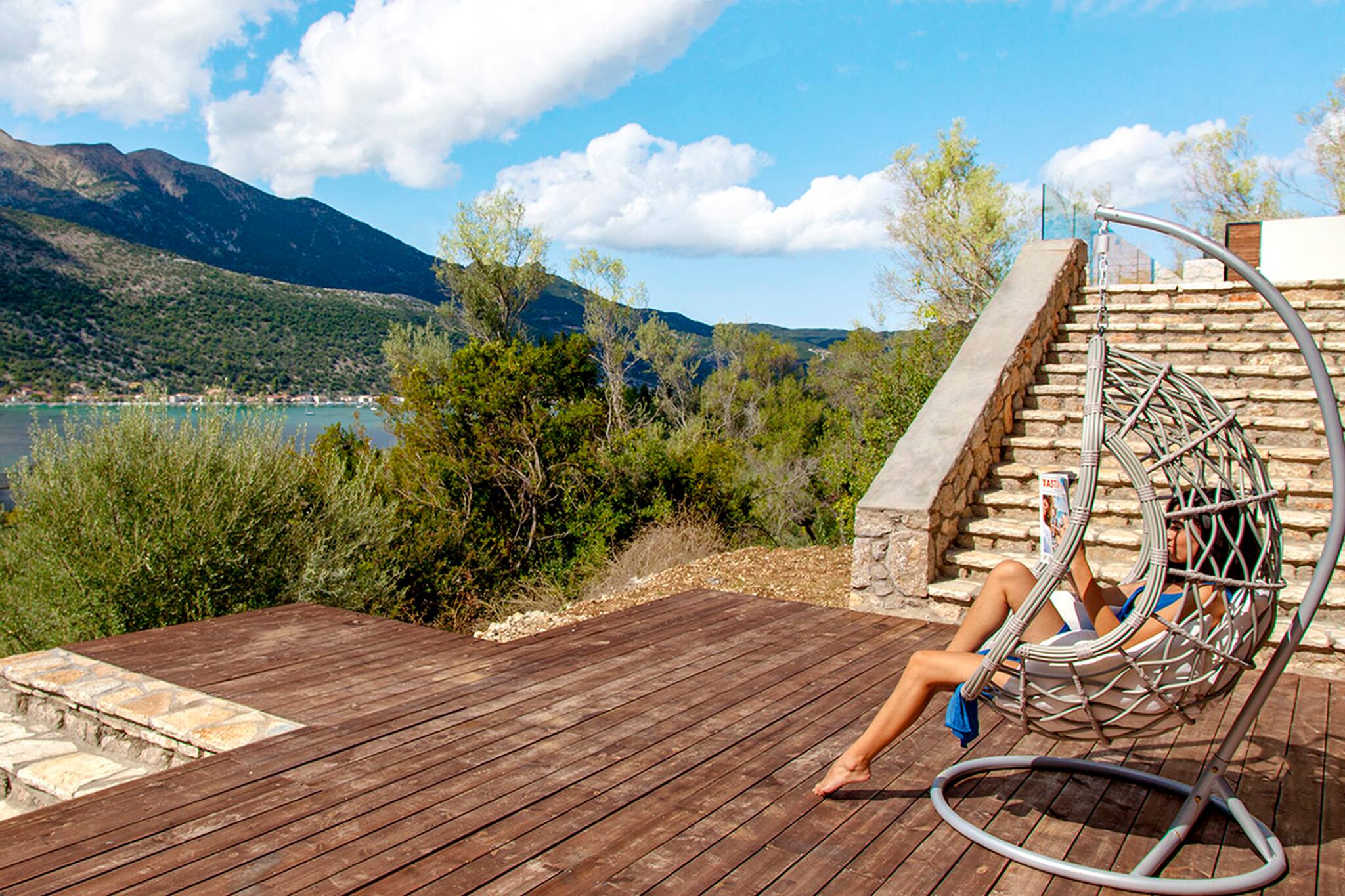 Its wooden and stone elements blend perfectly with the natural environment creating a unique setting for a true Greek Villa Holiday of relaxation and serenity