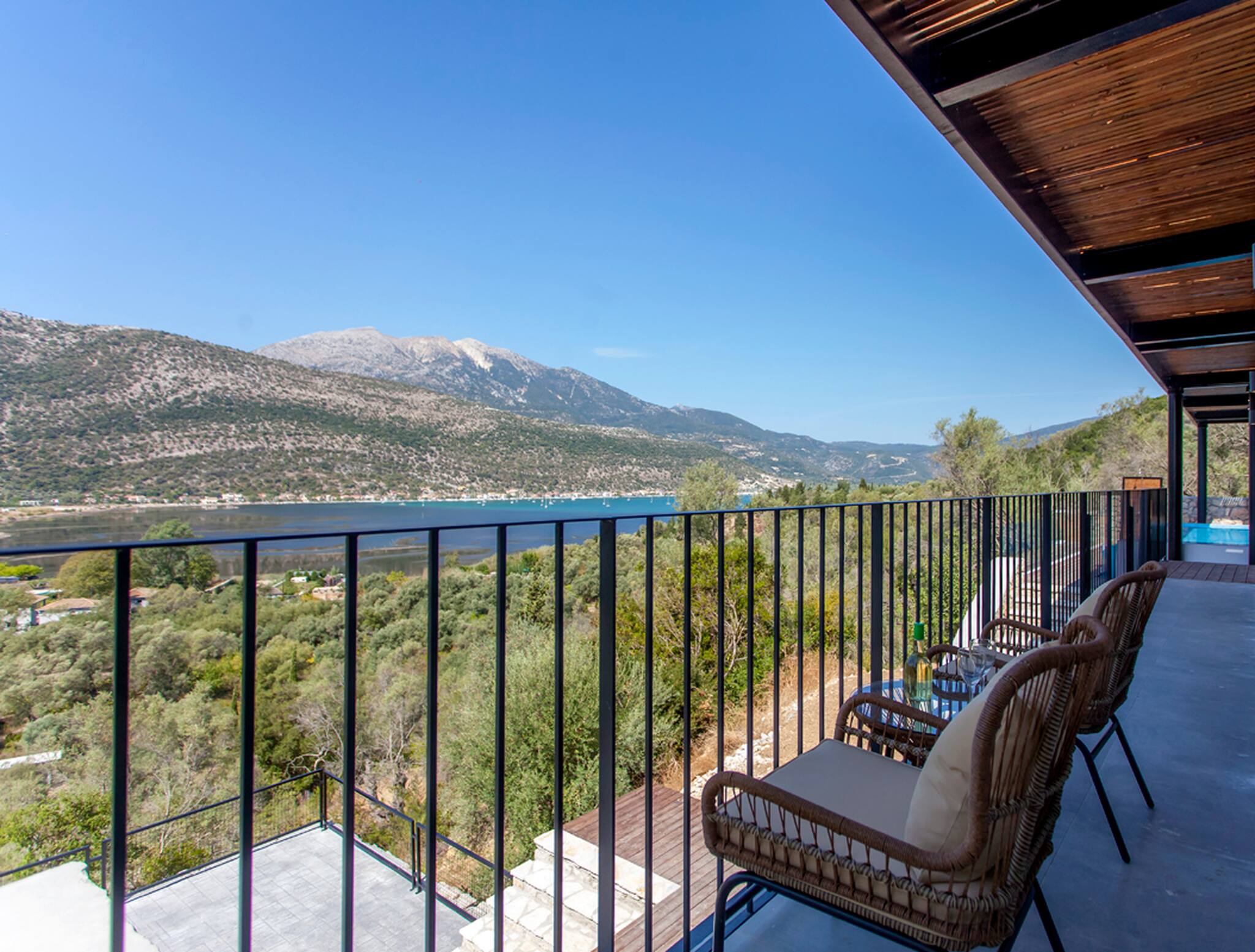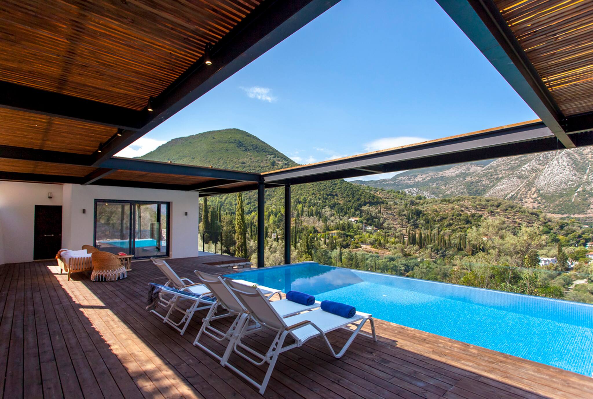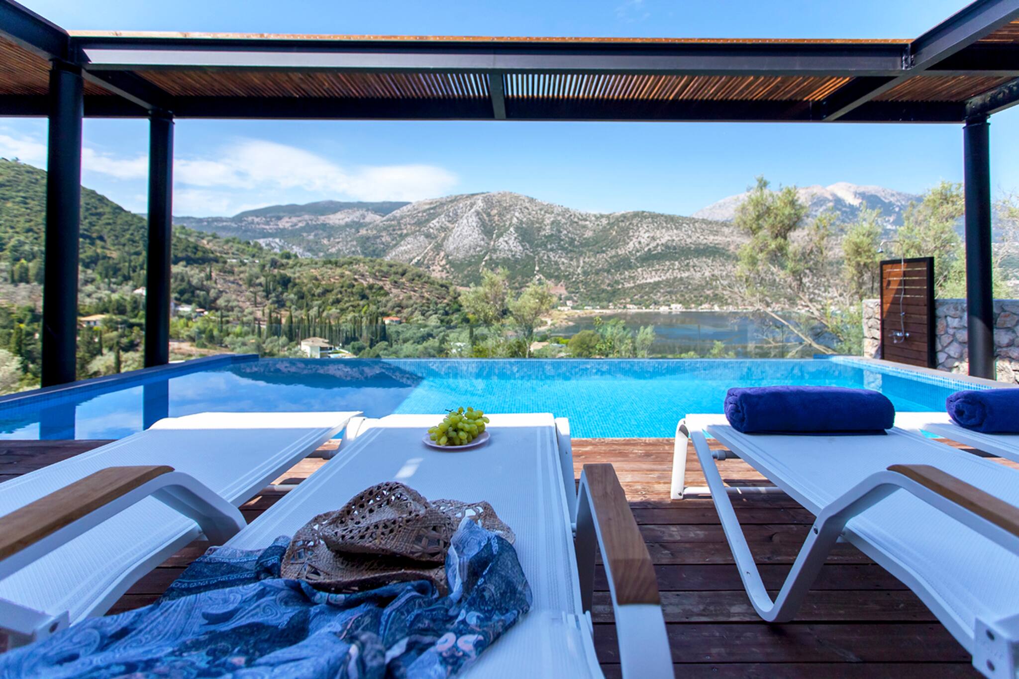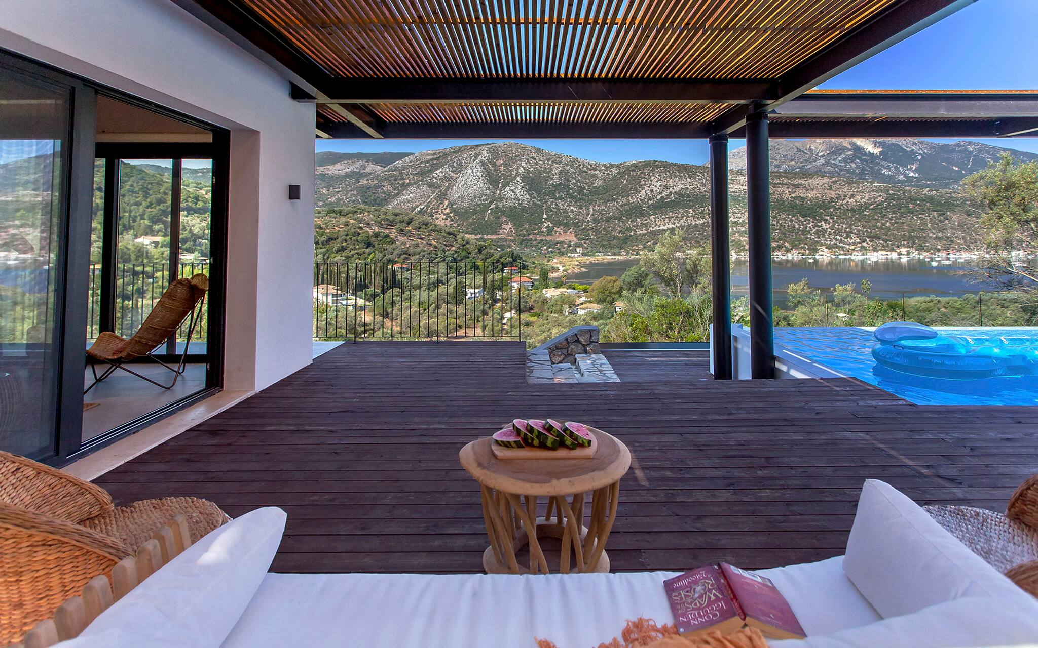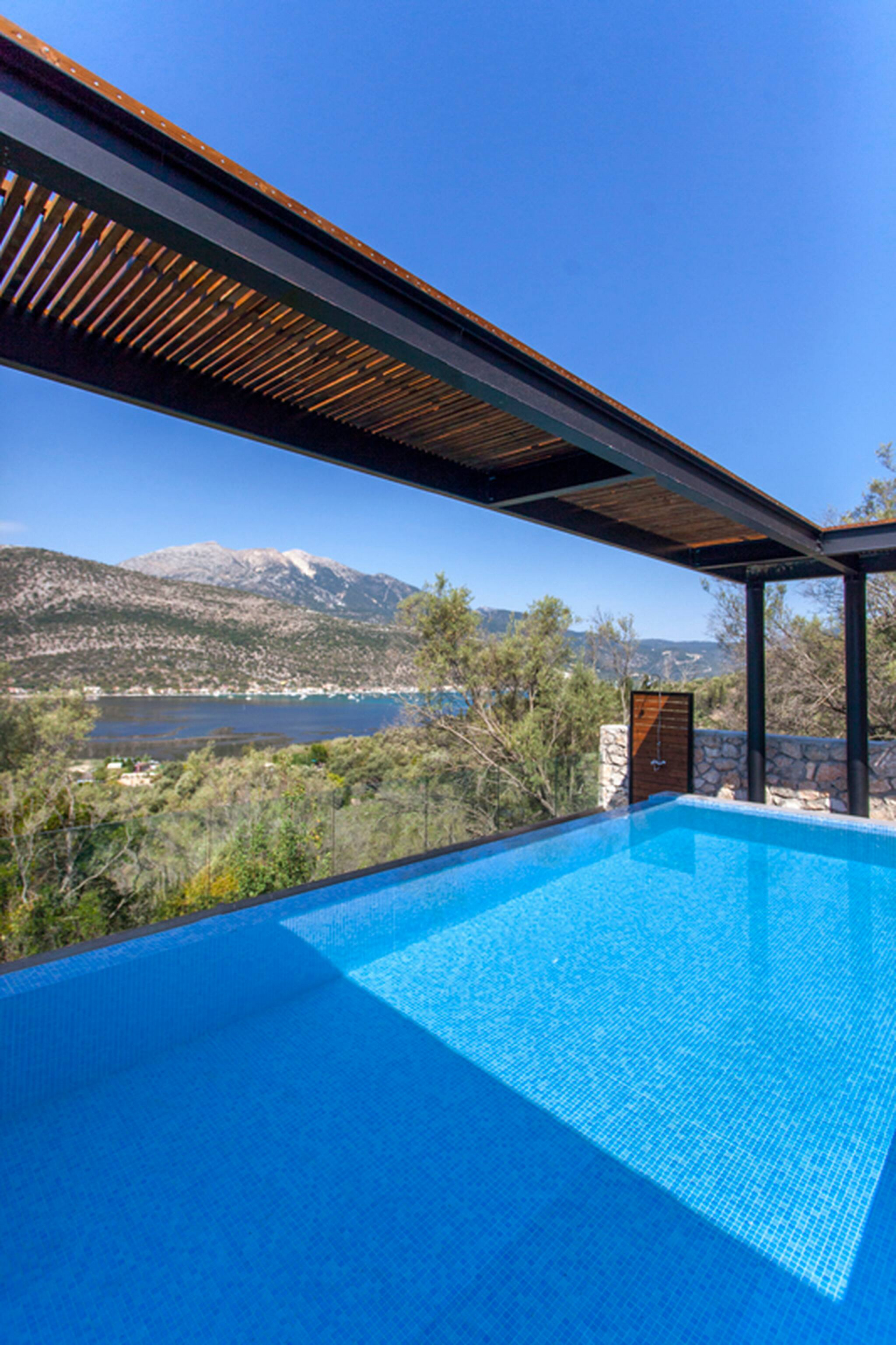 Running along the front of the ground level of the villa, is the main outdoor terrace of Villa Luca in Lefkada featuring a private pool with sea and mountain views. To one side of the house away from the pool is a fully equipped BBQ area with views of Dessimi Bay in the background. Around the private pool there is range of seating options, with sun-beds to soak up the Greek sun. The stand out feature of the outdoor area are the large metal columns and wooden beams of the pergola, creating a unique and stylish design which with the movement of the sun creates shade to give you those little corners to lay back and read your latest novel. Additionally the villa provides private parking. All in all, Villa Luca gives you everything and more of what you expect from a Greek Villa Holiday.