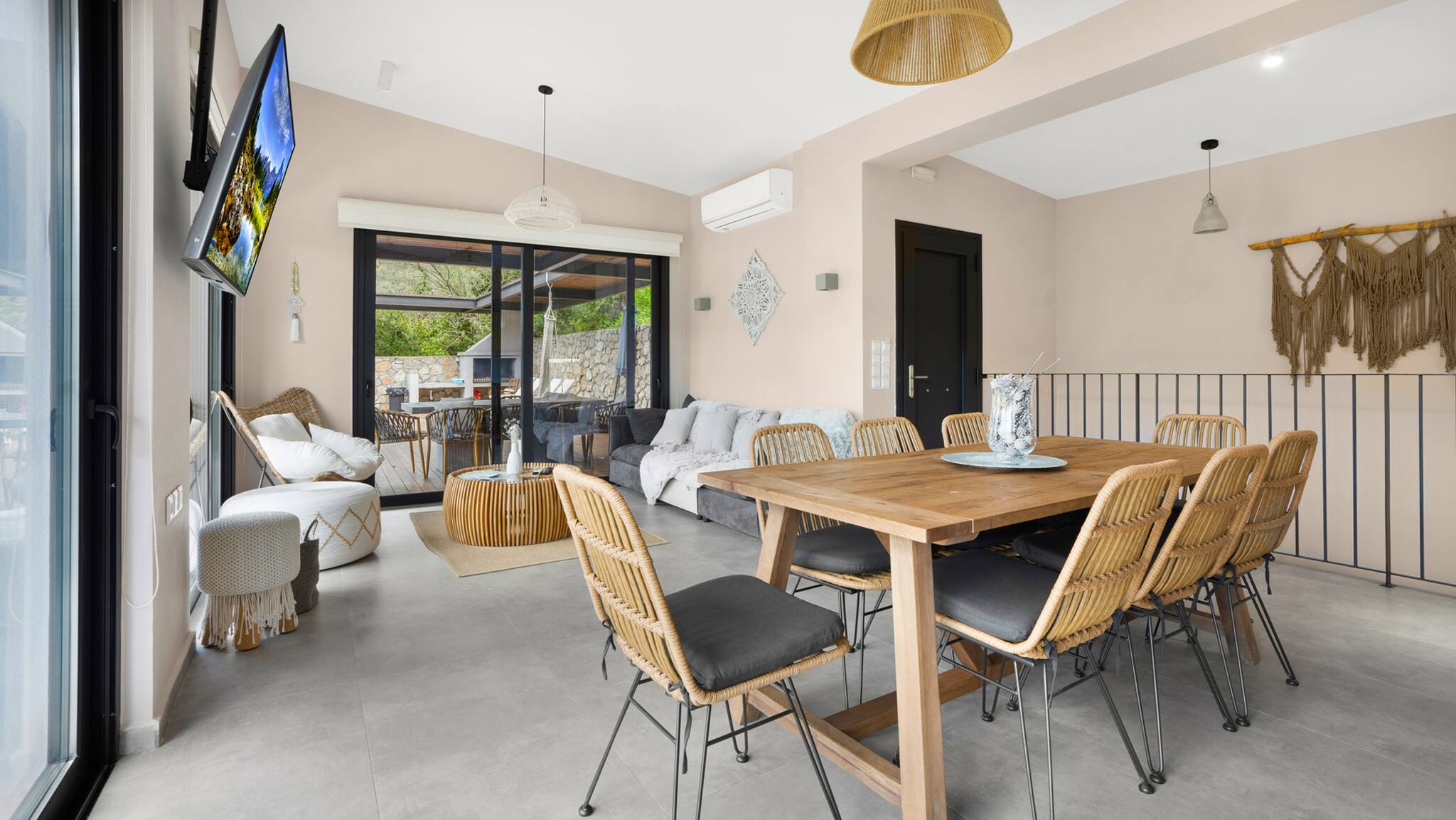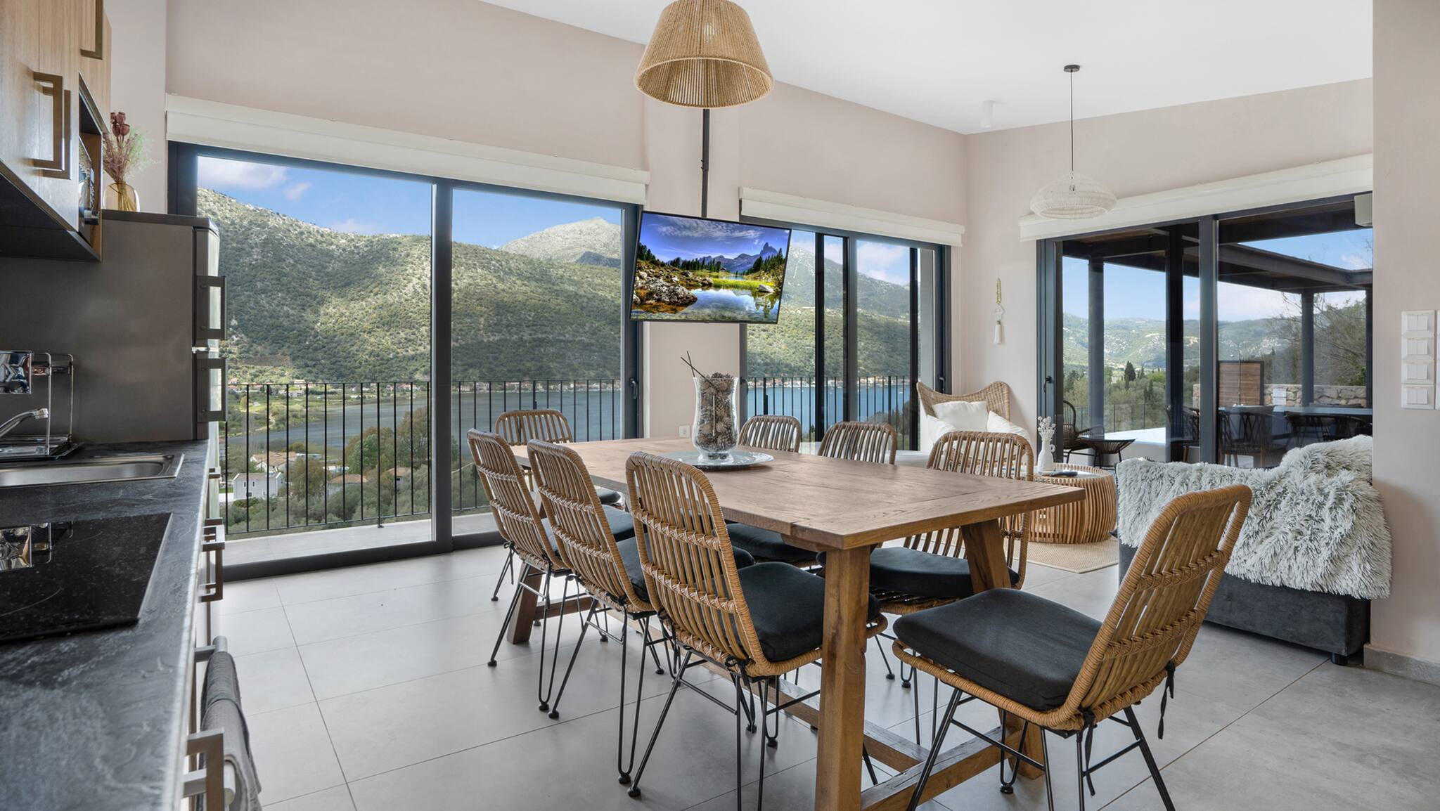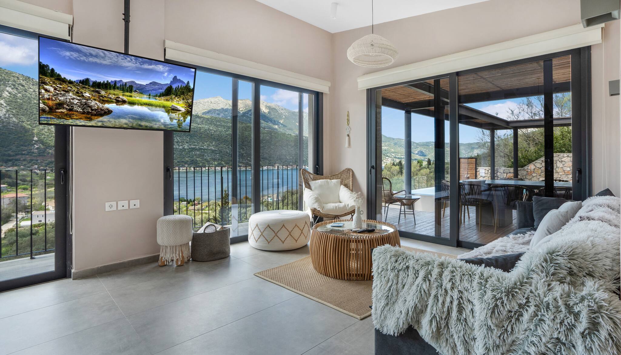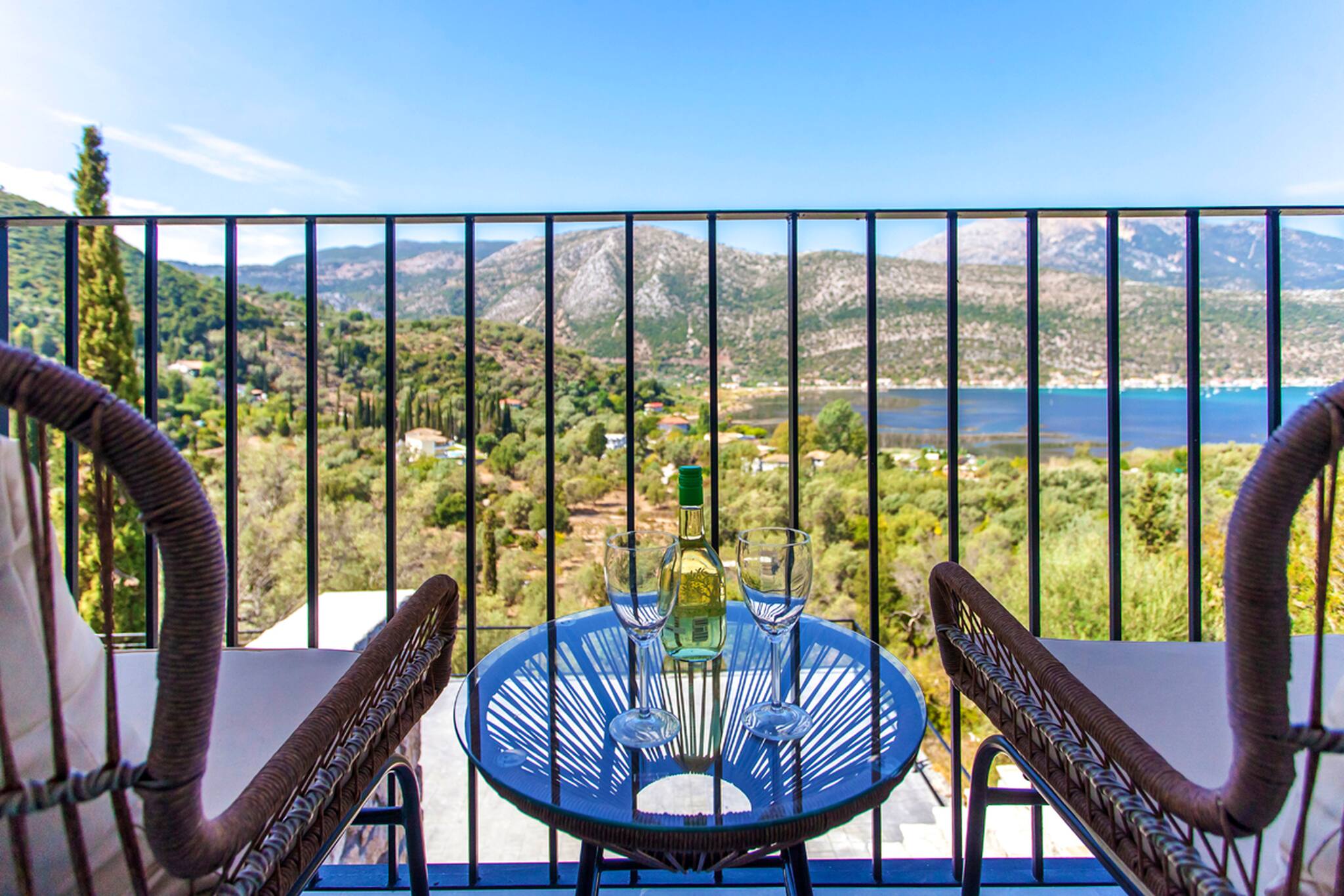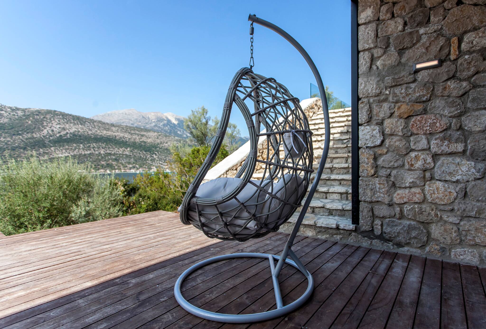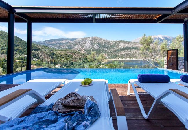 Running along the front of the ground level of the villa, is the main outdoor terrace of Villa Luca in Lefkada featuring a private pool with sea and mountain views. To one side of the house away from the pool is a fully equipped BBQ area with views of Dessimi Bay in the background. Around the private pool there is range of seating options, with sun-beds to soak up the Greek sun. The stand out feature of the outdoor area are the large metal columns and wooden beams of the pergola, creating a unique and stylish design which with the movement of the sun creates shade to give you those little corners to lay back and read your latest novel. Additionally the villa provides private parking. All in all, Villa Luca gives you everything and more of what you expect from a Greek Villa Holiday.