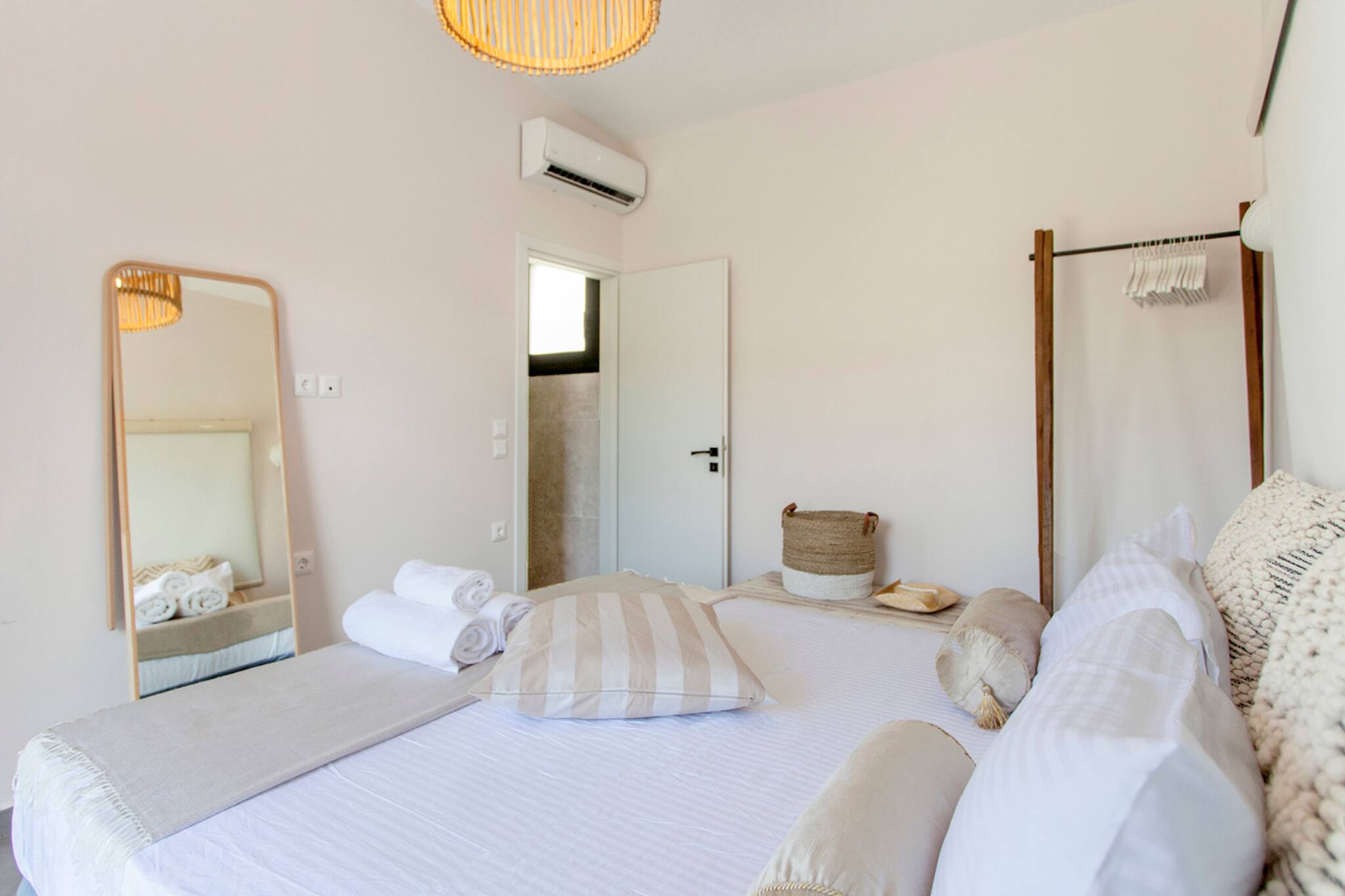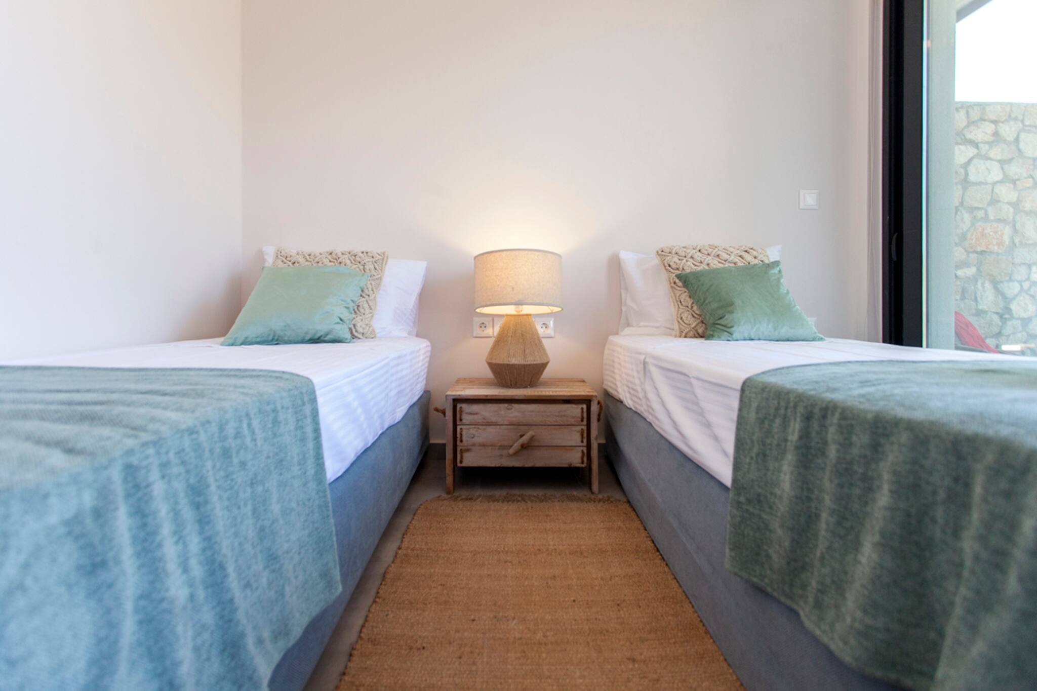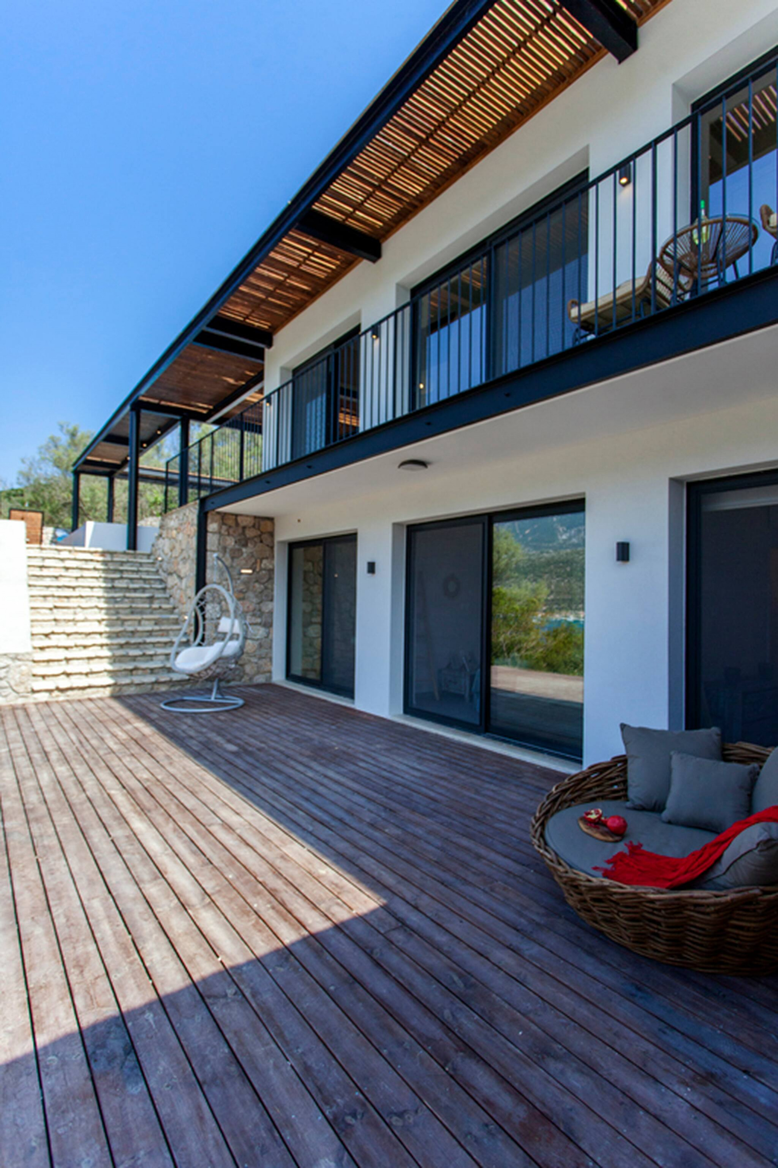 Villa Luca in Lefkada offers 4 bedrooms and 3 bathrooms, comfortably accommodating up to 8 guests. Villa Luca is 110 square meters in size and is laid out over two levels. The ground floor is set out with an open plan living area, fully equipped kitchen with sit down island and large sliding doors filling the space with natural light and creating an indoor-outdoor experience like no other. Additionally on the ground level of the villa is a large double bedroom with en-suite bathroom with a luxury of a private balcony to soak up the mountain and sea views. Via internal staircase you move down to the lower level of Villa Luca where you will find the other three bedrooms. There are two twin bedrooms both with private access to the outdoor deck area. The double bedroom on the lower level consists of an en-suite bathroom, also giving you direct access to the outdoor deck area. In the hallway of the lower ground level is a family bathroom.