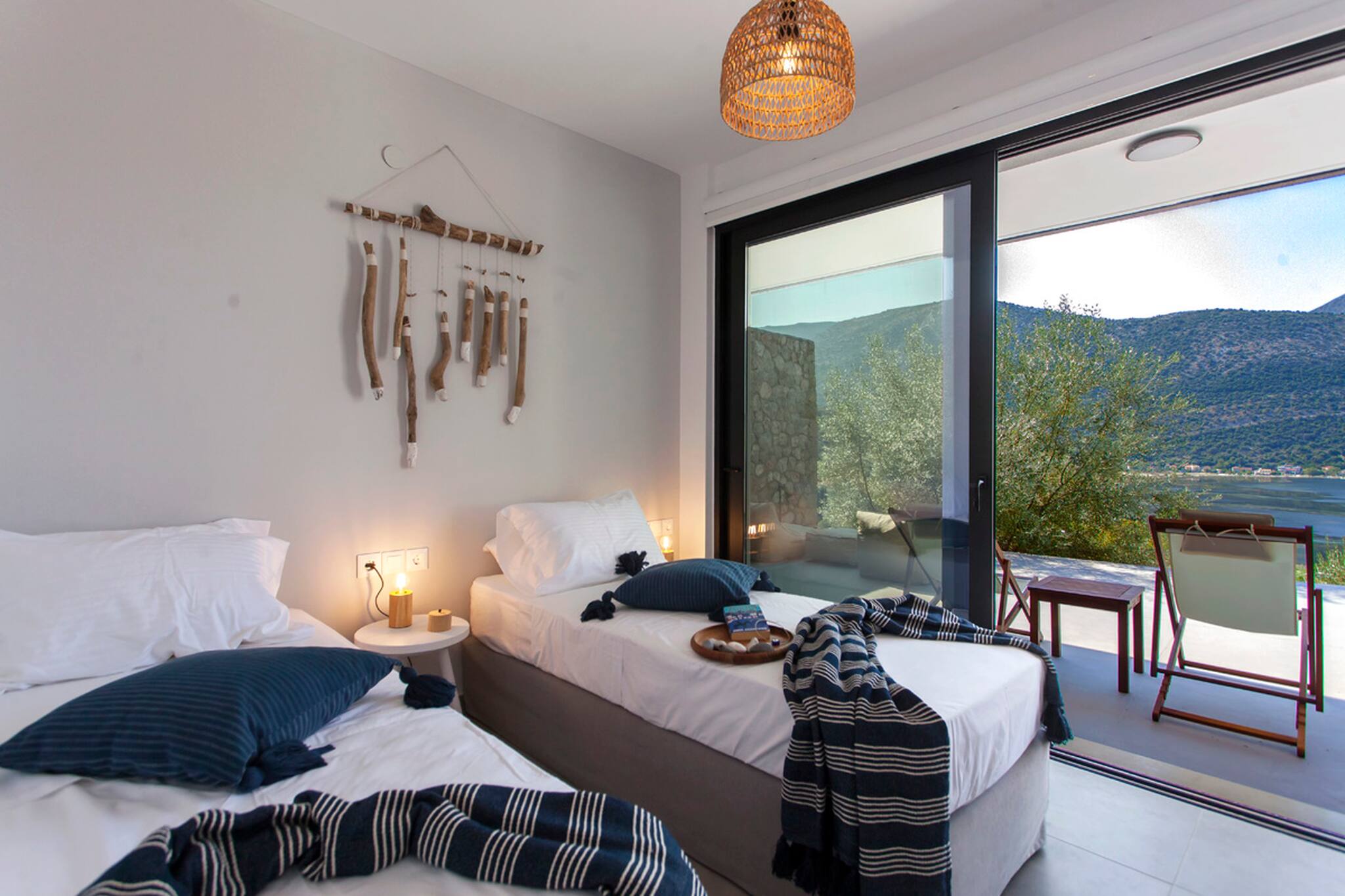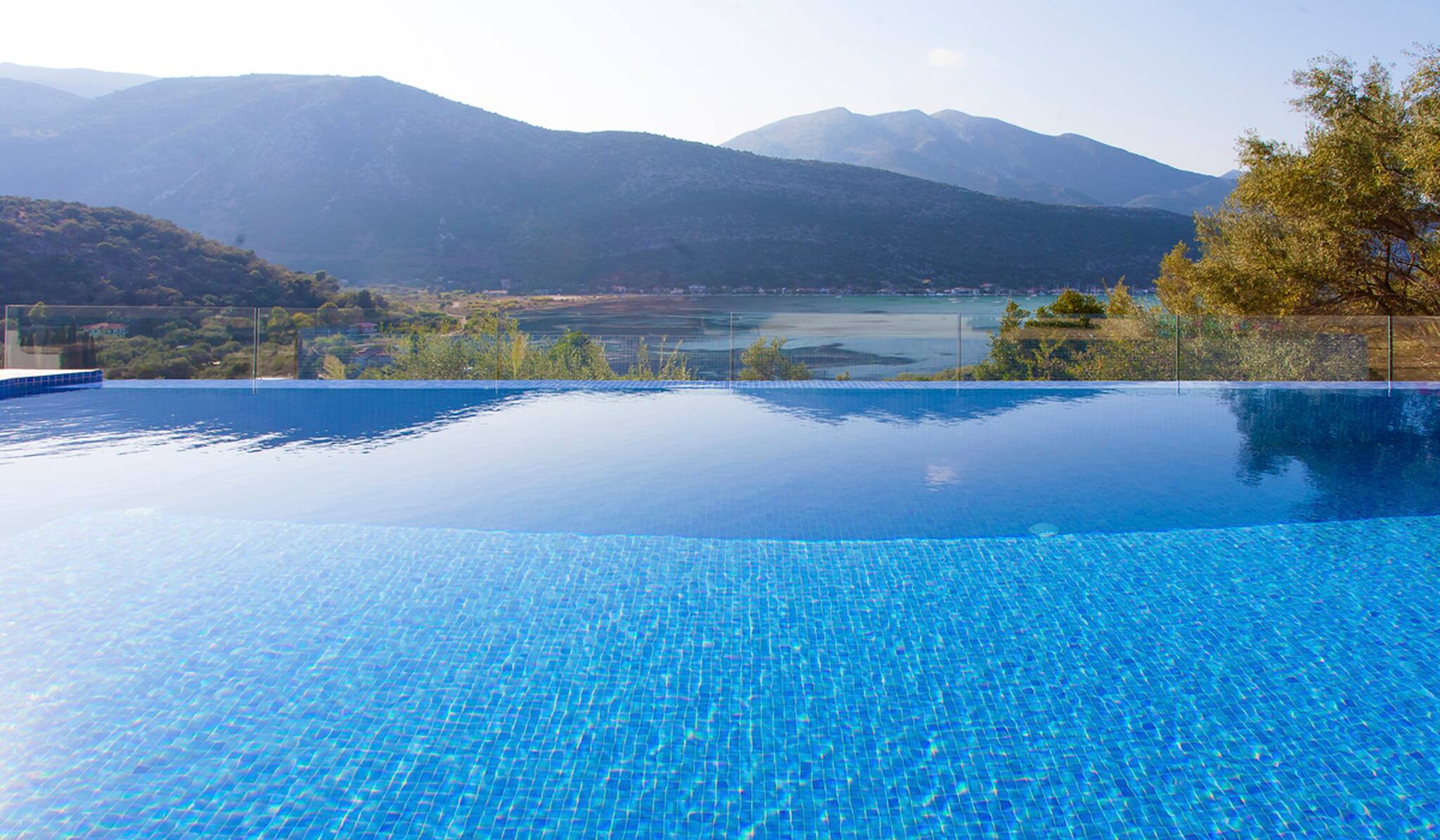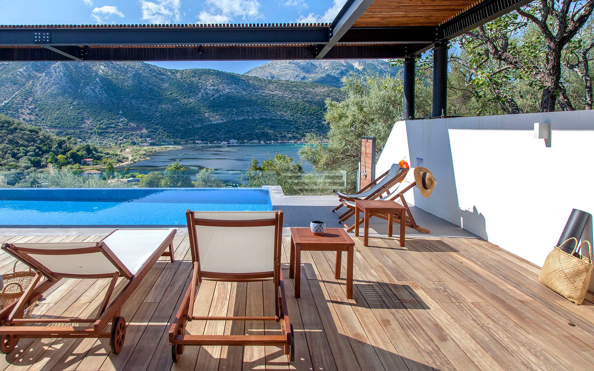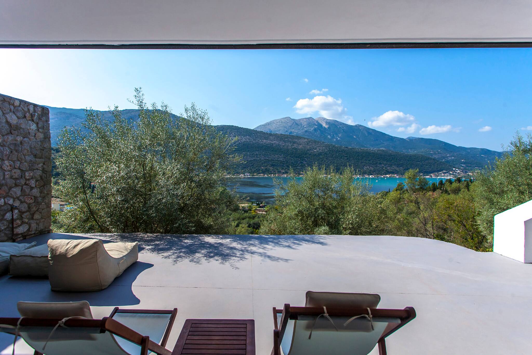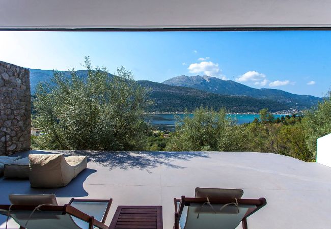 Villa Theia in Lefkada is nestled amidst olive trees overlooking two breath-taking brilliant-blue bays of the Ionian Sea.