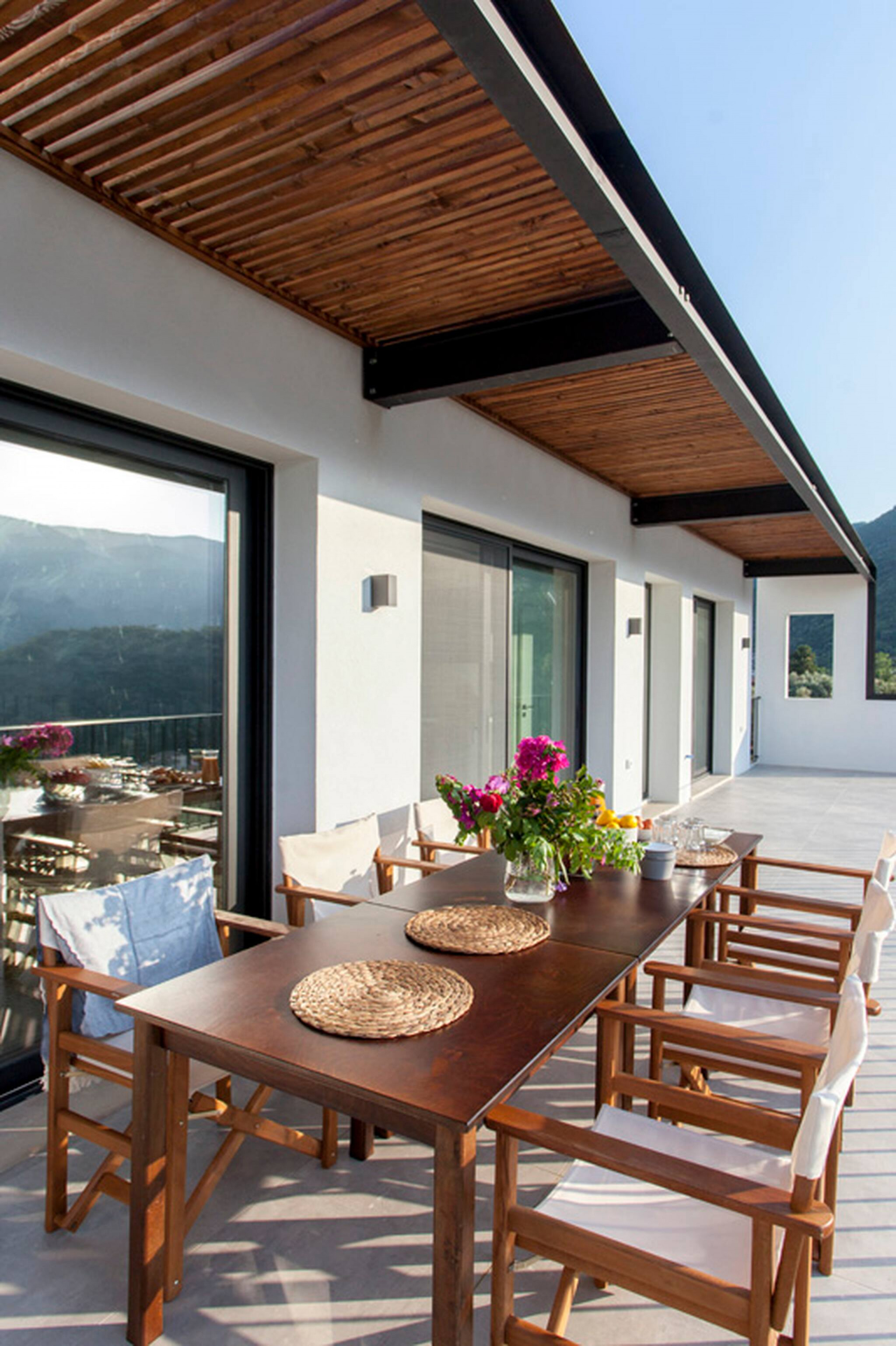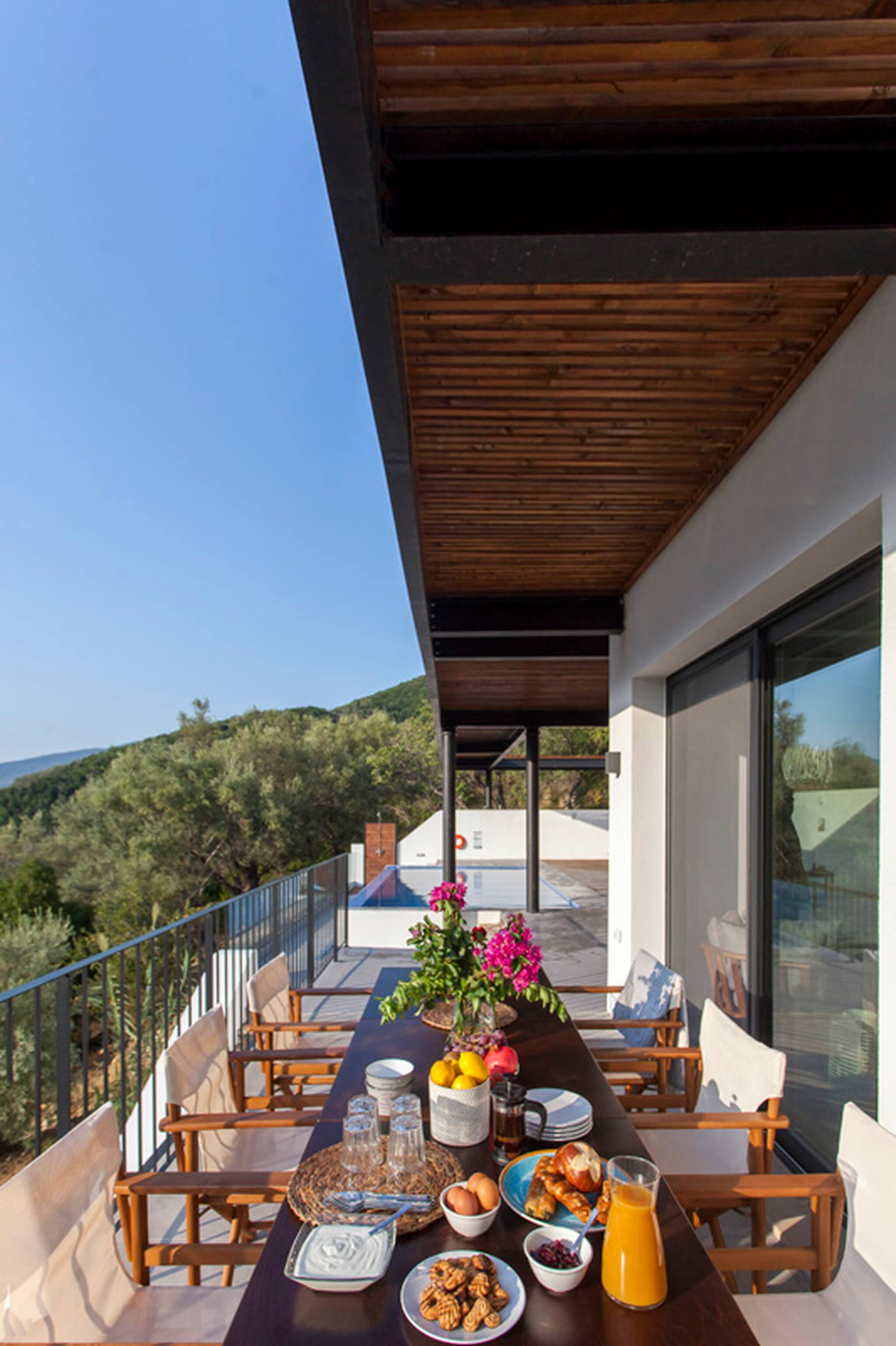 Villa Theia comprises and features a range of outdoor areas to accommodate every request and every need. Running along the front of the ground level of the villa, is the main outdoor terrace of Villa Theia featuring a private pool with sea and mountain views. To one side of the house away from the pool is a fully equipped BBQ area with views of Desimi Bay. Around the private pool there is range of seating options, with sun loungers to soak up the Greek sun.