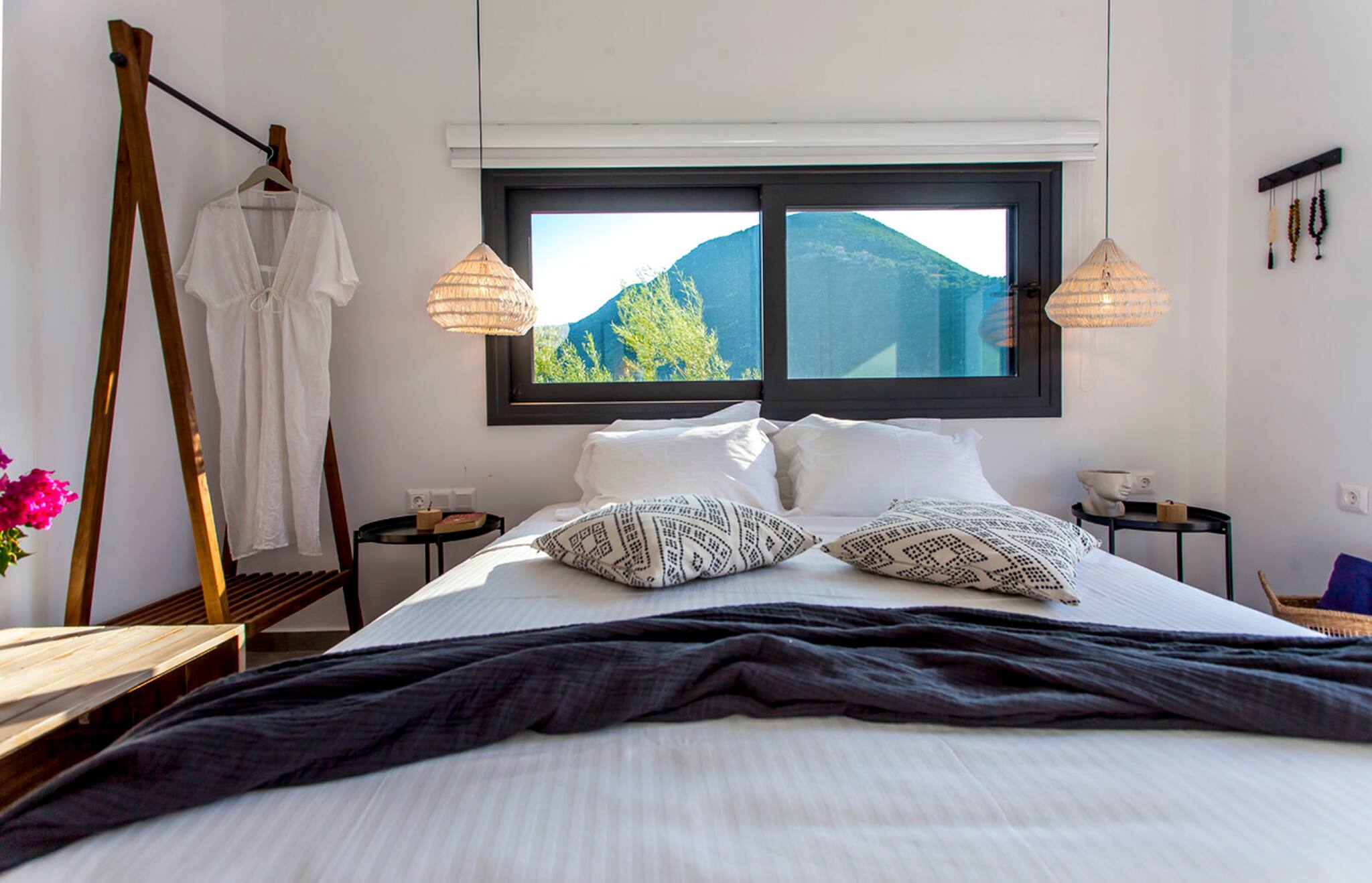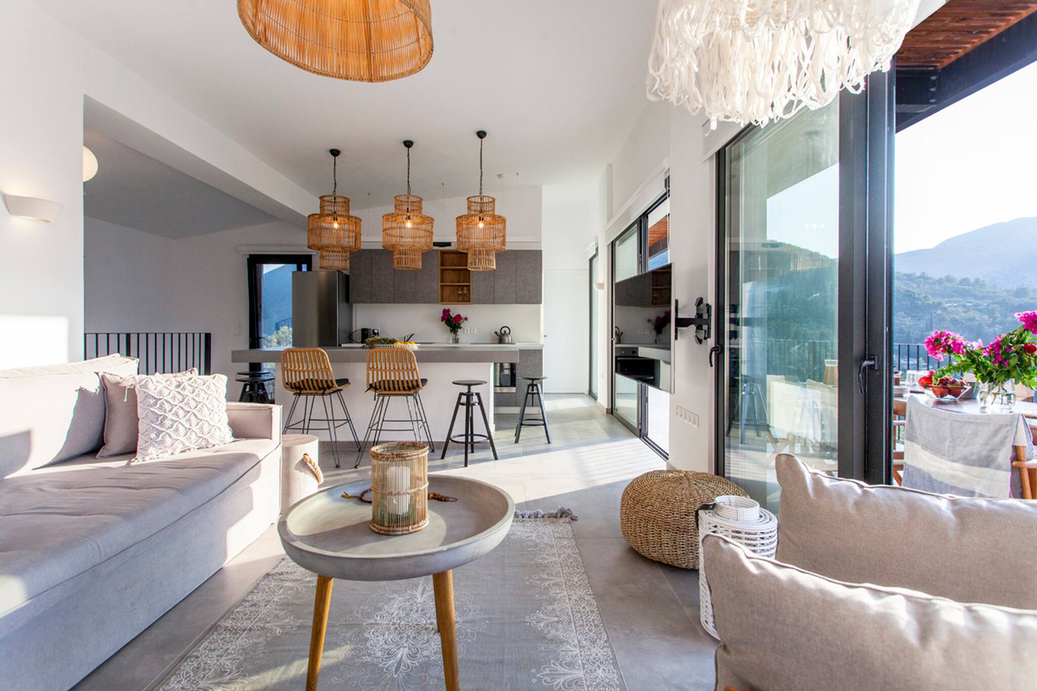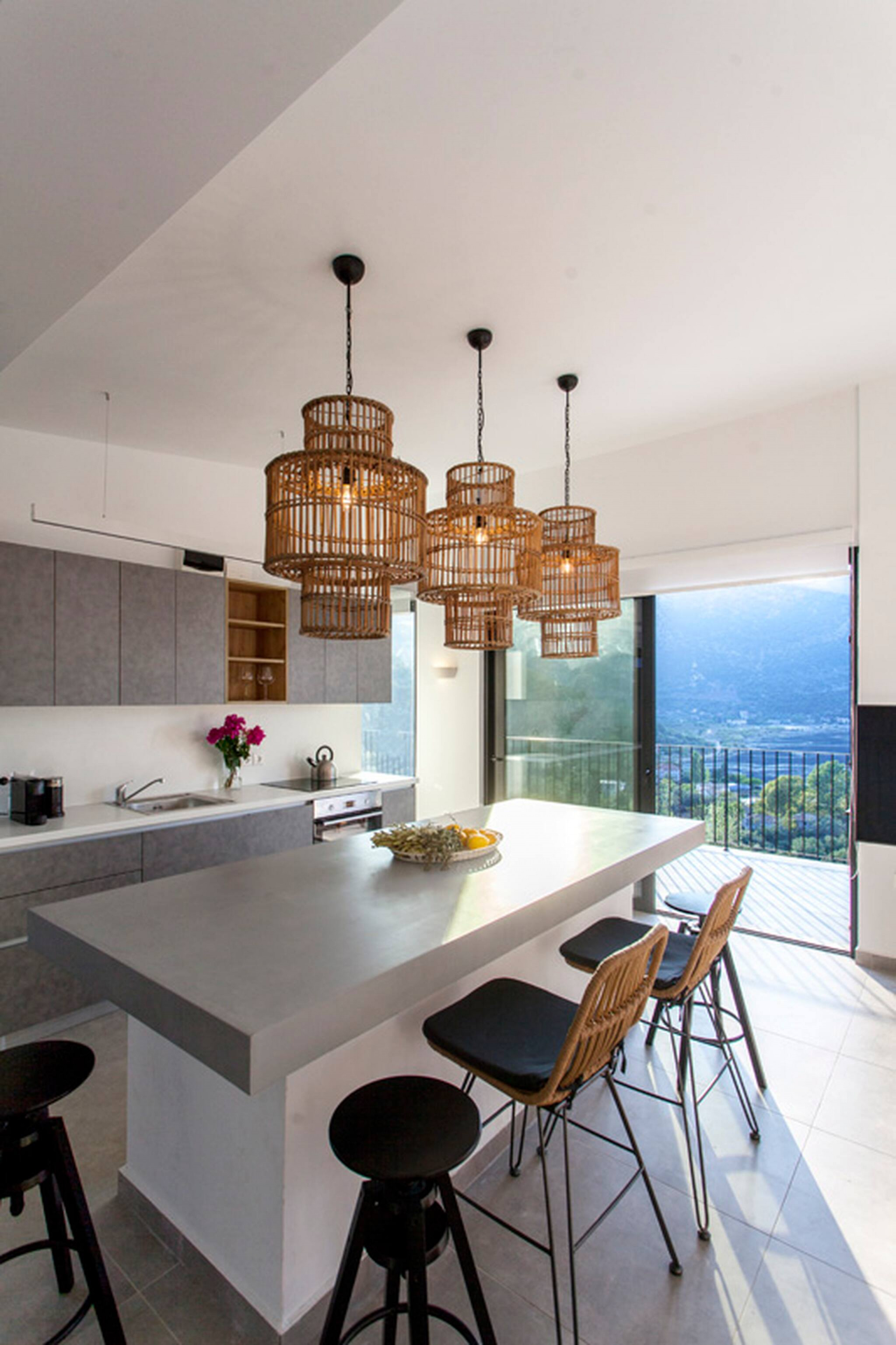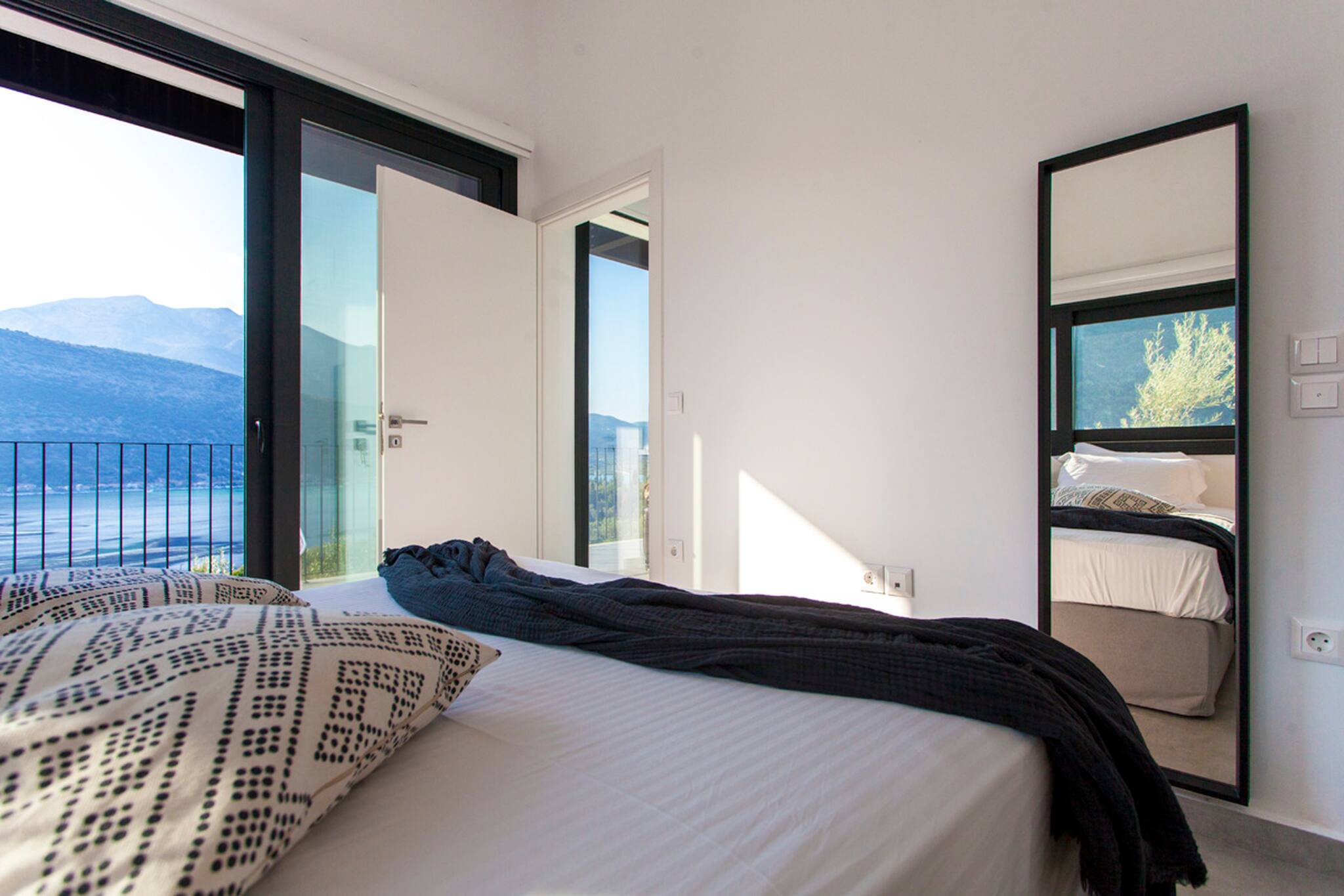Villa Theia is 120 square meters in size and is laid out over two levels. Upon entering from the ground level floor, you are welcomed by an open plan living area consisting of a lounge area and fully equipped kitchen with a sit down island. The large sliding window doors fill the space with natural light and creating an indoor-outdoor experience like no other. Additionally on the ground level of the villa is a large double bedroom with en-suite bathroom. This space also is filled with natural light and the convenience of a private balcony overlooking Vlicho Bay.