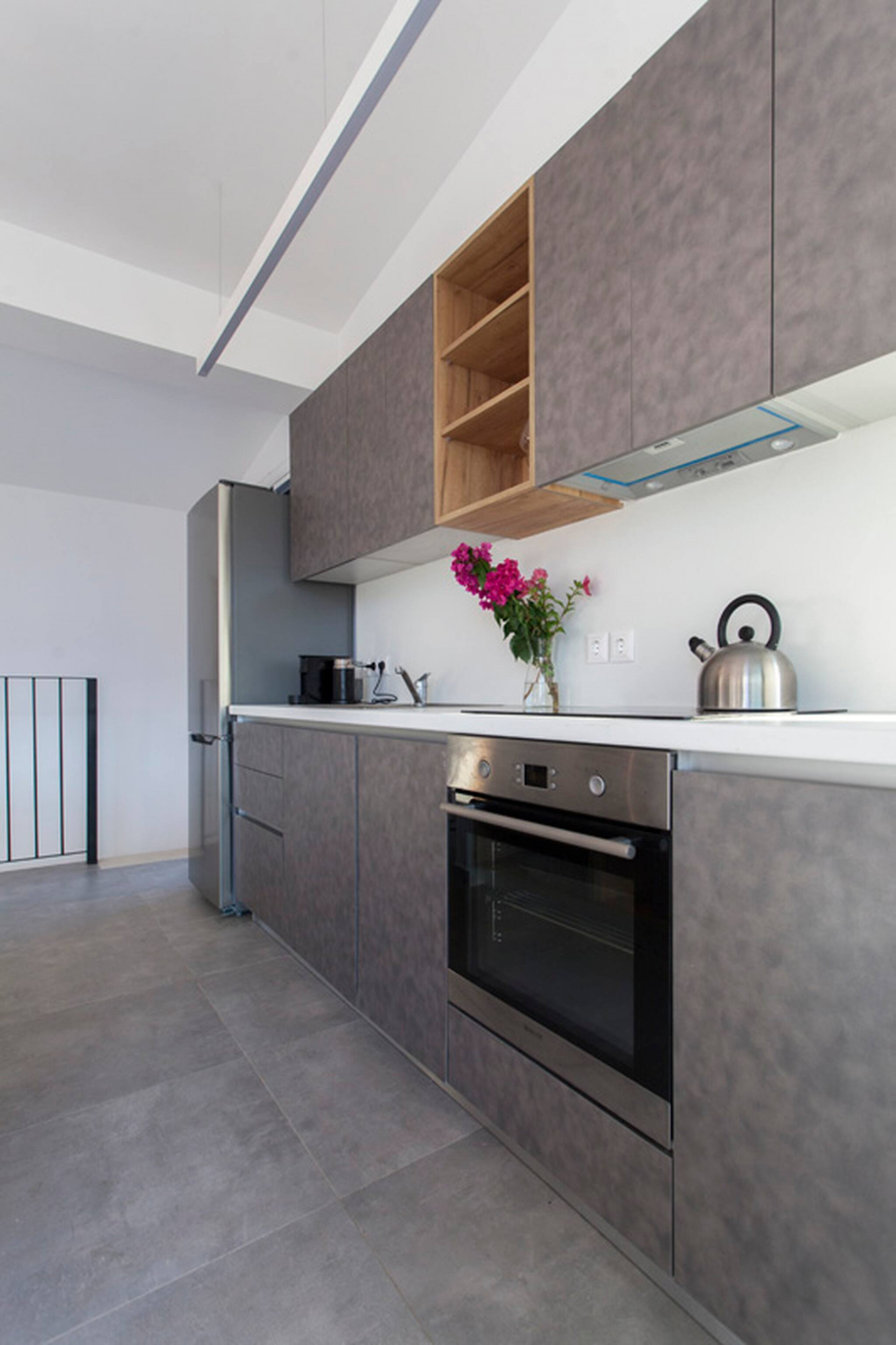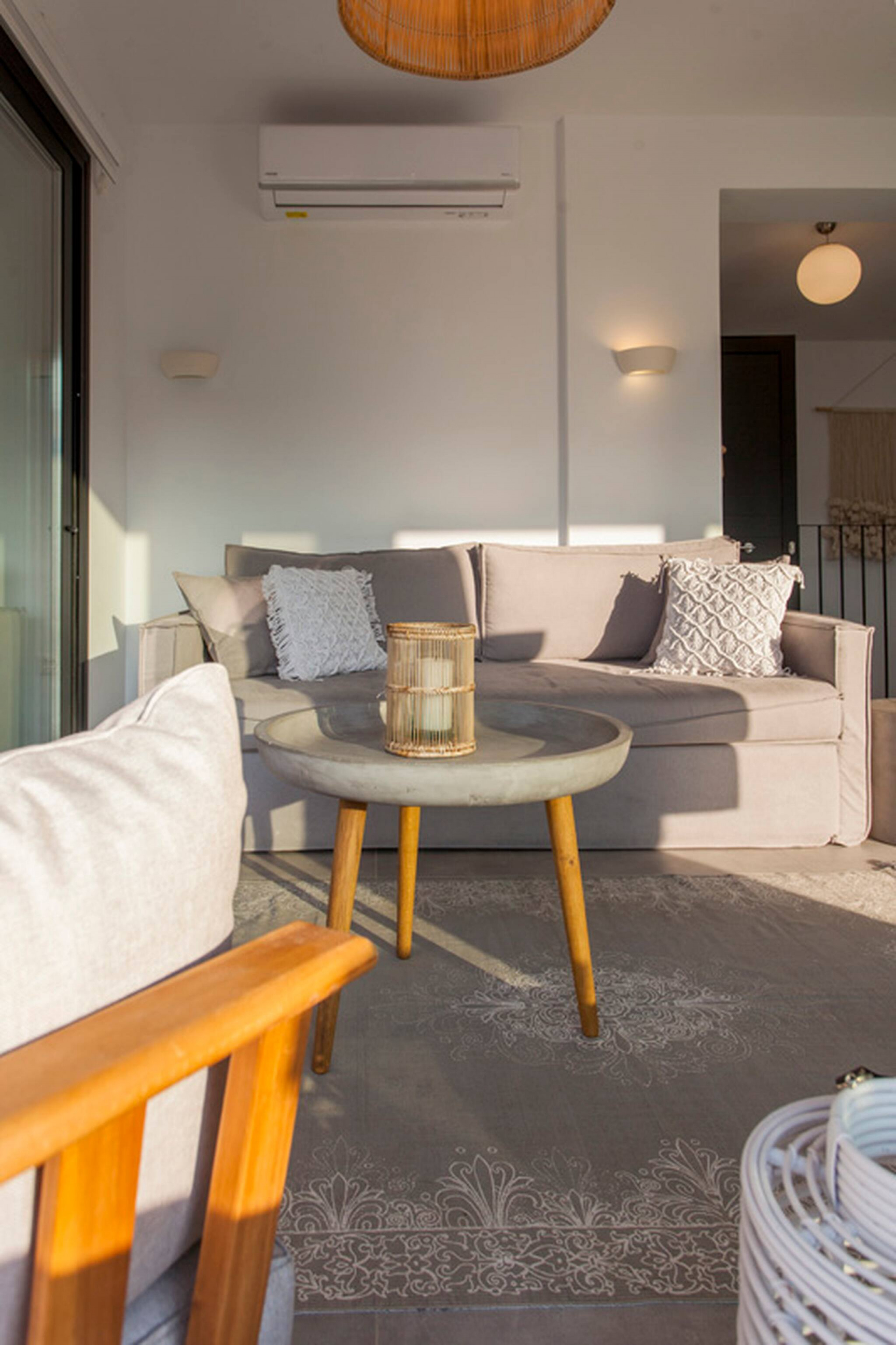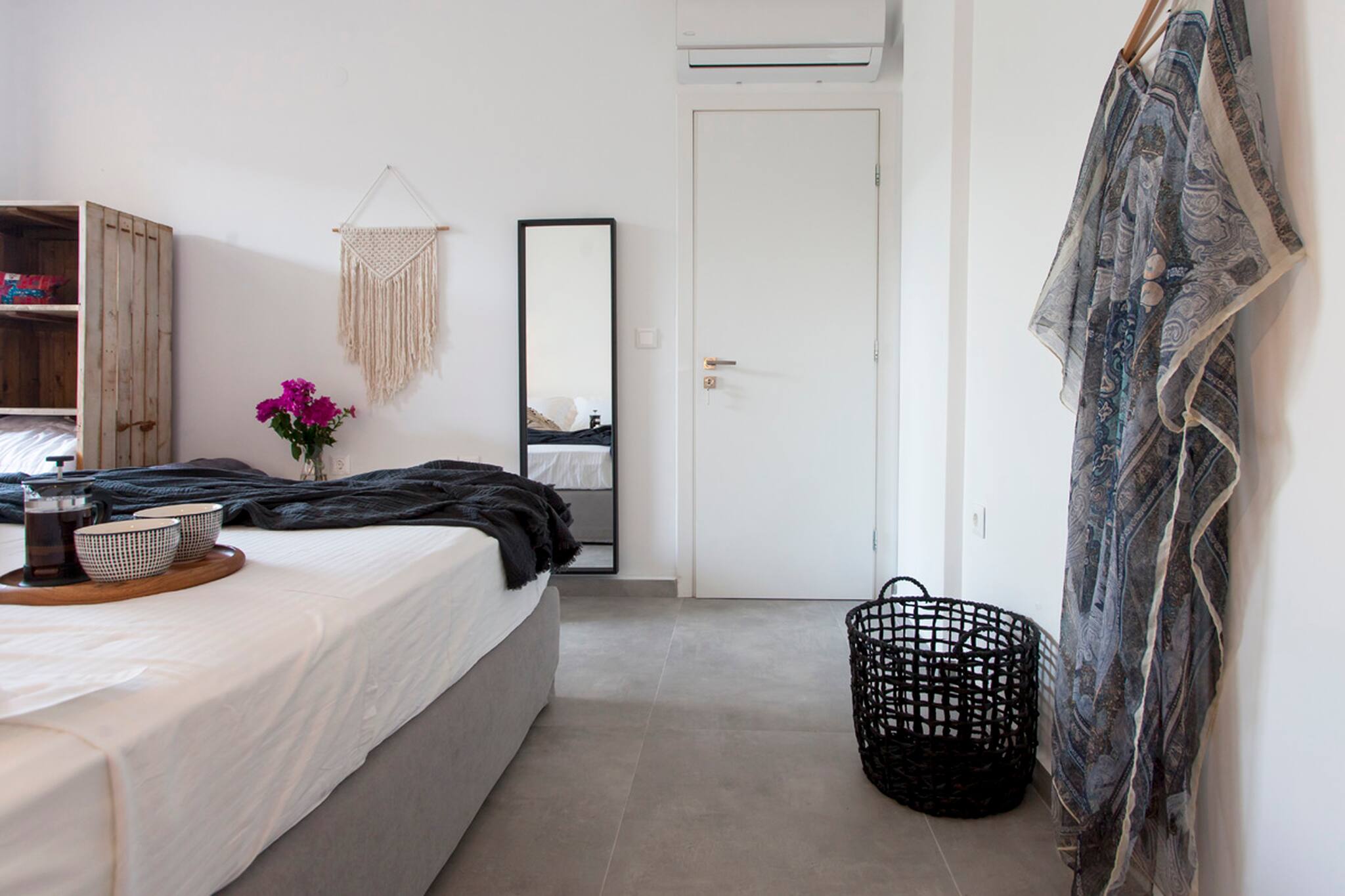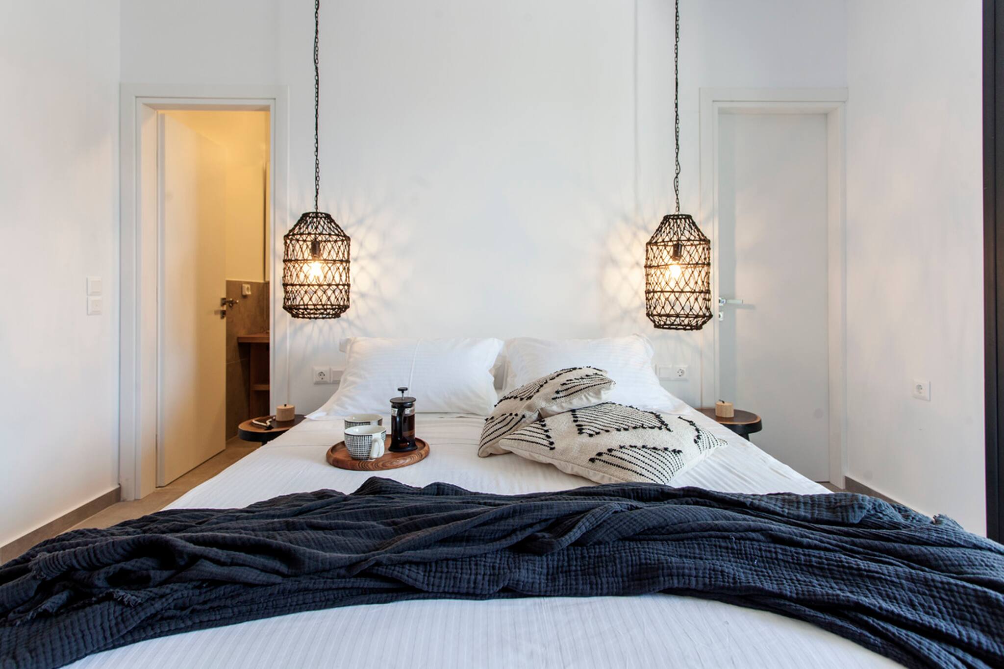 Villa Theia is 120 square meters in size and is laid out over two levels. Upon entering from the ground level floor, you are welcomed by an open plan living area consisting of a lounge area and fully equipped kitchen with a sit down island. The large sliding window doors fill the space with natural light and creating an indoor-outdoor experience like no other. Additionally on the ground level of the villa is a large double bedroom with en-suite bathroom. This space also is filled with natural light and the convenience of a private balcony overlooking Vlicho Bay.