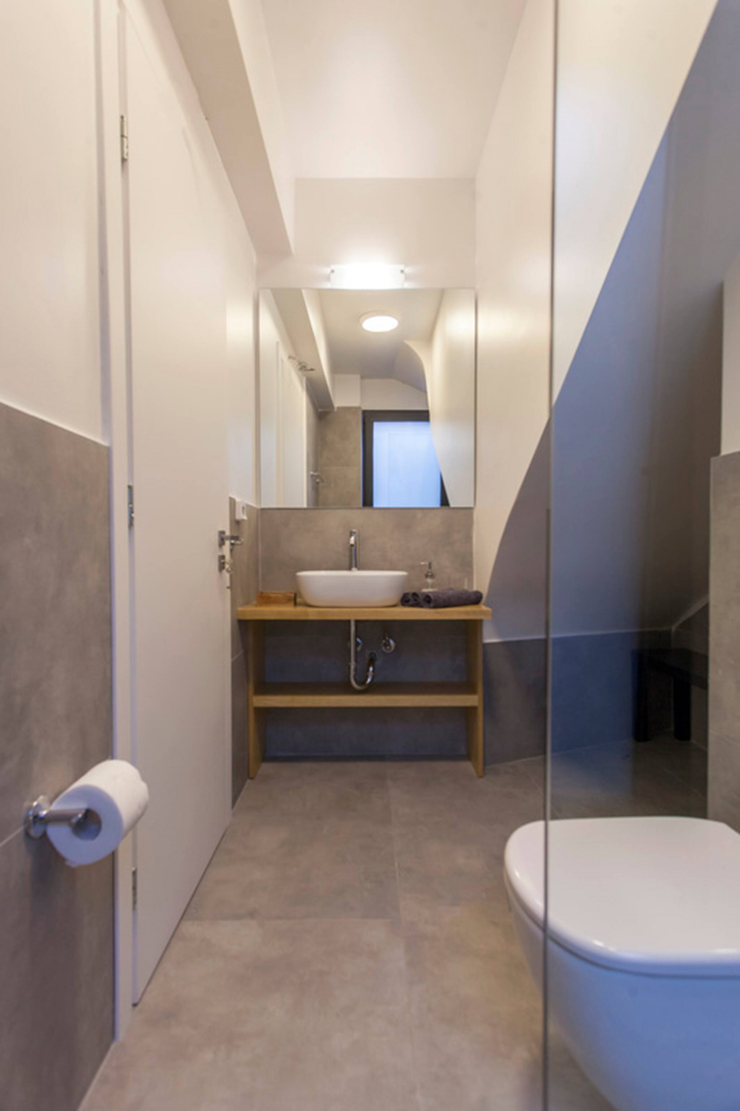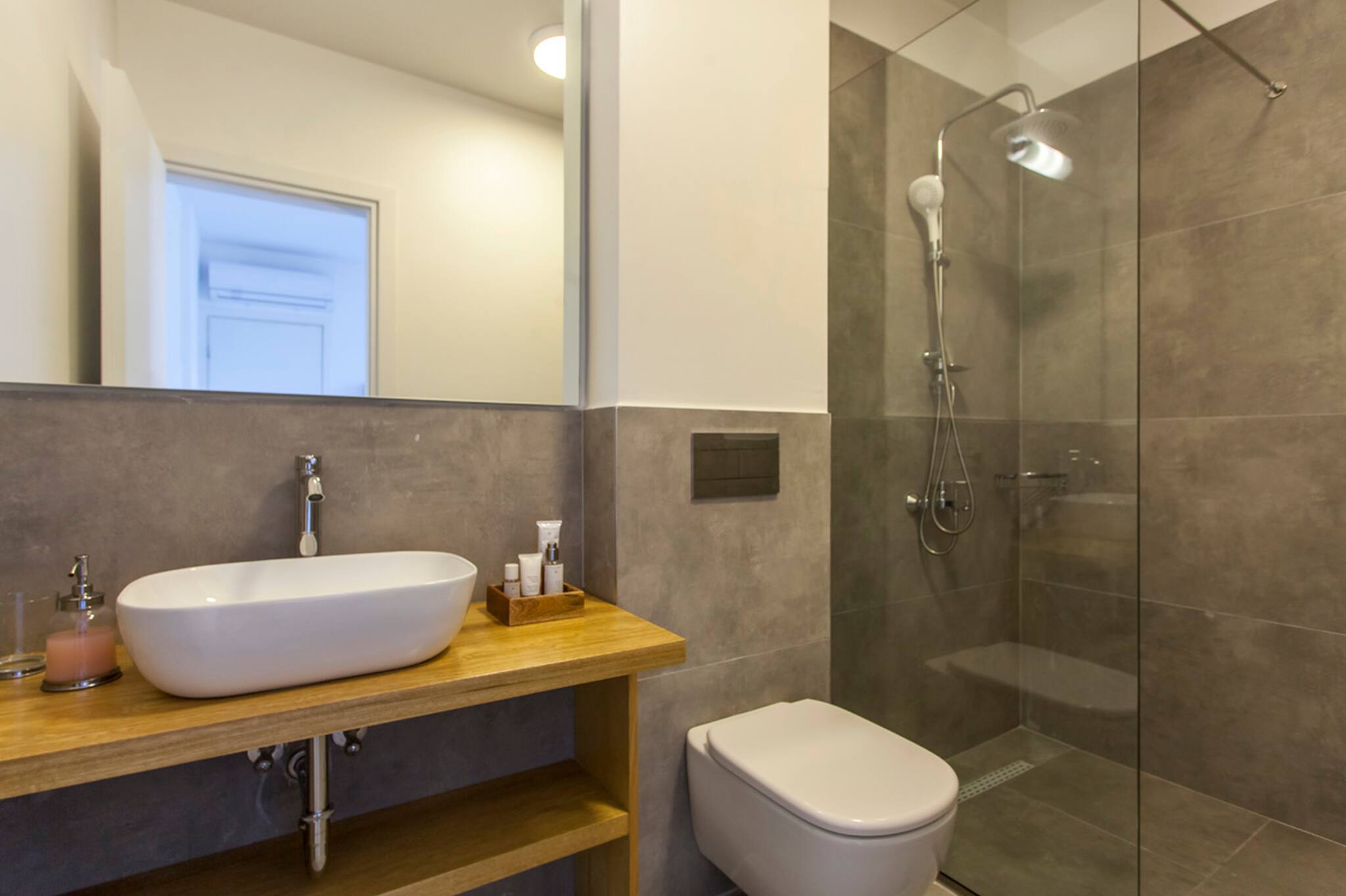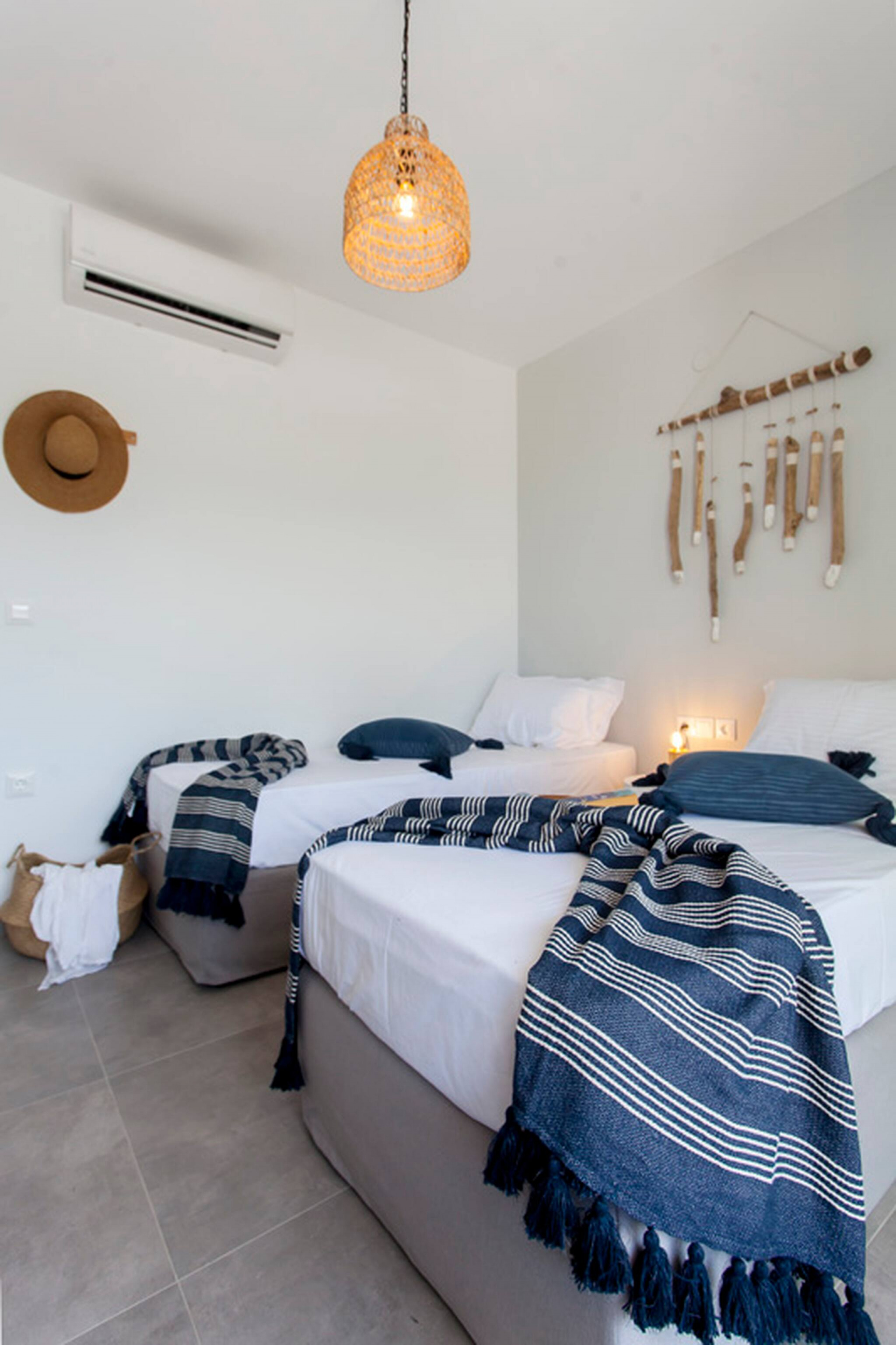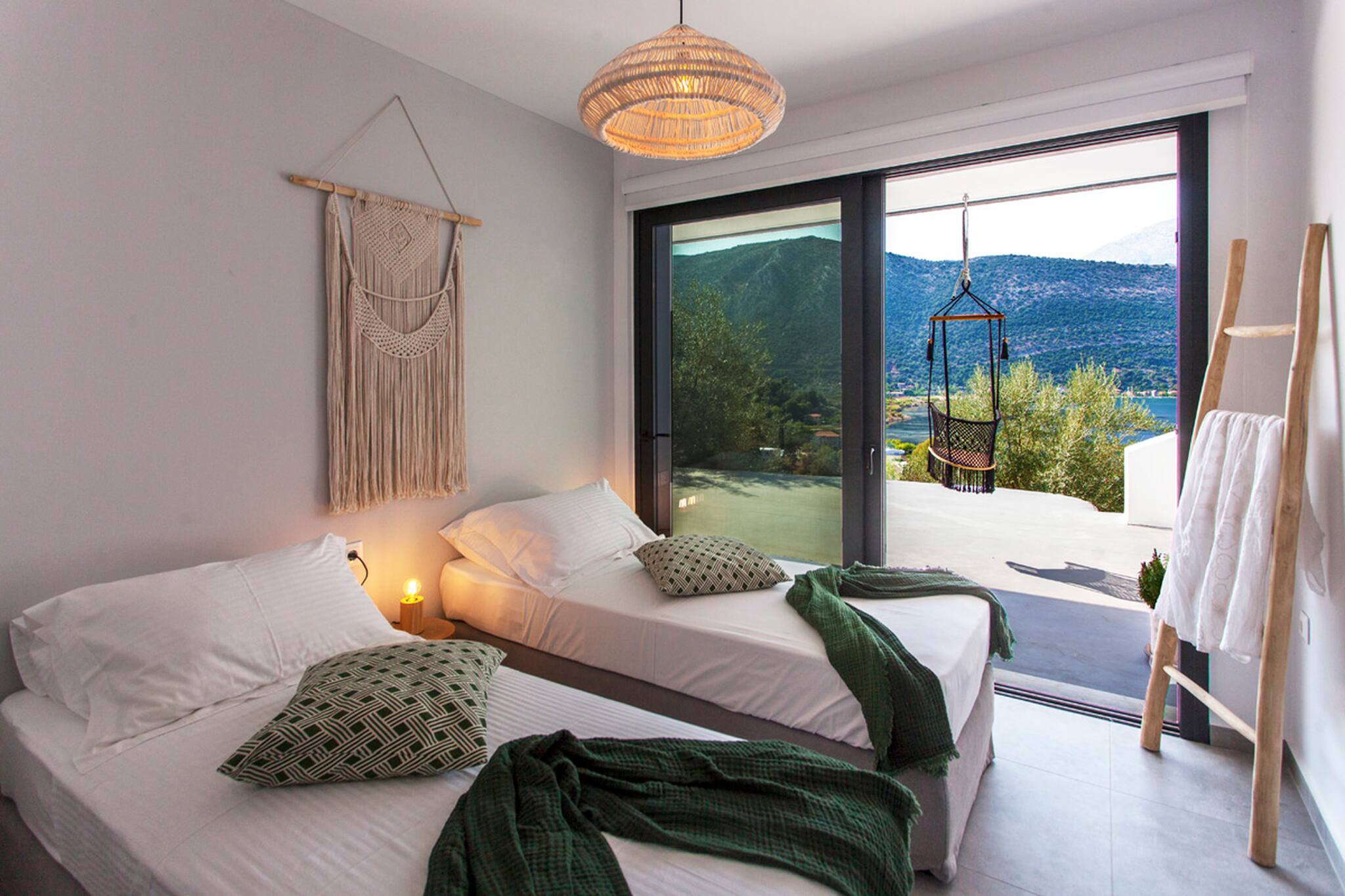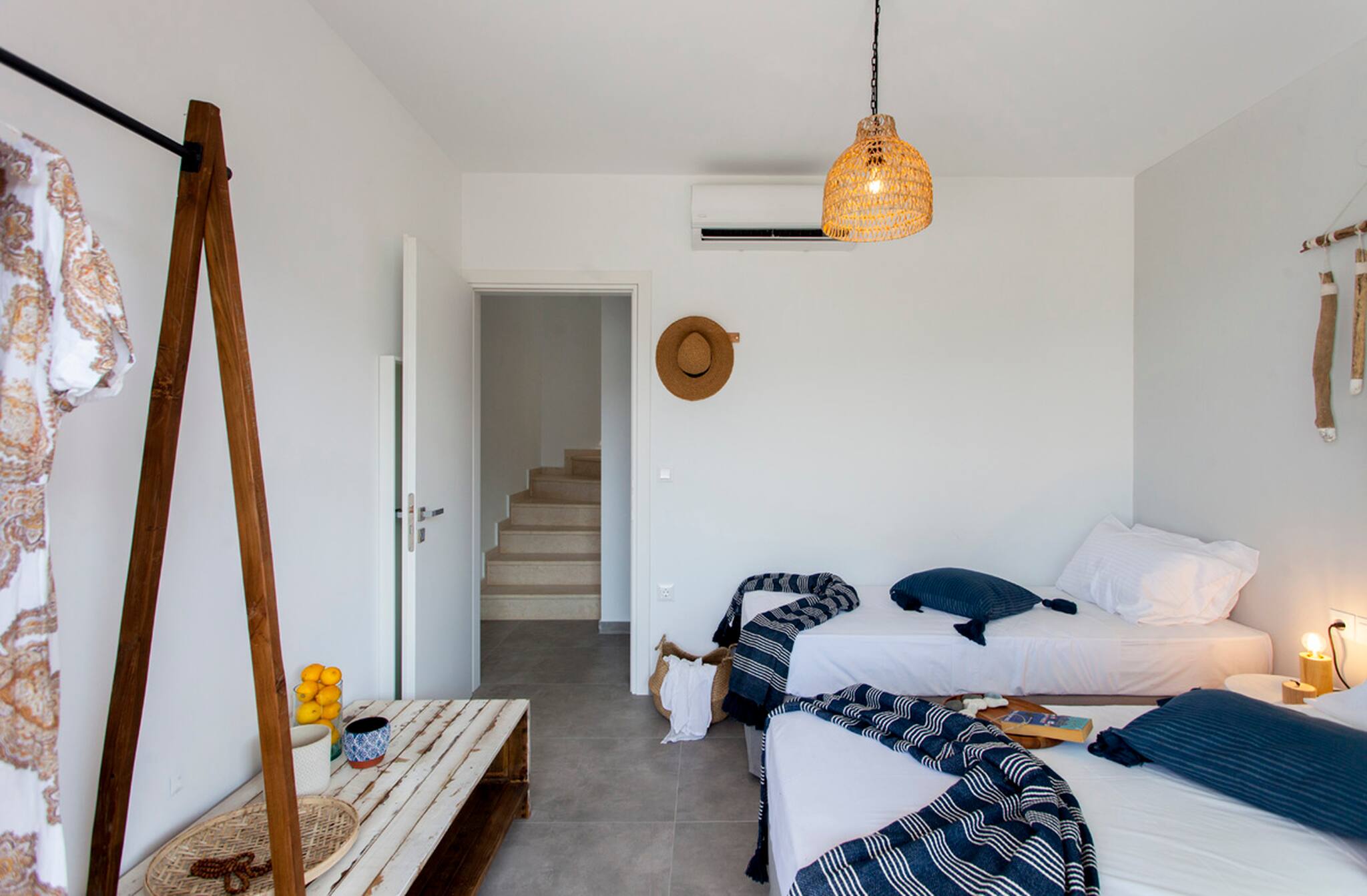 Via internal staircase you move down to the lower level of Villa Theia where you will find the other three bedrooms. There are two twin bedrooms both with private access to the outdoor lower-level area. The twin beds can also be converted to double beds upon request. The double bedroom on the lower level consists of an en-suite bathroom, also giving you direct access to the lower-level outdoor area. In the hallway of the lower ground level is a family bathroom shared by the twin bedrooms.
