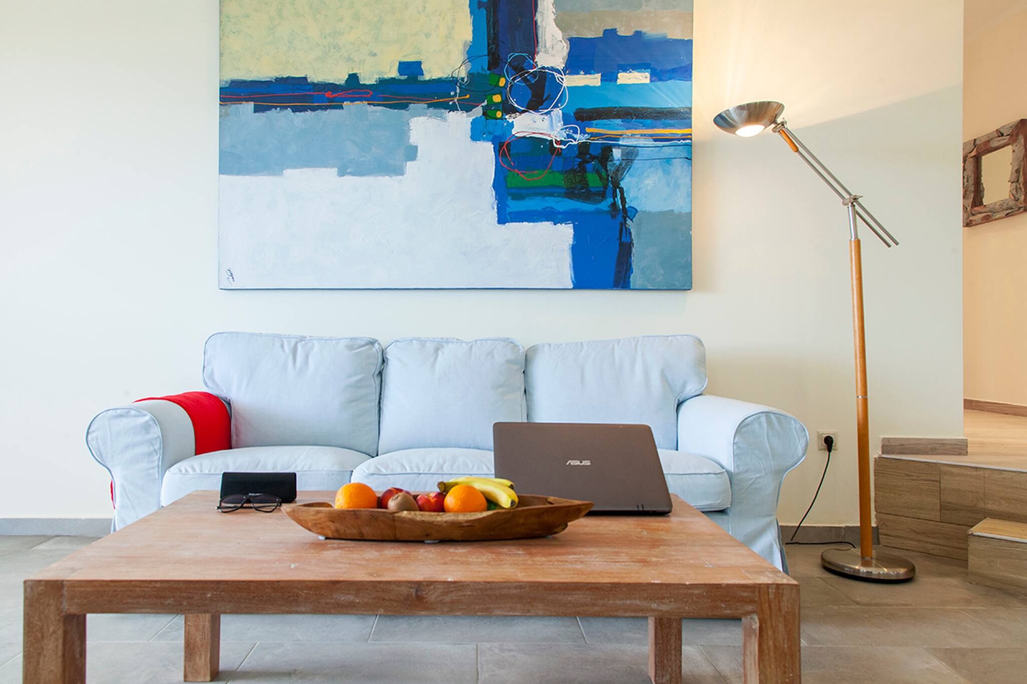 Upon entering Villa Blauw, you walk into a spacious open plan living area filled with natural sunlight through the window panel doors that lead to the outdoor pool area. This space consists of a fully equipped kitchen, dining area and a lounge setting facing the Ionian Sea and the lush green mountain side in the background. On the left-hand side of the living area is the a WC