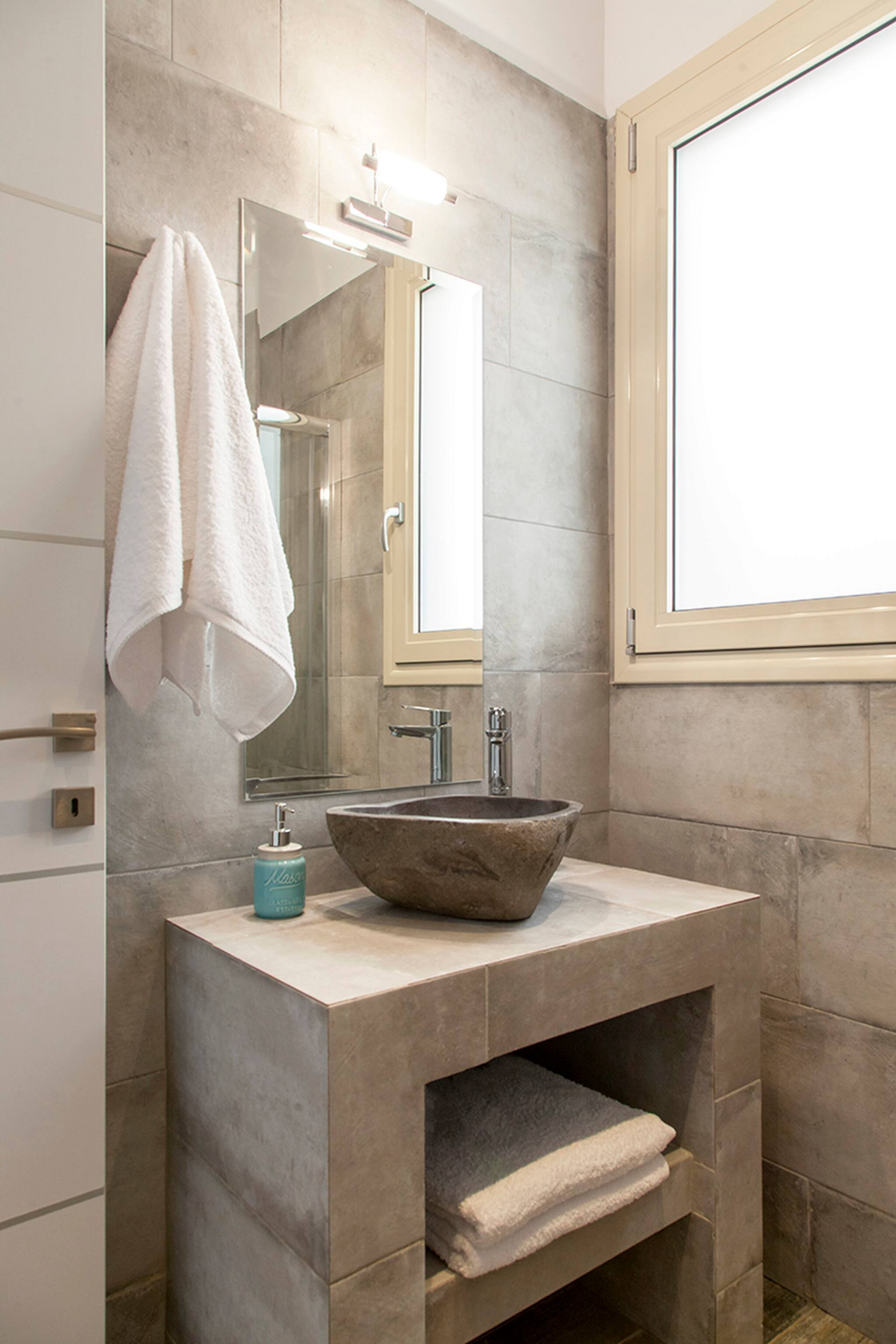Upon entering Villa Alikistis, you come into the large living space with high ceilings which on one end is a fully equipped kitchen with a dining setting and a spacious lounge and dining setting. On the other end of the ground level is a very spacious double bedroom and a family bathroom with shower. This space fills with natural lights through its glass window panel doors which also give you access to the private pool area. en-suite bathroom.