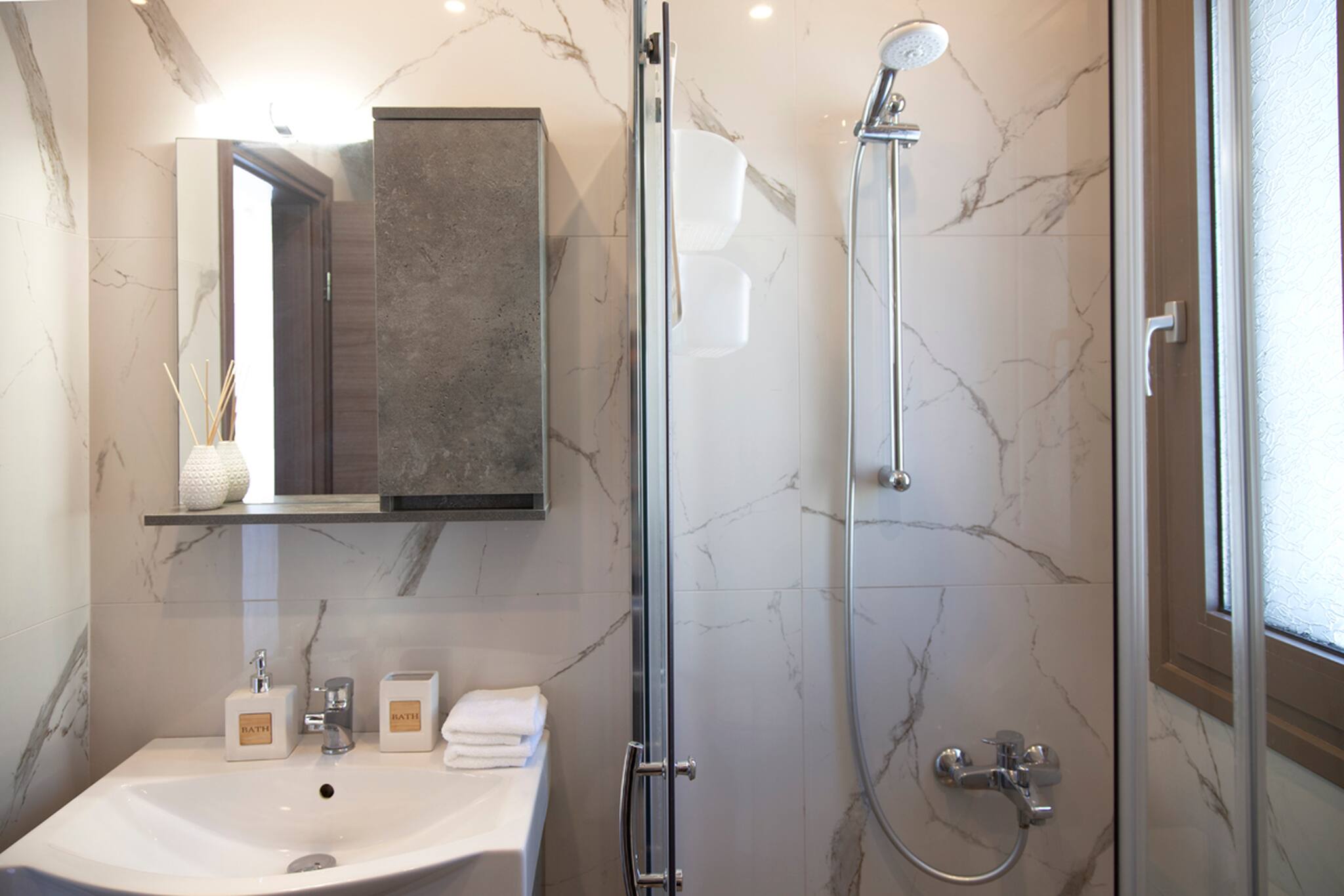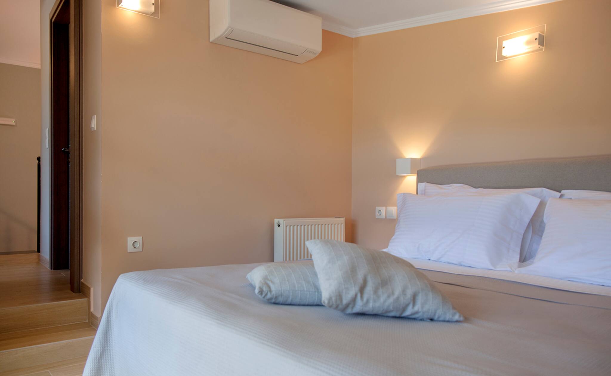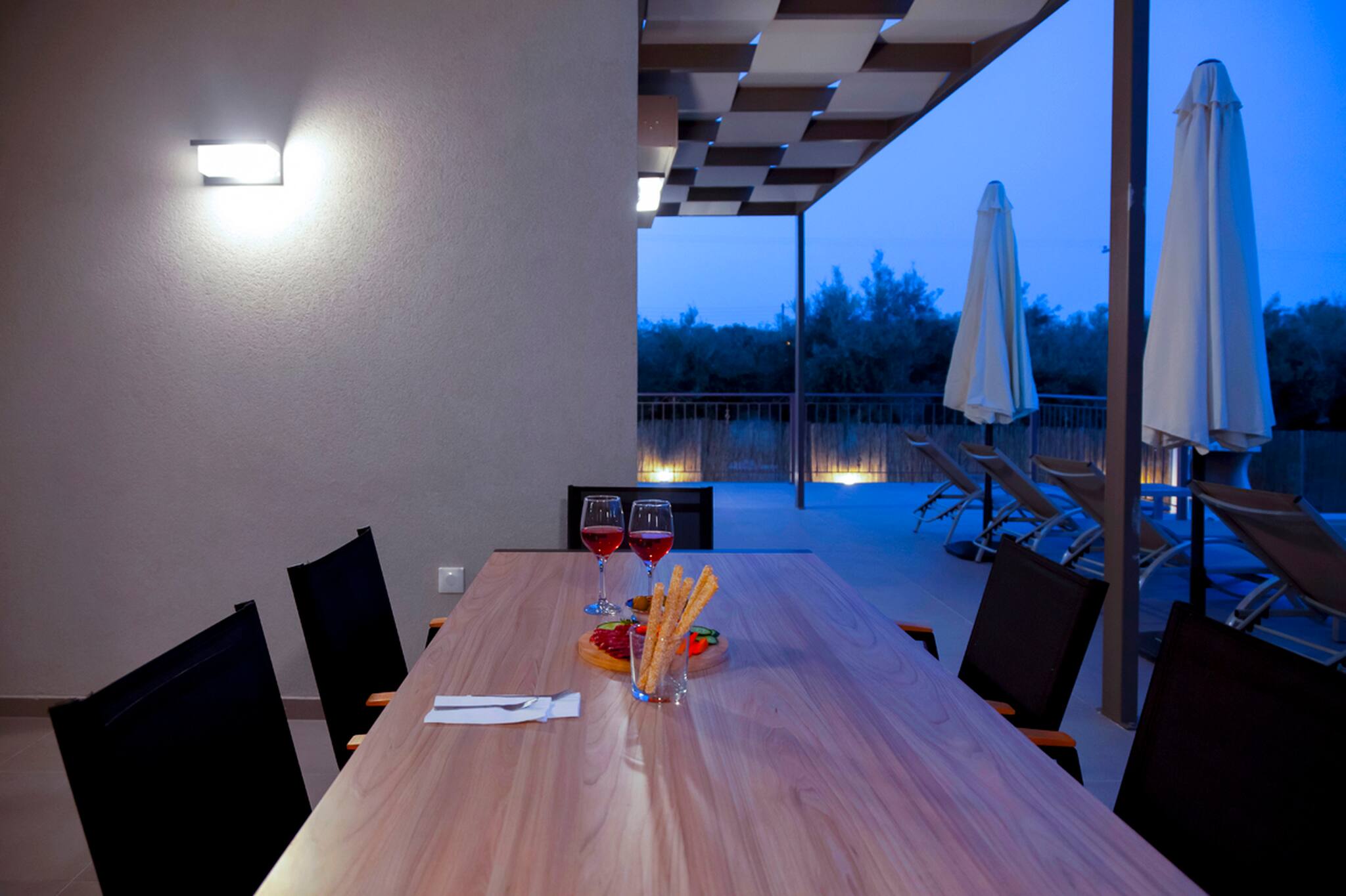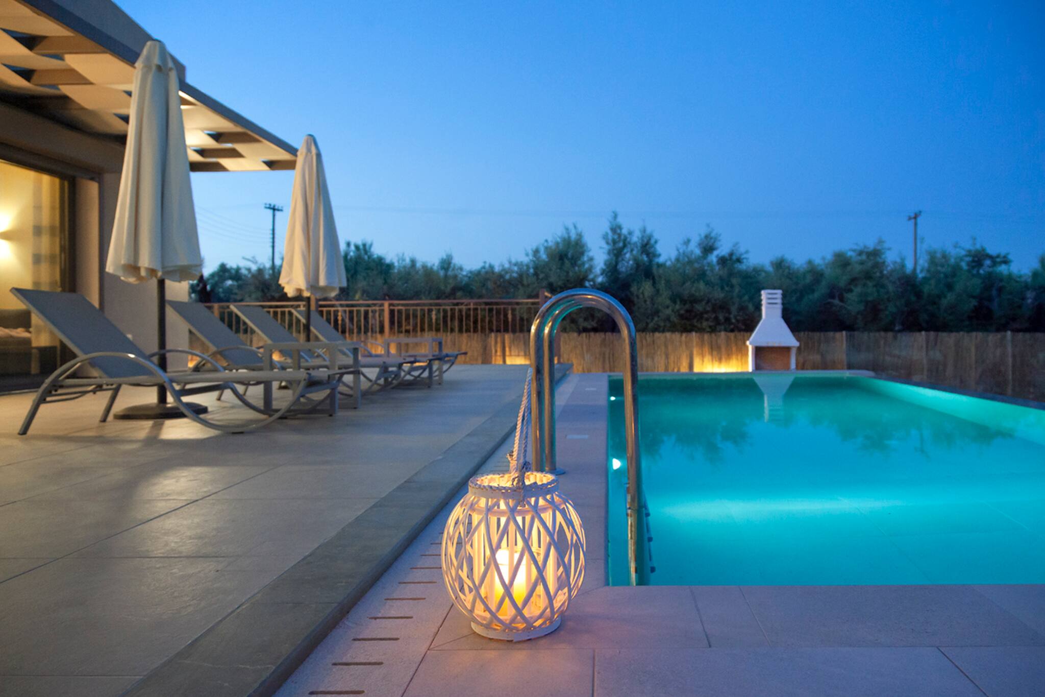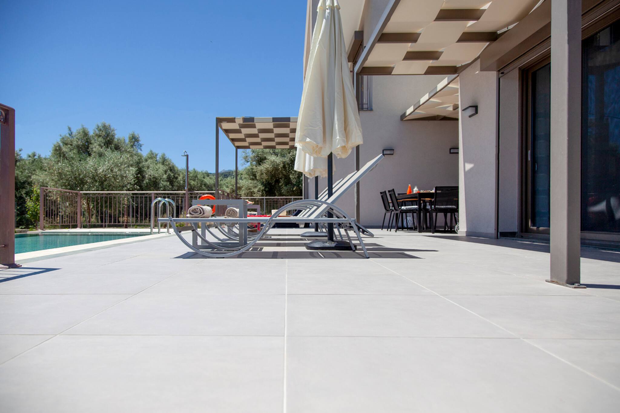 Upon entering Alba Luxury Home you will find yourself in its spacious living room which is accompanied by a fully equipped kitchen. As you continue you will discover the 3 double bedrooms each with its own bathroom. From the last bedroom, you have direct access to Alba Luxury Home’s outdoor area located directly in front of the pool.