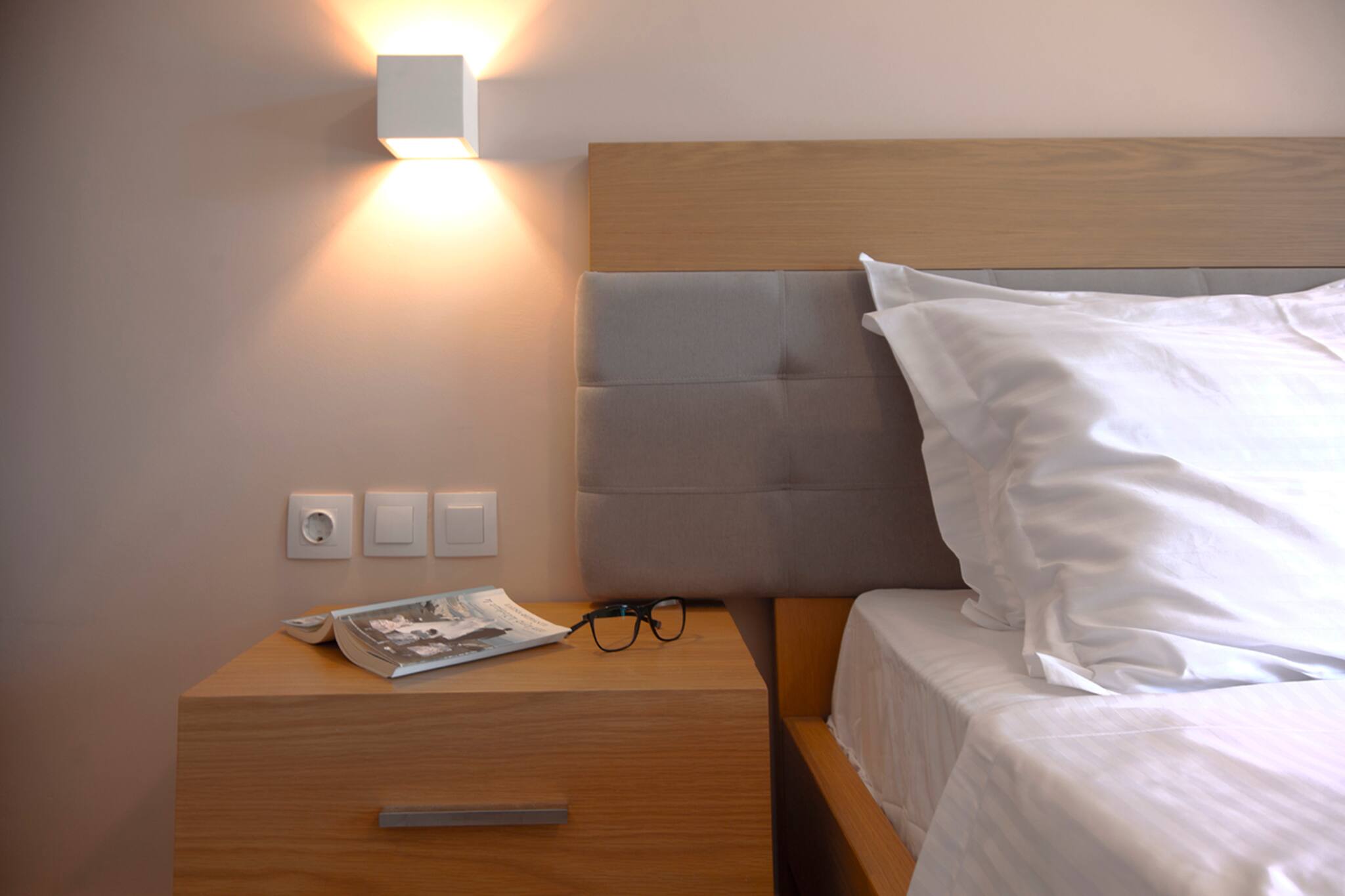 On the upper floor you’ll find two bedrooms with a shared guest bathroom with shower, and a master bedroom with en-suite bathroom and shower. The master bedroom has a double bed and each of the other rooms has two twin beds which can also be made into doubles. Each of the bedrooms has modern luxury furnishings and balcony access for incredible morning views of the sea.