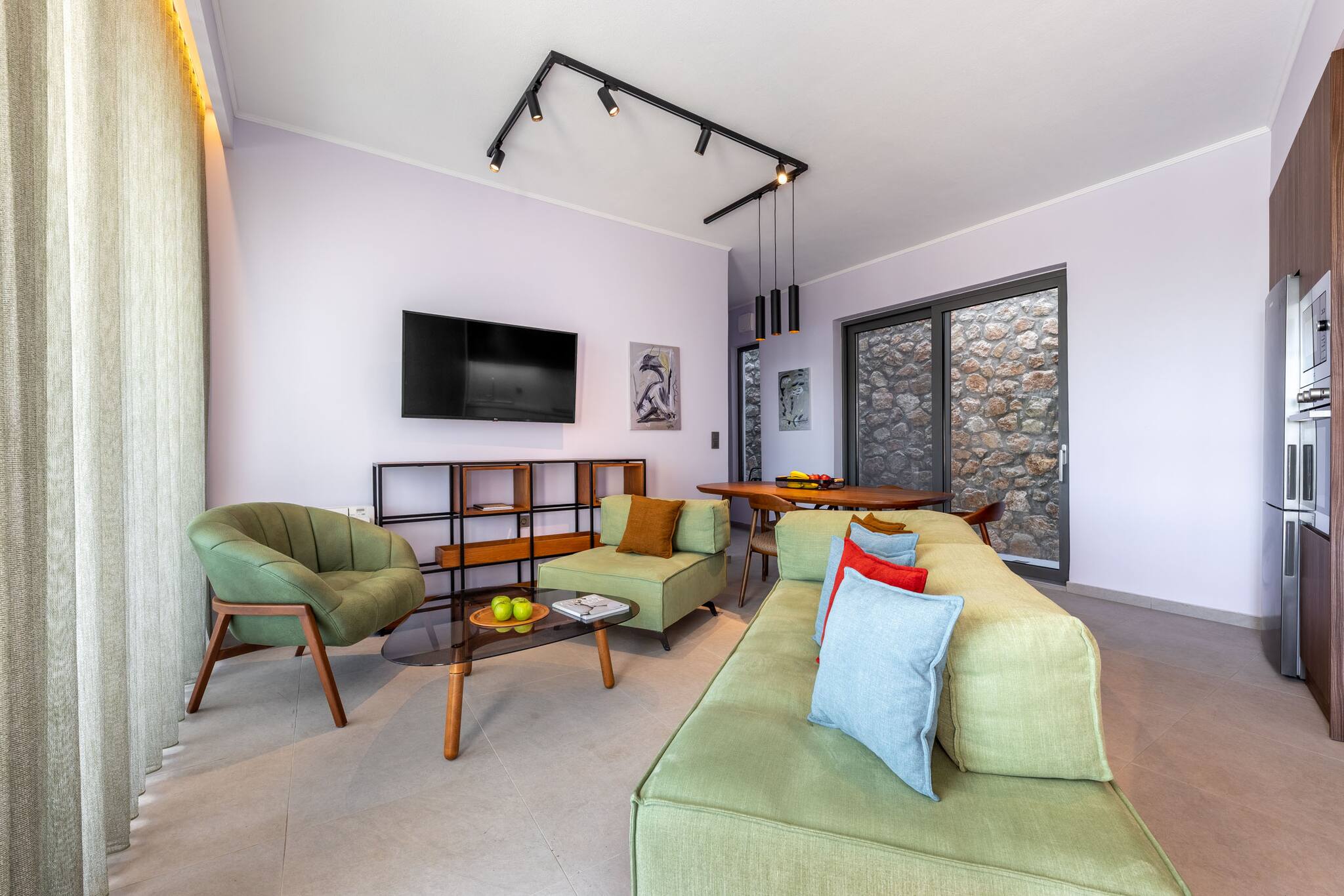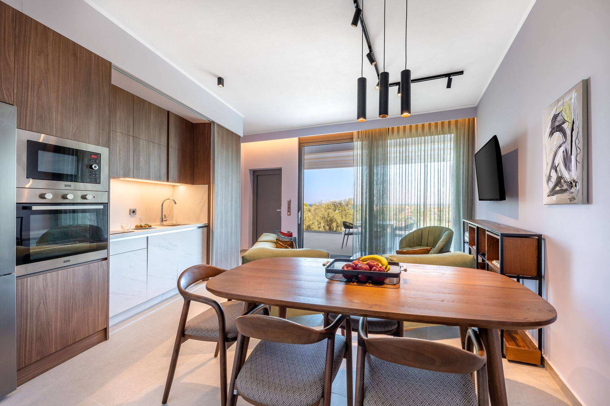 natural sunlight through the glass panel doors. On one end is a fully equipped
