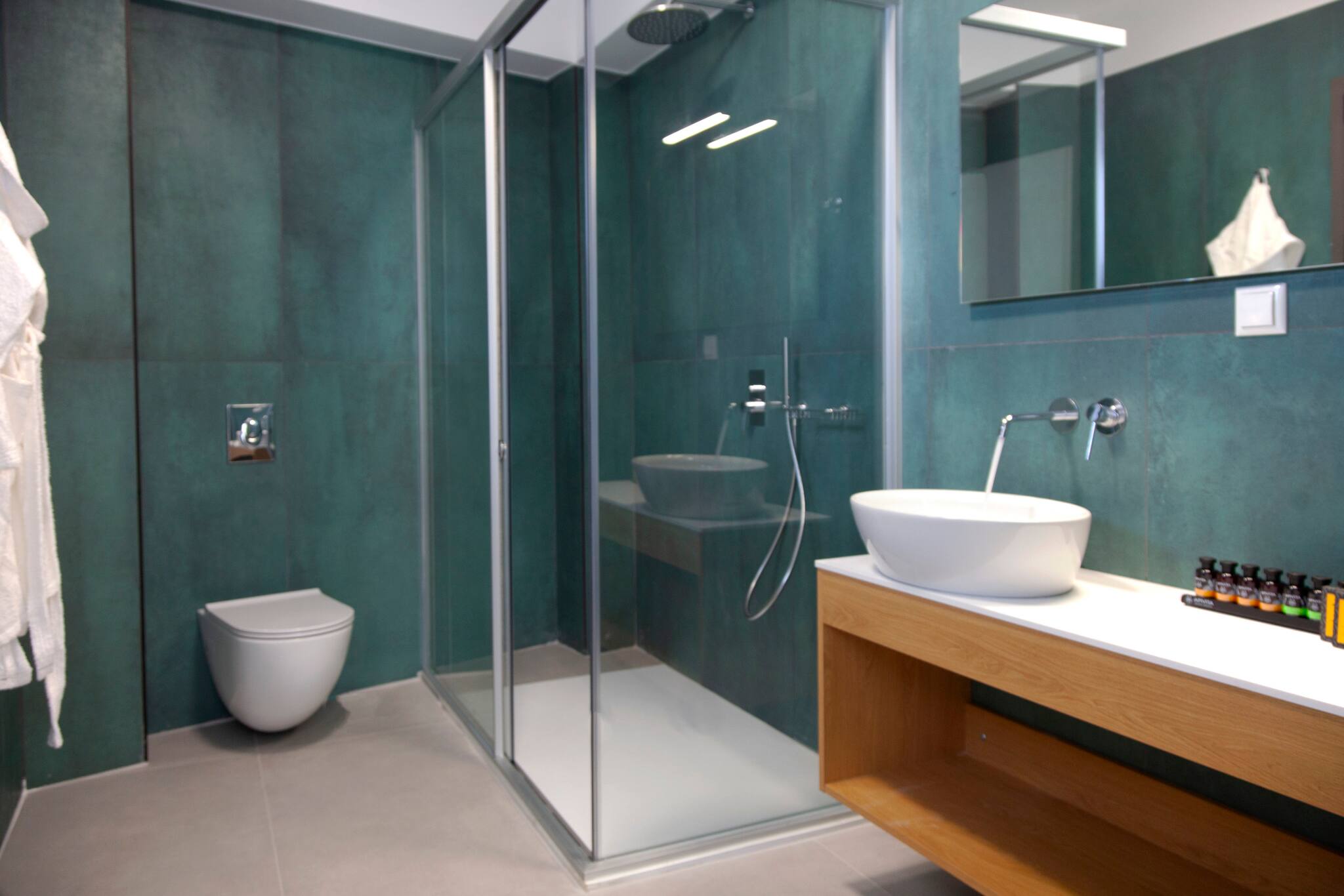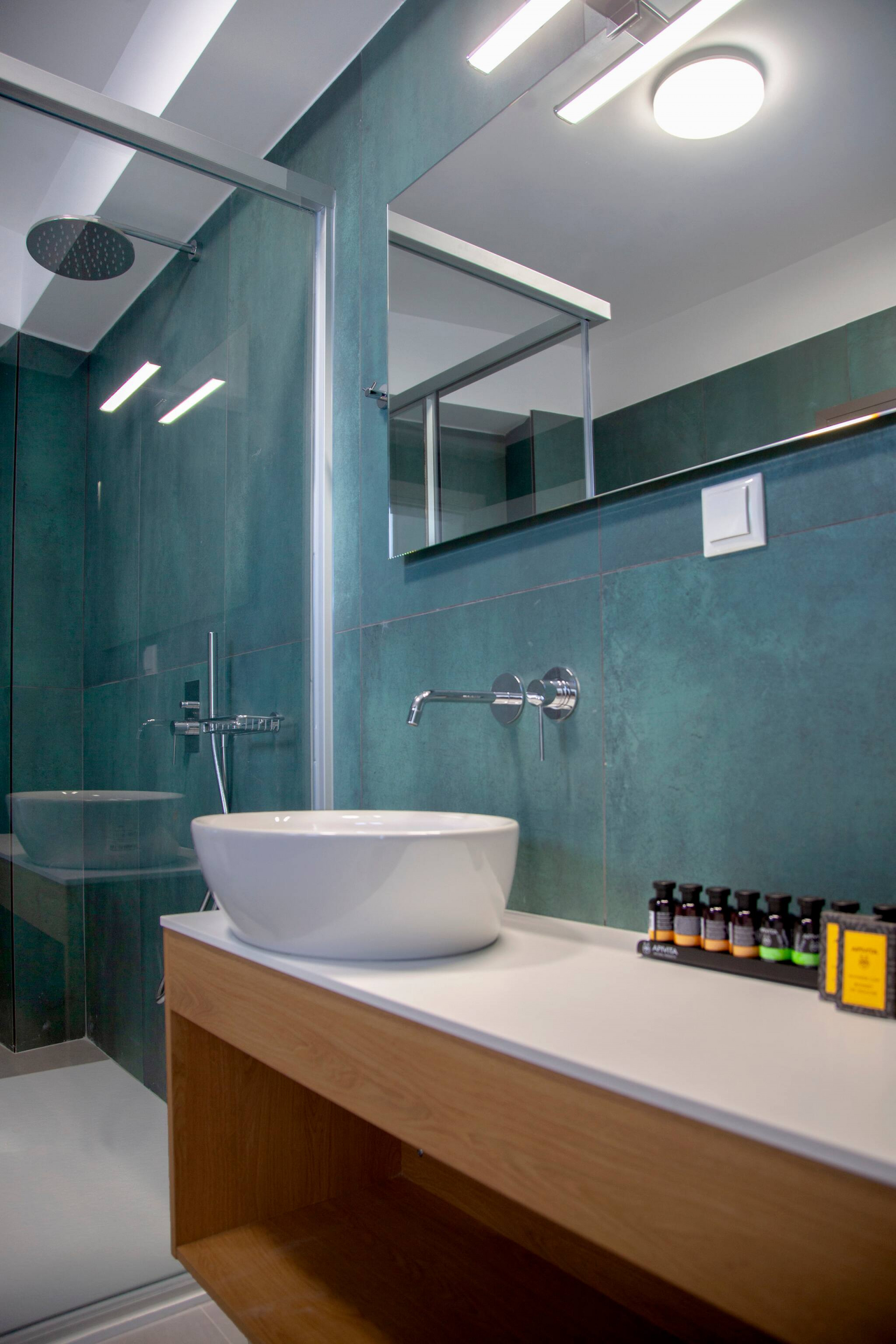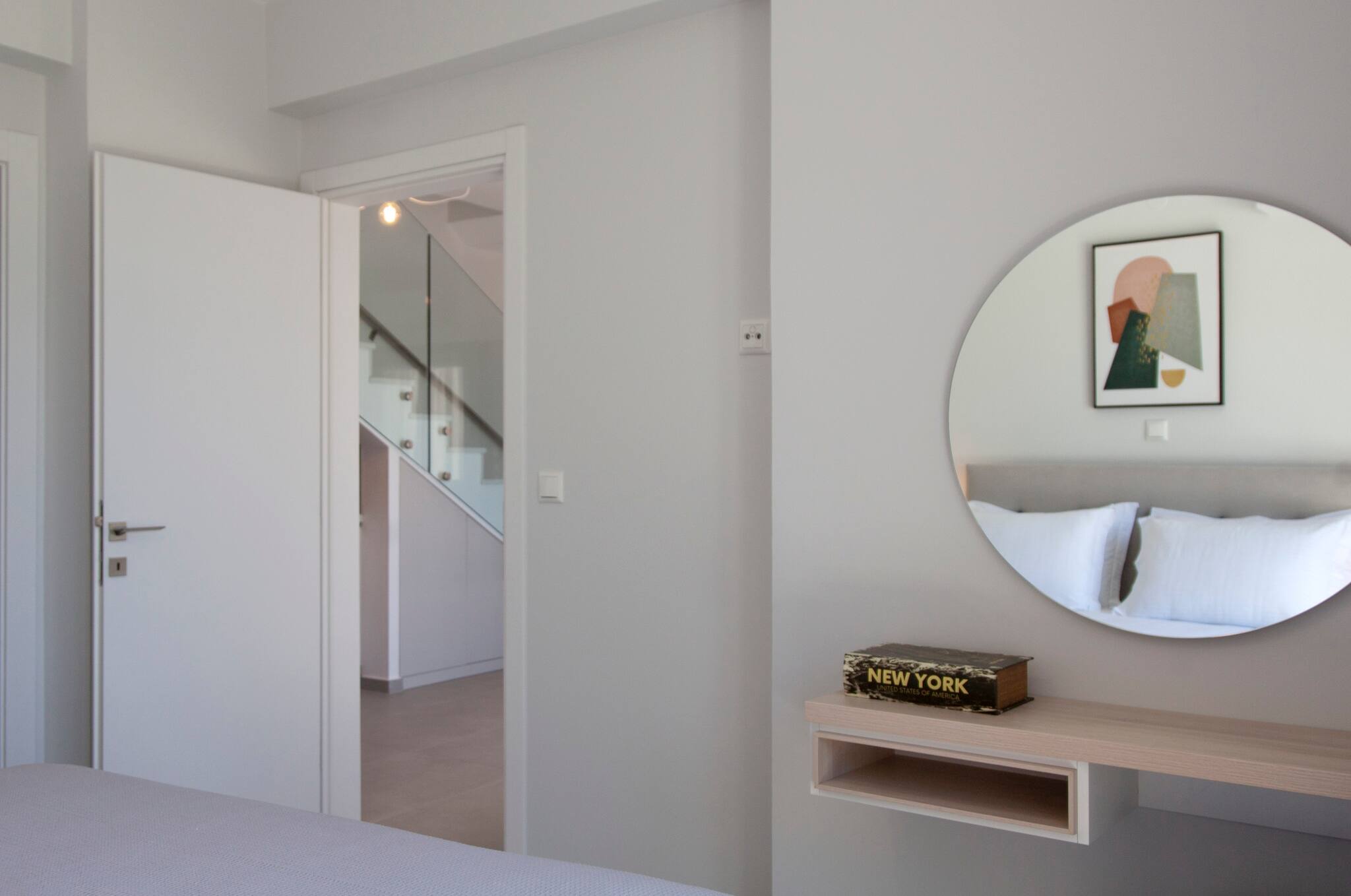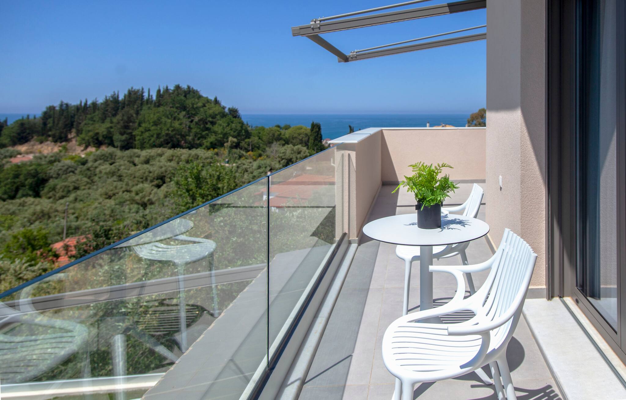 Via internal staircase we move up to the first level of Villa Monolithi where you will find the master bedroom along with a family bathroom and a private balcony. The master bedroom has a double bed with an ensuite bathroom. The luxury of the master bedroom is the private balcony overlooking the pool area and across the Ionian Sea with Lefkada and Paxos as a backdrop.
