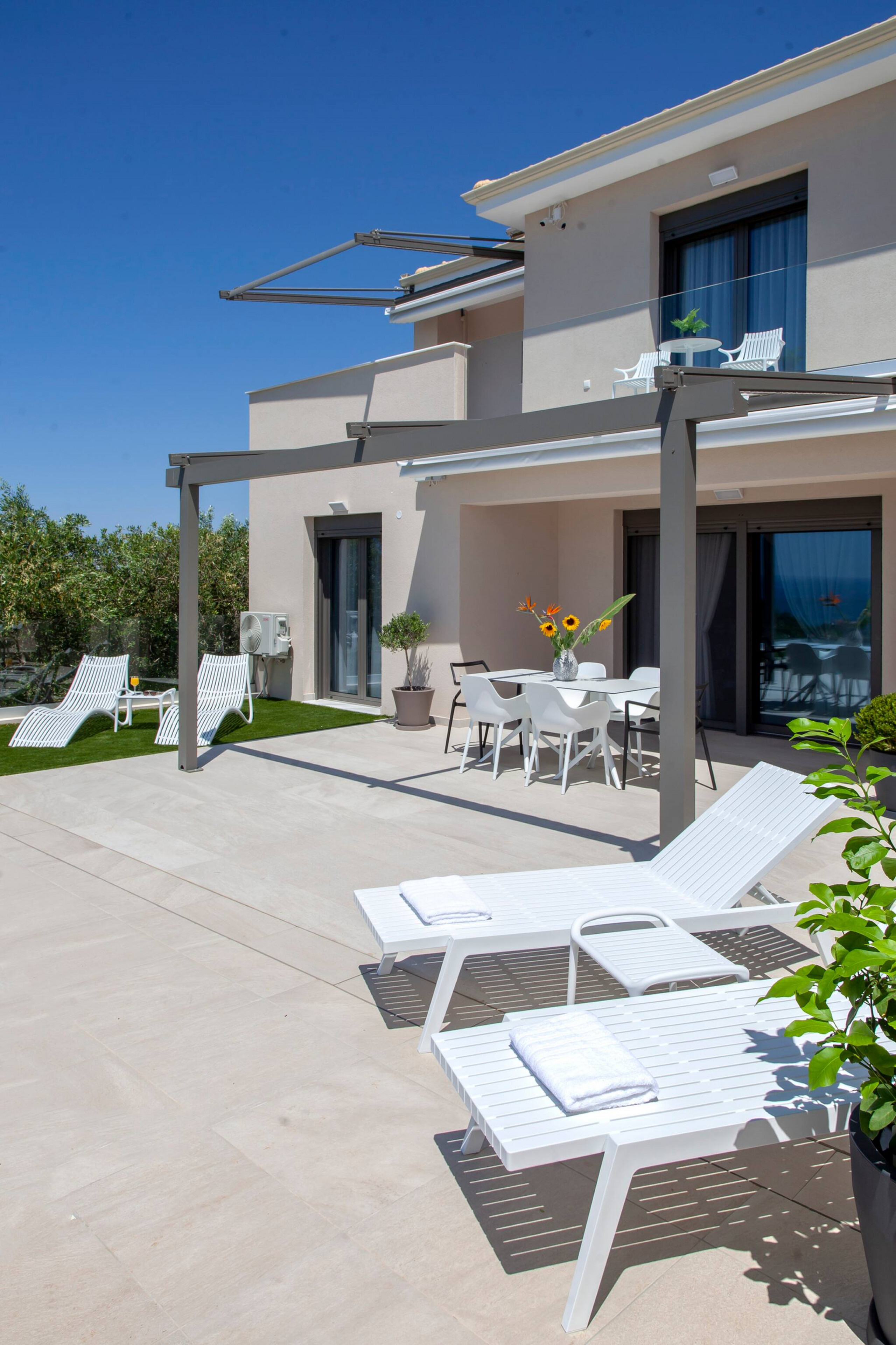Villa Perseids in Preveza boasts an outdoor area comprising of endless options for both adults and children. There are several seating options to soak up the Greek sun or have an afternoon siesta under the shade of a pergola covering the outdoor dining setting. The outdoor designer furniture received awards in the most prestigious design competitions in the world, besides being state-of-the-art, are also environmentally friendly and contributing to create a better world.