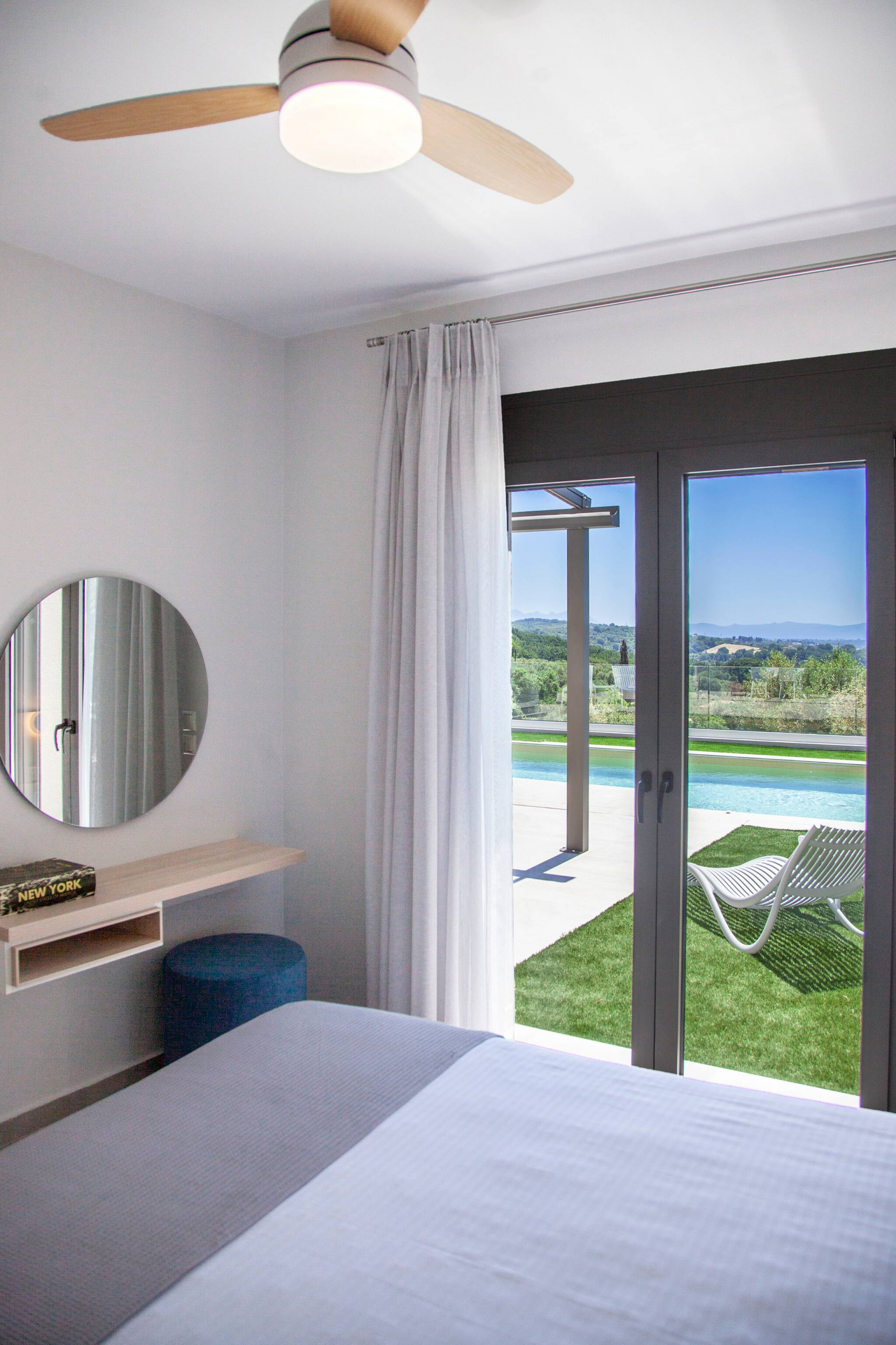 Upon entering Villa Perseids, you come into the large living space which on one end is a fully equipped kitchen and on the front end is the lounge area that fills with natural light and has direct access to the private pool area. Also on this level is a double bedroom with ensuite bathroom. The living space is equipped with a double sofa bed for two additional guests.