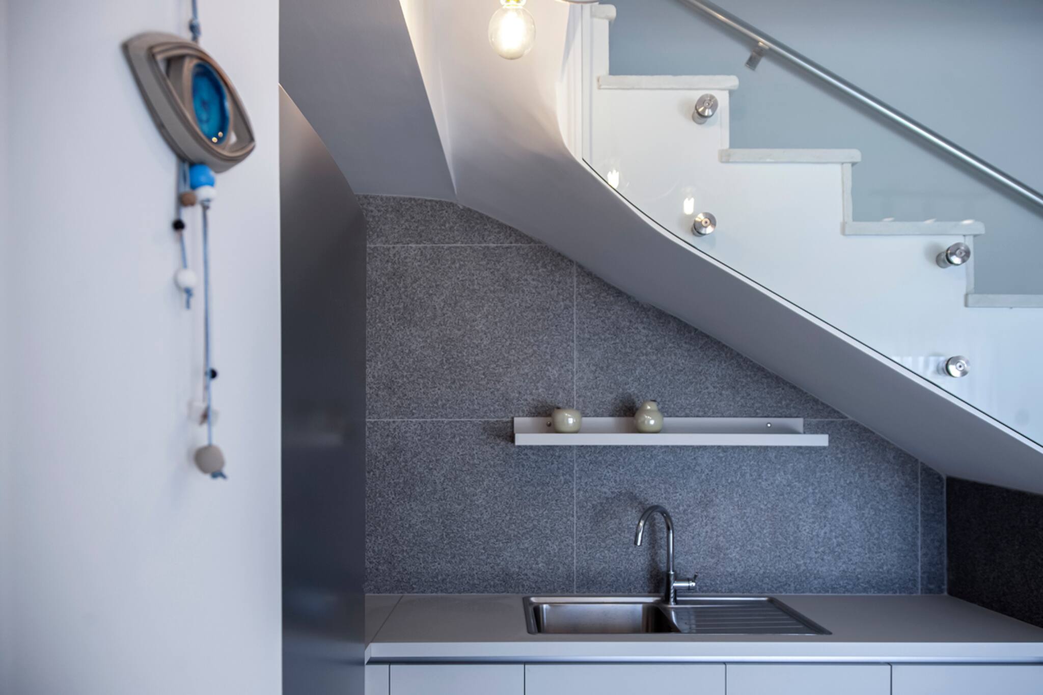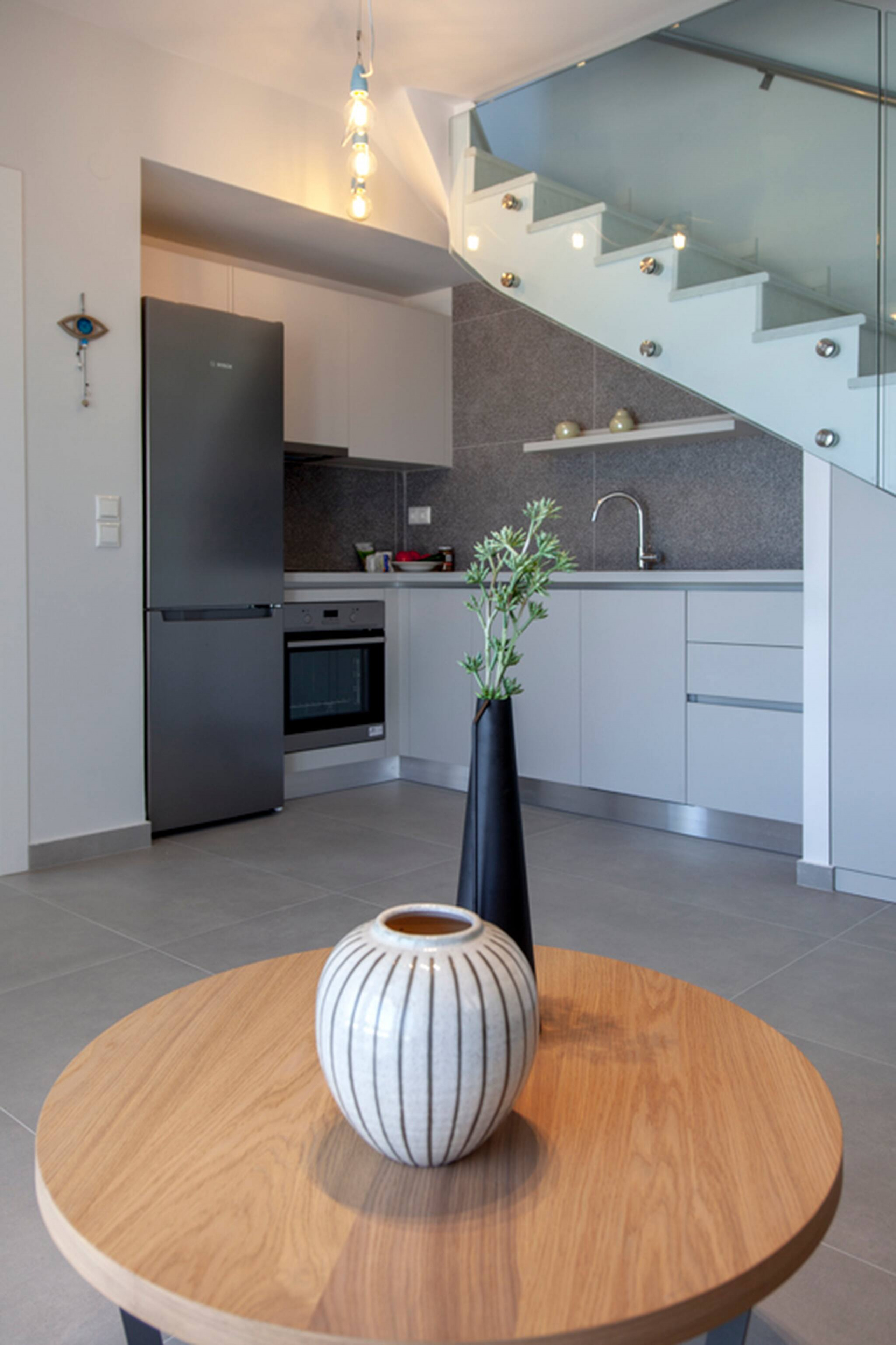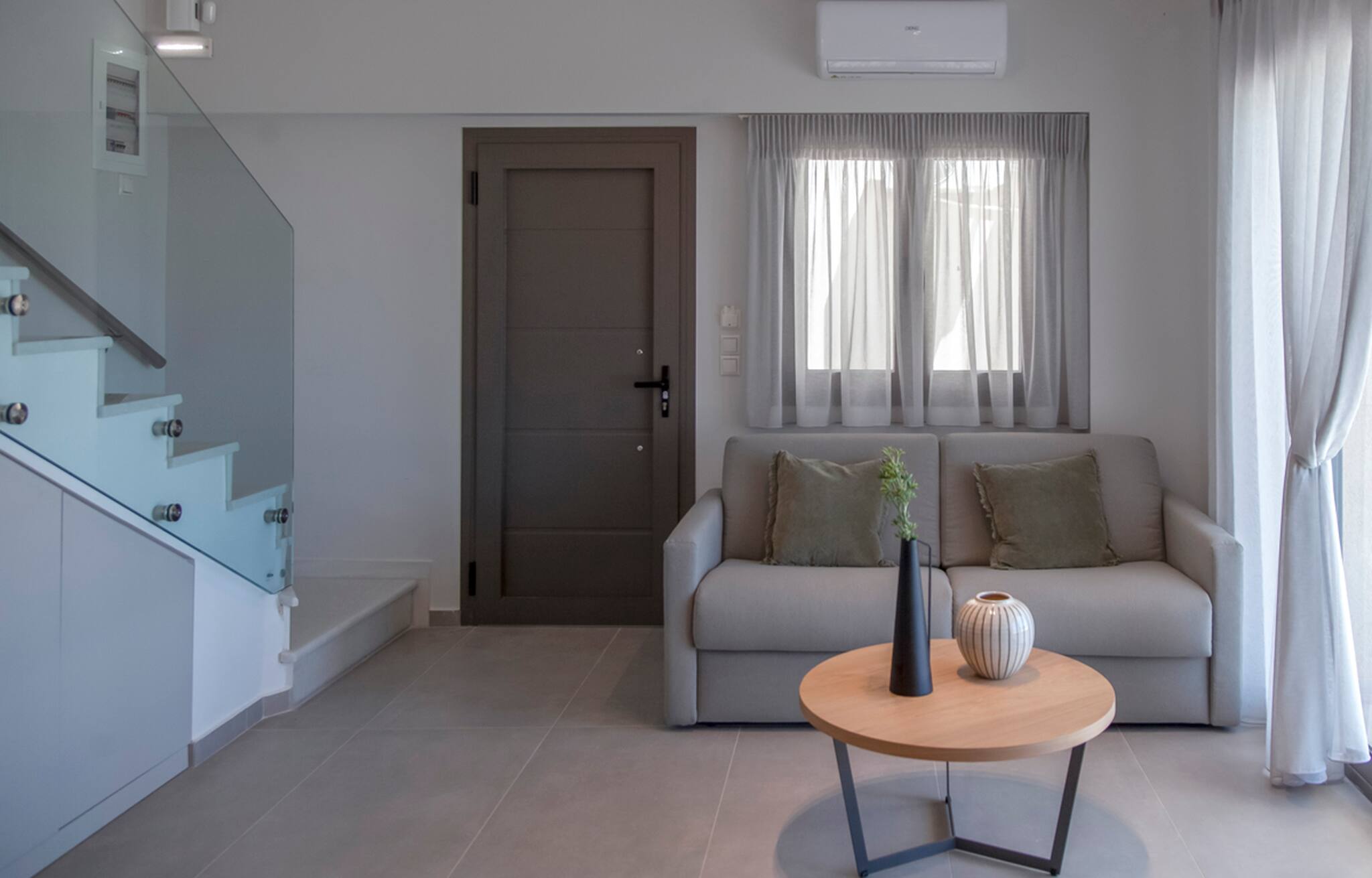 Upon entering Villa Monolithi, you come into the large living space which on one end is a fully equipped kitchen and on the front end is the lounge area that fills with natural light and has direct access to the private pool area. Also on this level is a double bedroom with ensuite bathroom. The living space is equipped with a double sofa bed for two additional guests.