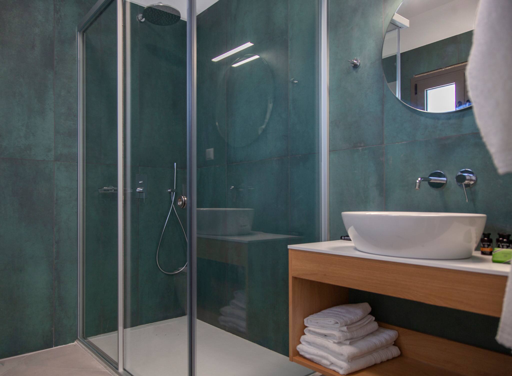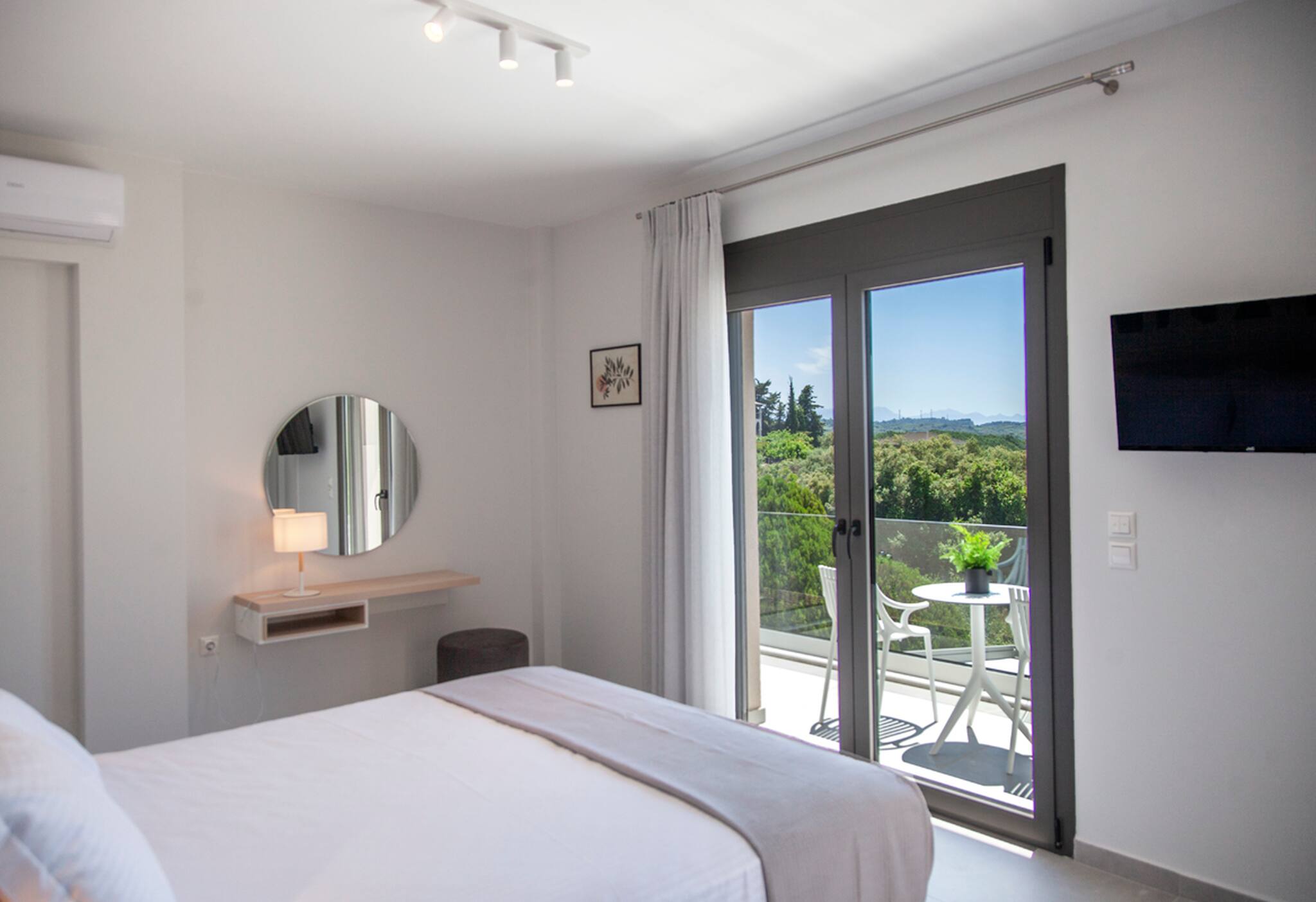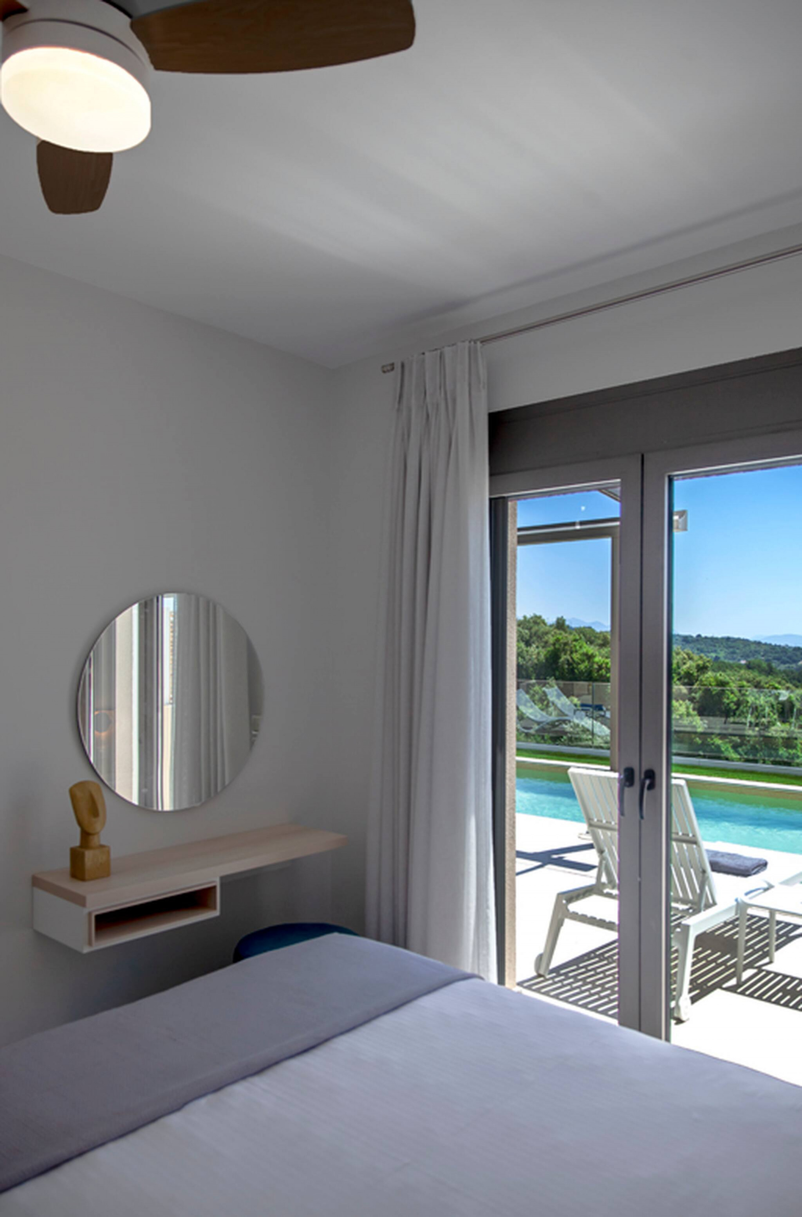 Via internal staircase we move up to the first level of Villa Monolithi where you will find the master bedroom along with a family bathroom and a private balcony. The master bedroom has a double bed with an ensuite bathroom. The luxury of the master bedroom is the private balcony overlooking the pool area and across the Ionian Sea with Lefkada and Paxos as a backdrop.
