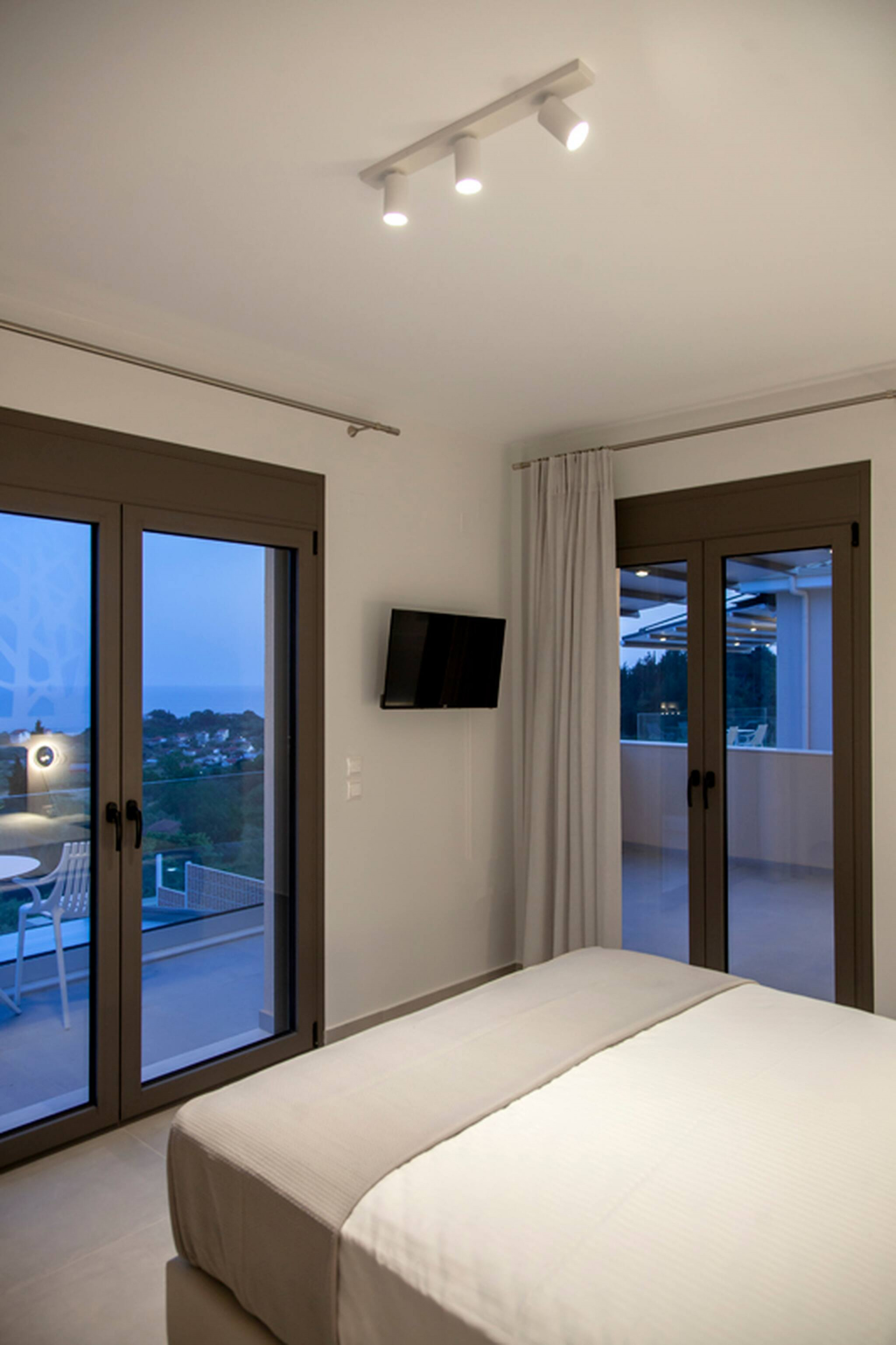 Via internal staircase we move up to the first level of Villa Perseids where you will find the master bedroom along with a family bathroom and a private balcony. The master bedroom has a double bed with an ensuite bathroom. The luxury of the master bedroom is the private balcony overlooking the pool area and across the Ionian Sea with Lefkada and Paxos as a backdrop.