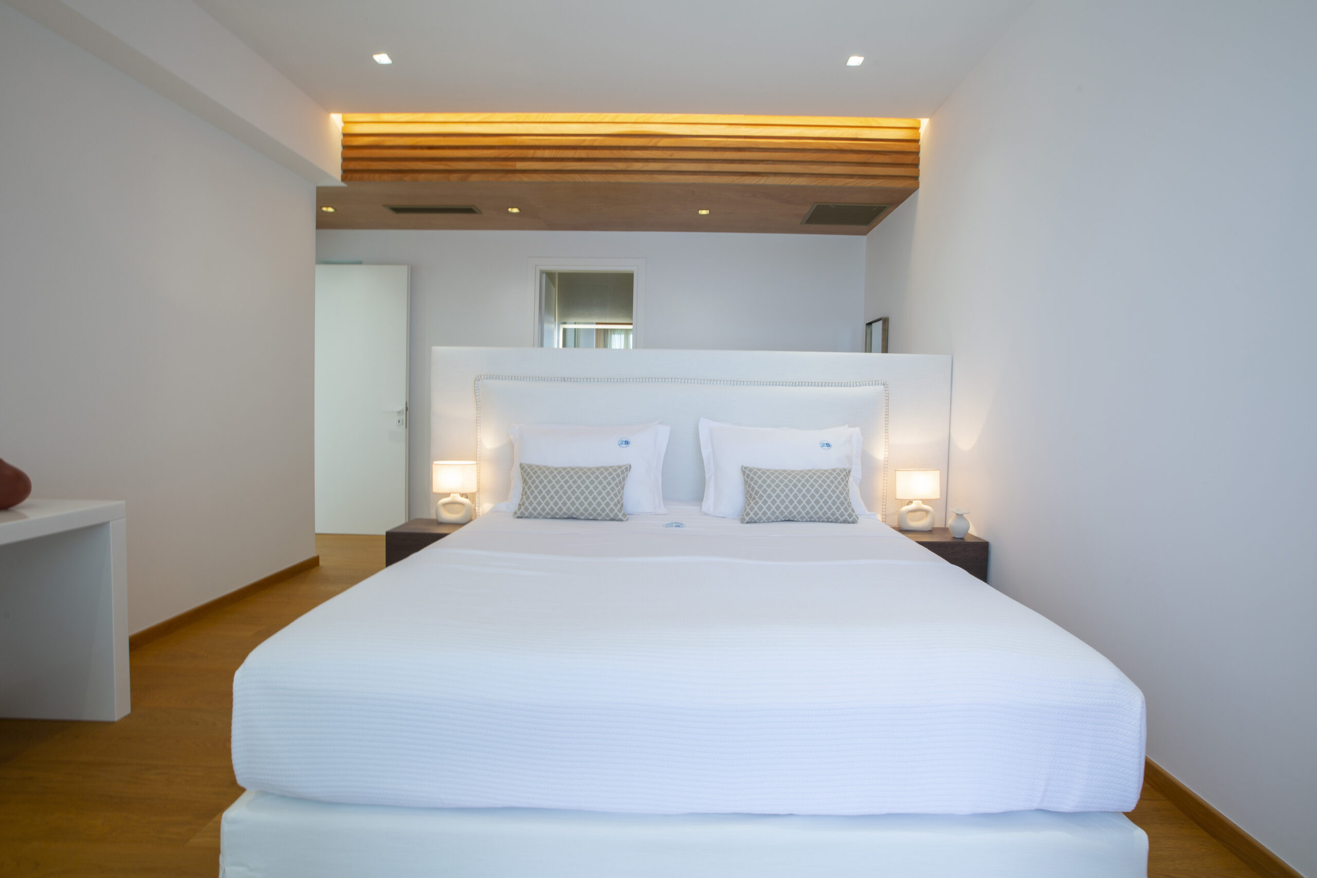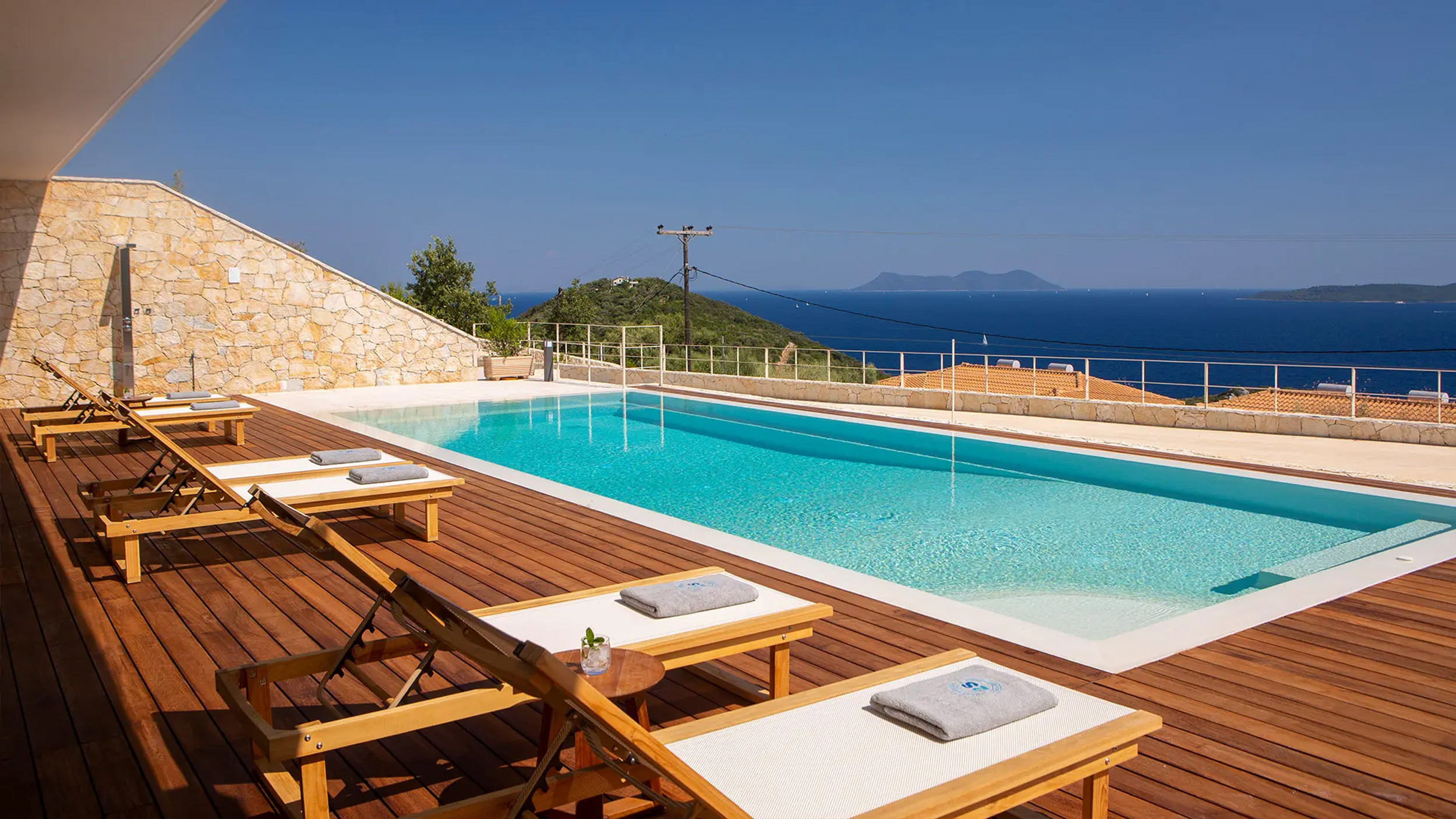 Al fresco slow-living lifestyle at Villa Kappa revolves around the remarkable 60sqm saltwater infinity pool, which is centre piece of the outdoor terrace area blending across the endless blue palette of the Ionian Sea. The outdoor space of Villa Kappa is designed with Iroko wood deck paired with natural white stone, creating a space that feels both stylish and timeless respecting the island slow living lifestyle at your own pace. Comfortable outdoor modern furnishings make it easy to relax throughout the day, whether you are having your morning coffee, enjoying the sun, or unwinding in the evening.