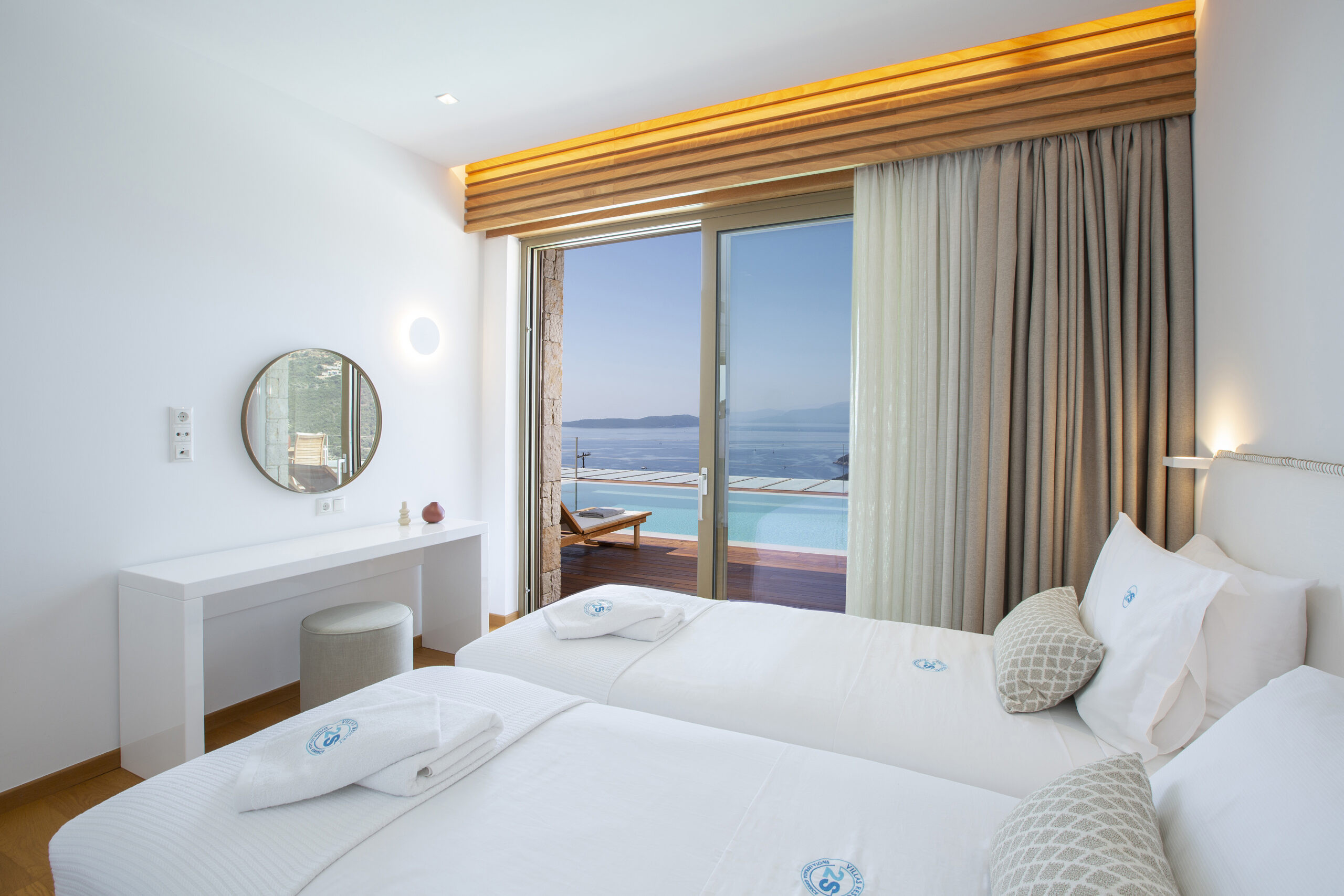The design centres around the beauty of simplicity with an indoor-outdoor synergy filling the space through floor-to-ceiling sliding glass doors, filling the indoors with natural light and giving you crystal blue views from every corner as you would expect when choosing your Luxury Villa in Greece. The fully equipped kitchen and large living room provide plenty of space for shared meals and relaxation from sunrise to sunset.