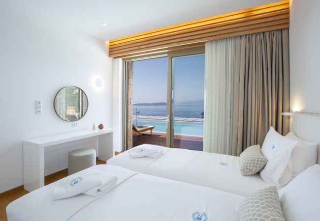 Via internal staircase we move up to the first level of the villa where you will find two bedrooms. Both bedrooms are equipped with double beds, en-suite bathrooms and access to a private balcony with views across Sivota Bay.