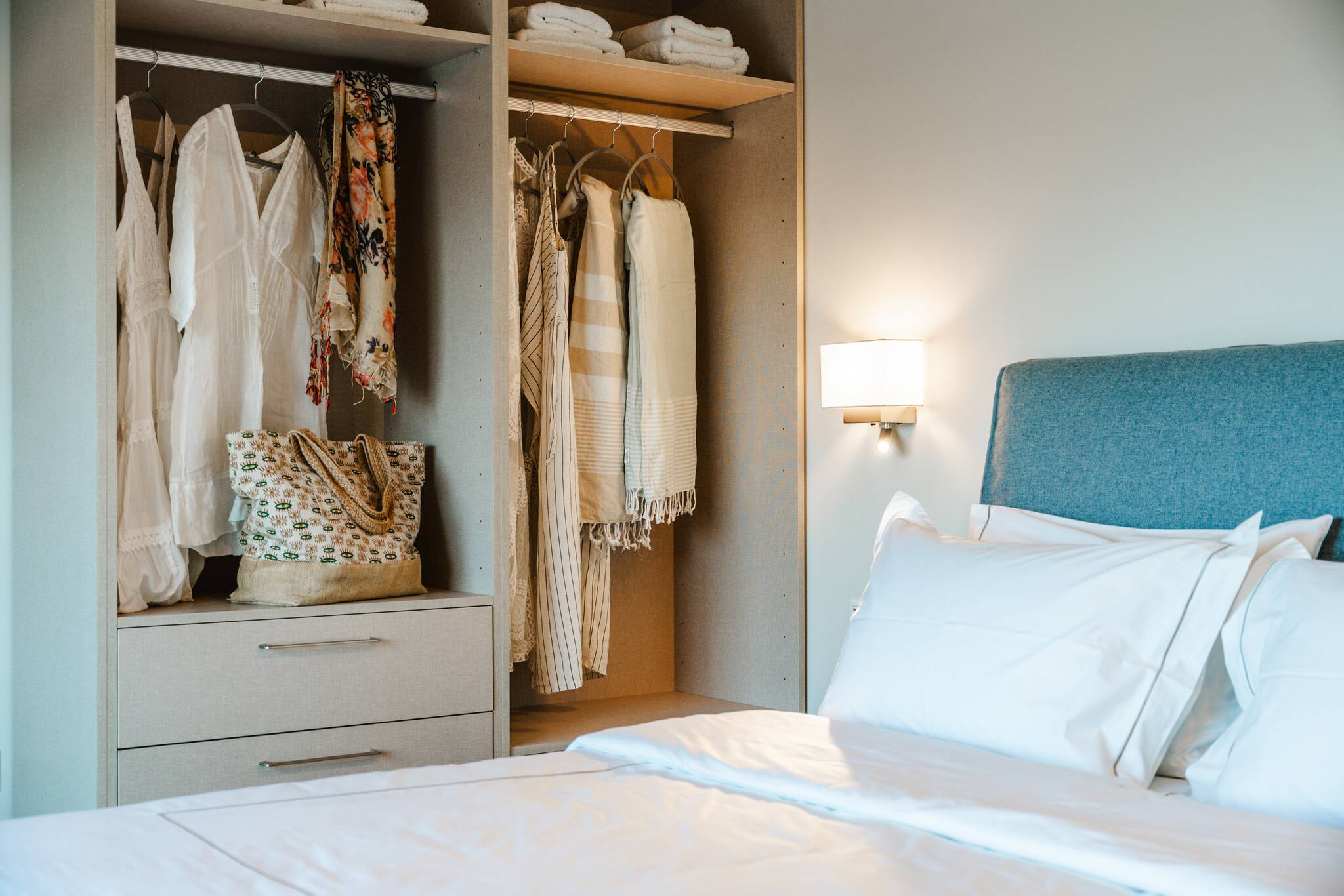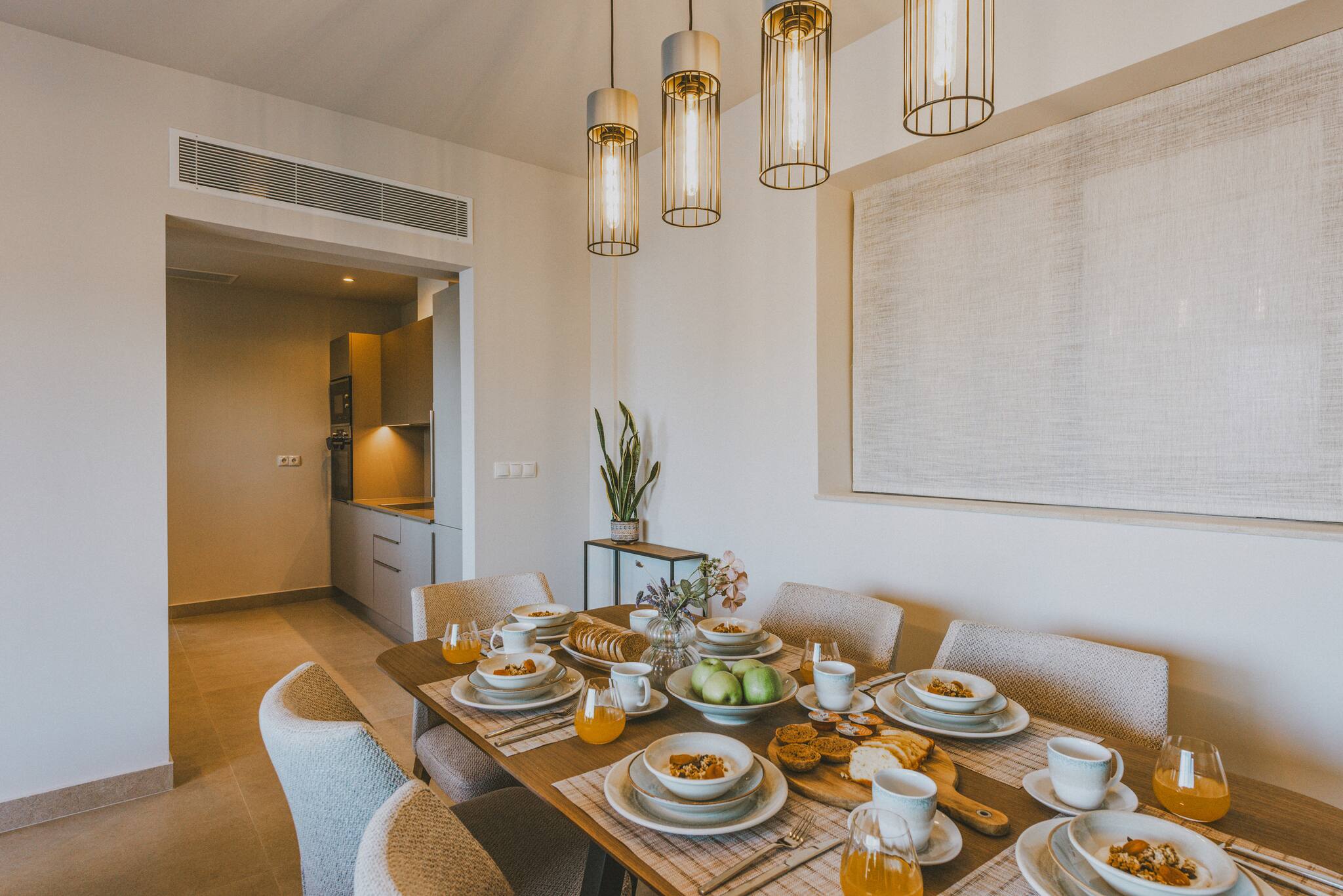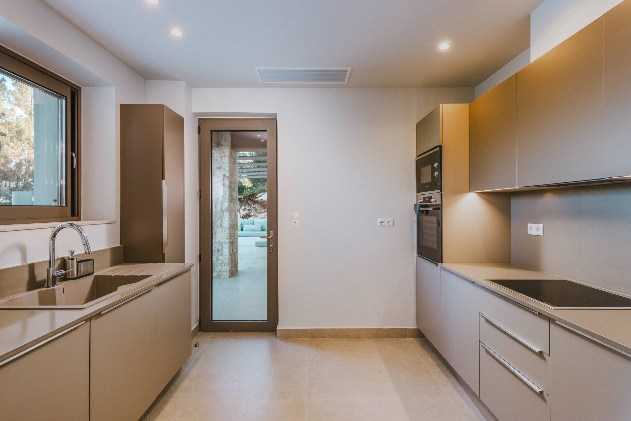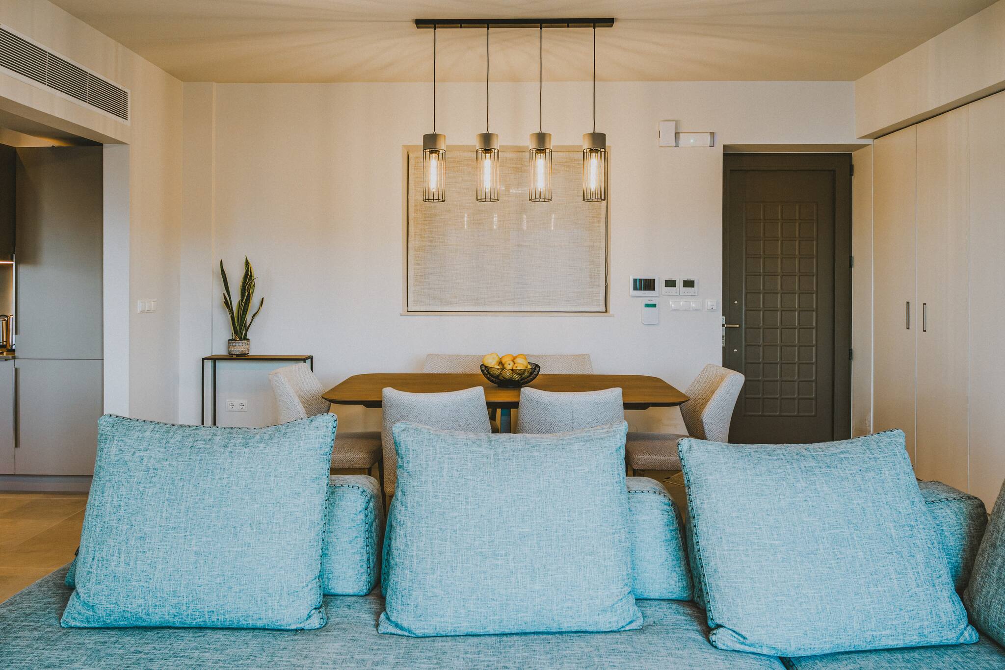 As you enter the villa, you are welcomed into a bright open plan living space with a modern indoor design and a calm, inviting atmosphere. The living room, dining area, and fully equipped kitchen are all connected, creating a space that is perfect for spending time together. Large windows allow plenty of natural light to fill the room while framing beautiful sea views and creating a smooth connection between the inside and outside areas.