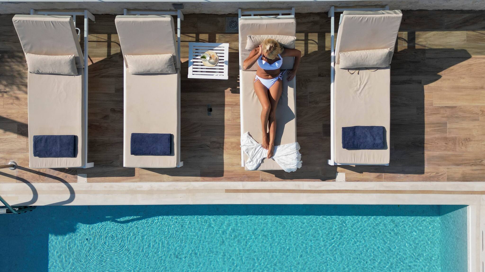 Swimming pool, sun beds, seating area, outdoor dining