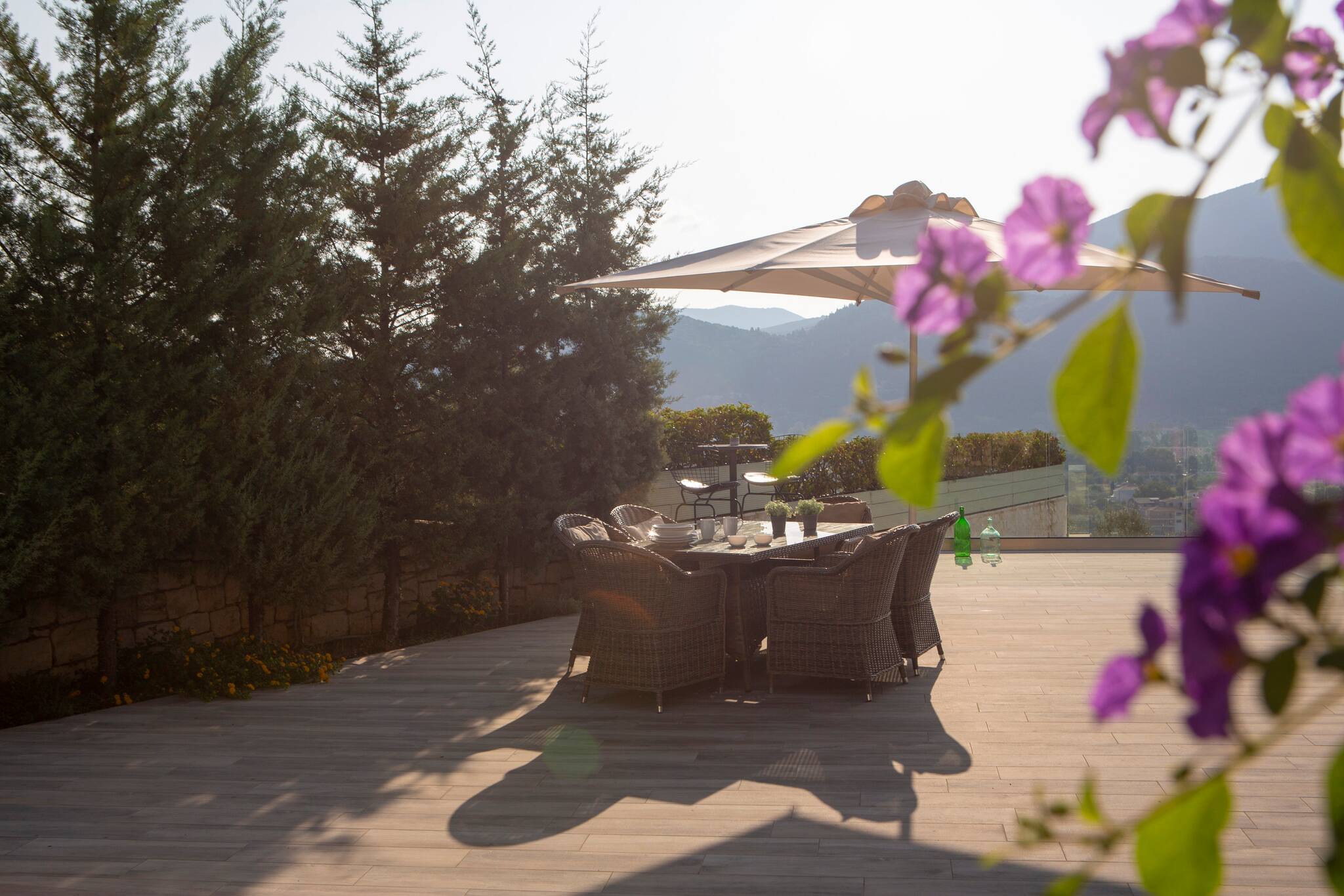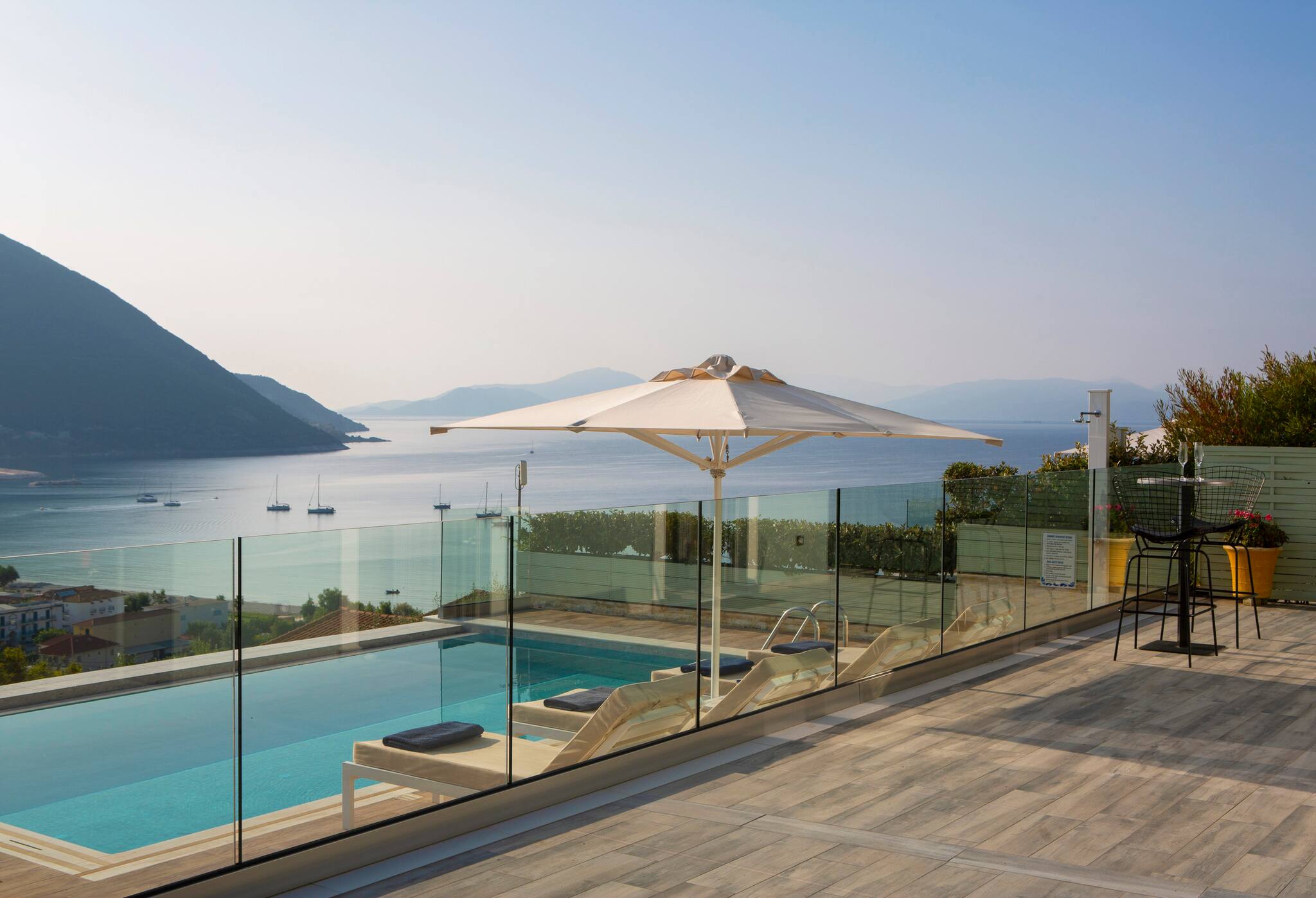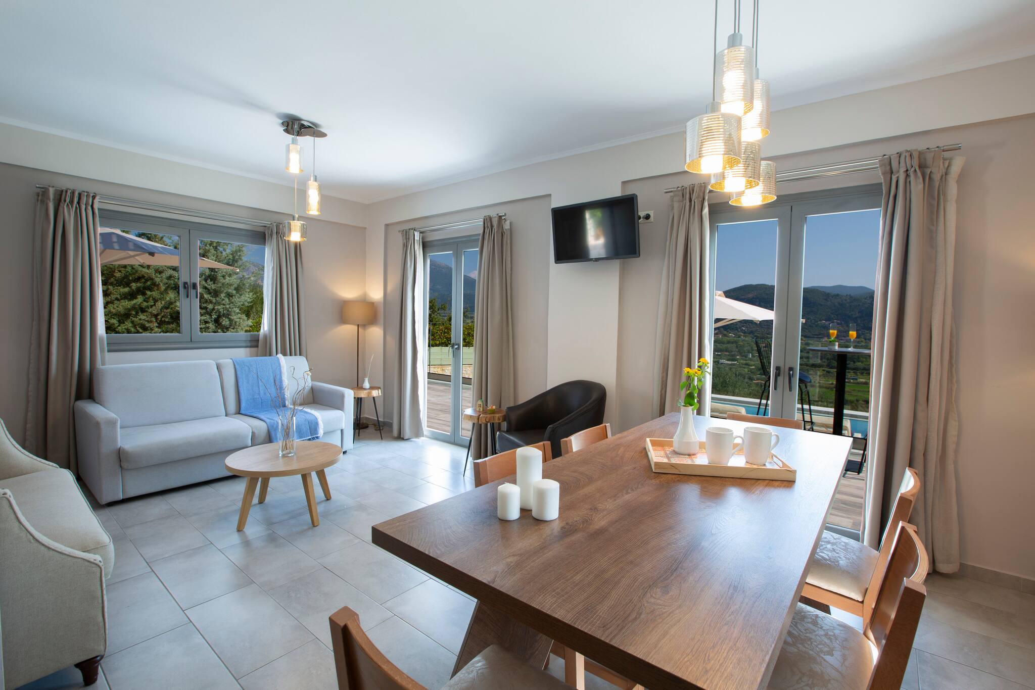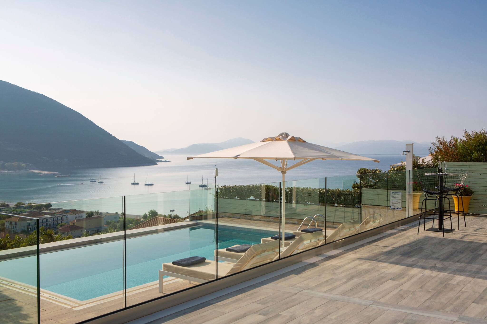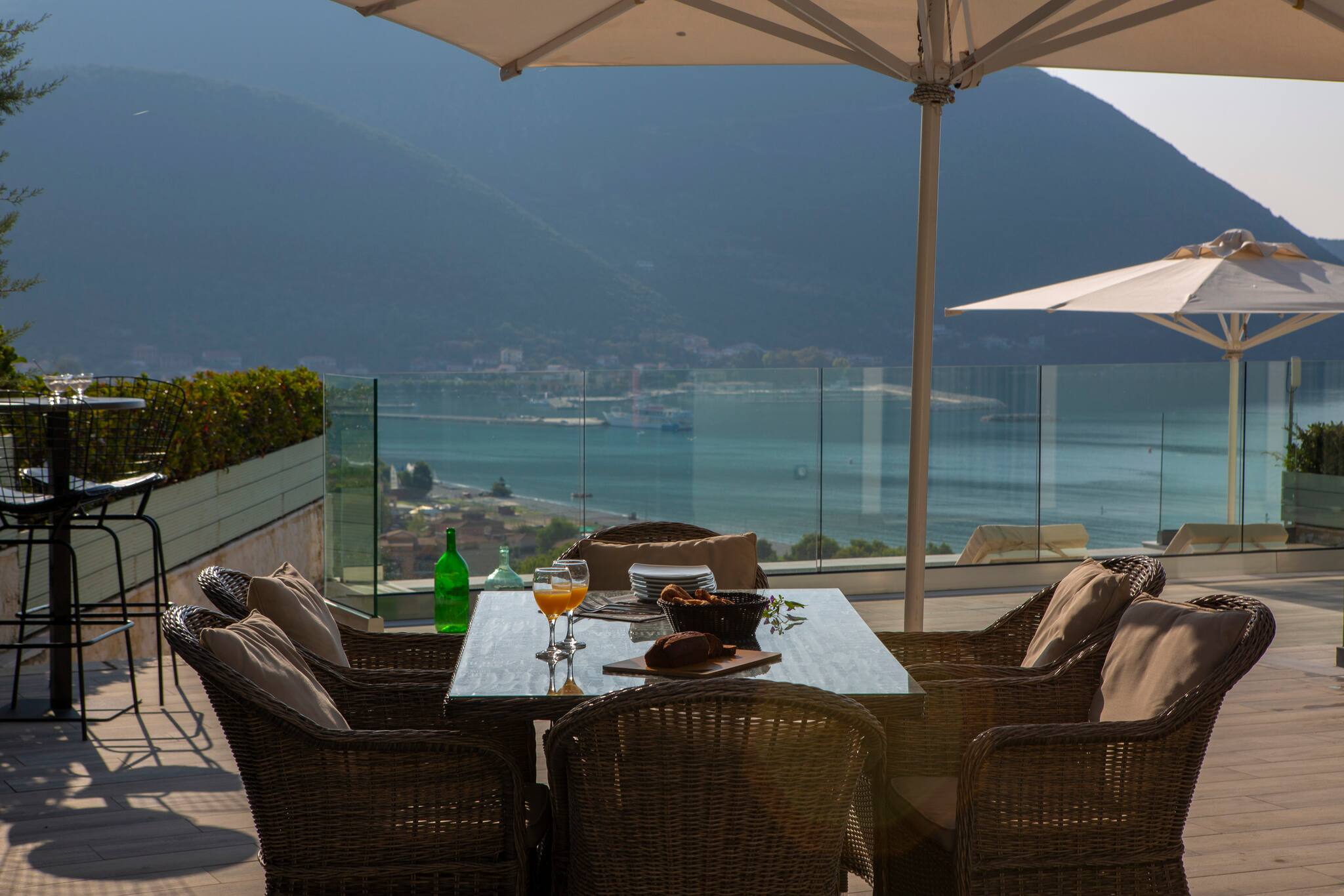Villa Ostria in Lefkada, is perched on the mountain side overlooking the bay of Vasiliki and a short drive or even a short walk to Ponti Beach.
