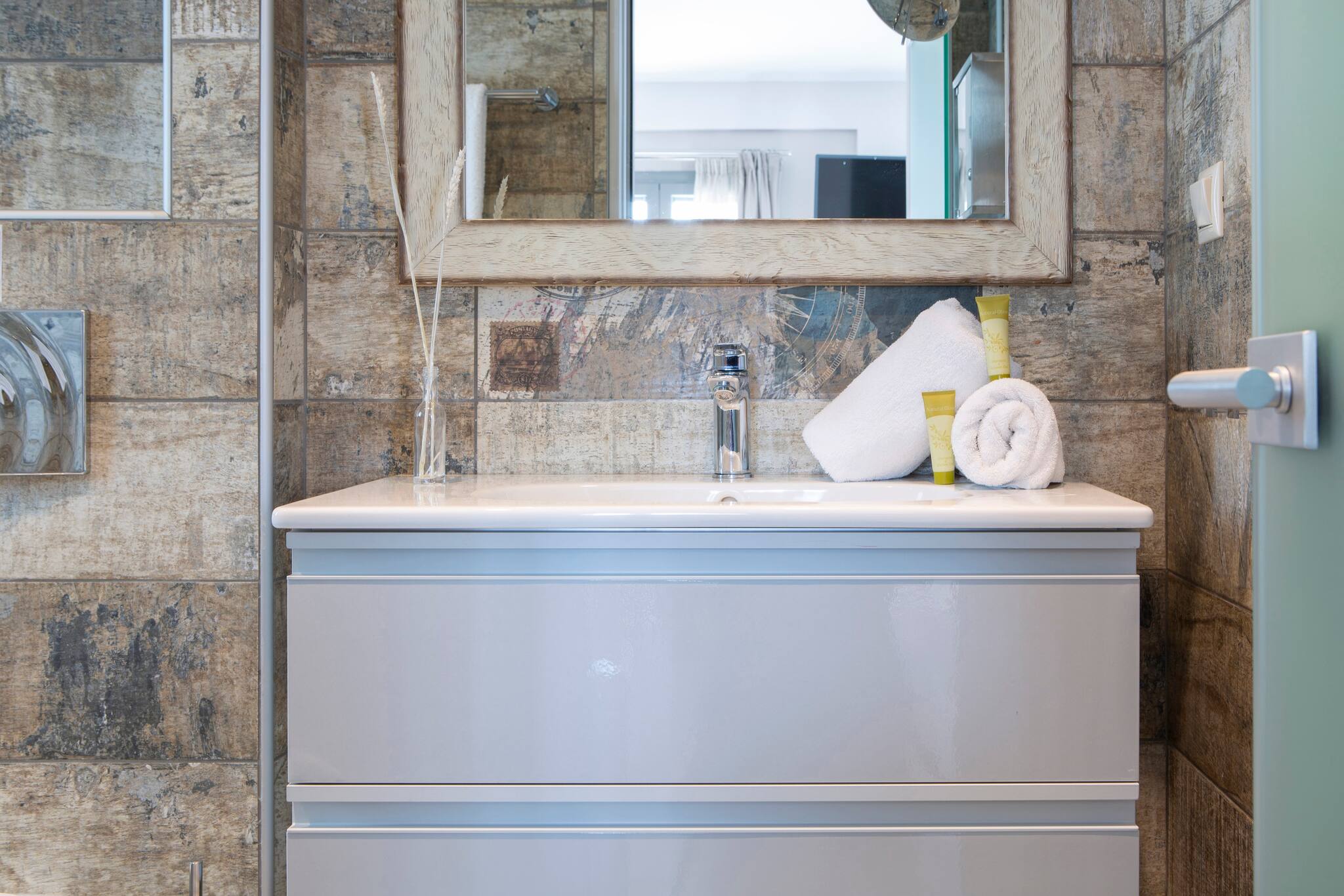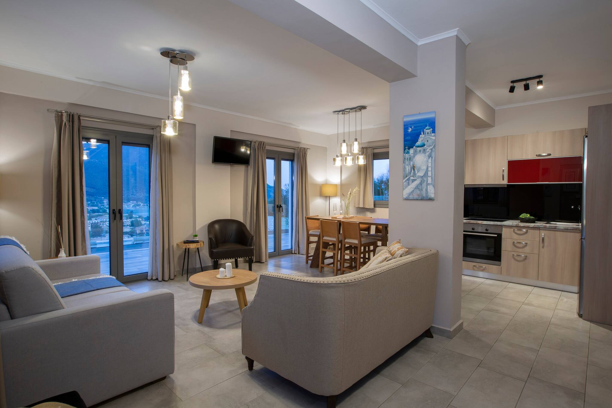 Entering Villa Ostria in Vasiliki Lefkada, you walk into the large open plan kitchen, lounge and dining setting centre piece of the ground level. The kitchen is fully equipped with anything you might need for self-catering. The modern living area offers a comfortable double sofa bed ideal to sleep two additional guests. On the ground floor is a large modern family bathroom with separate WC and shower.