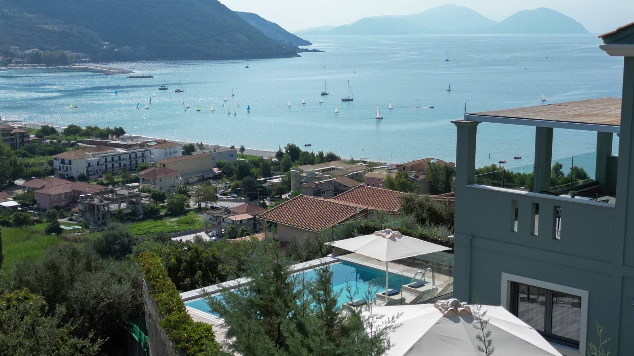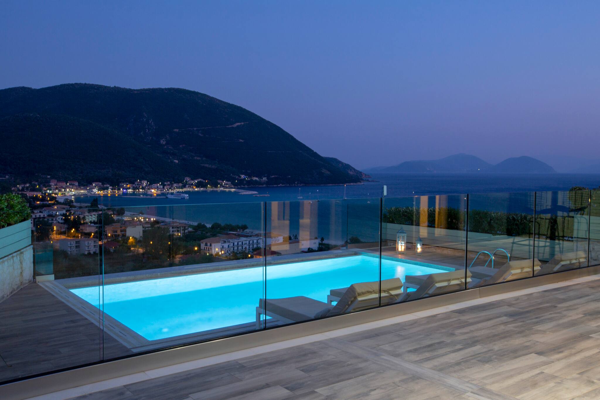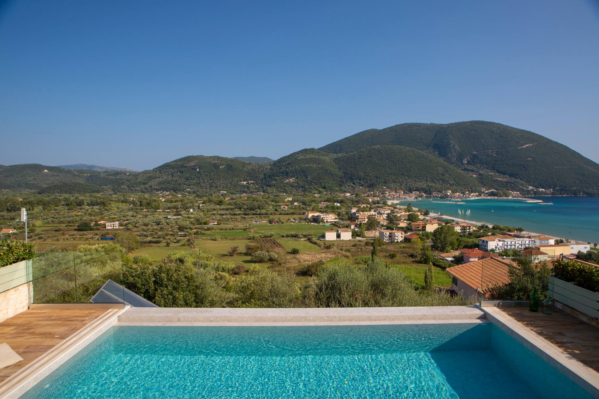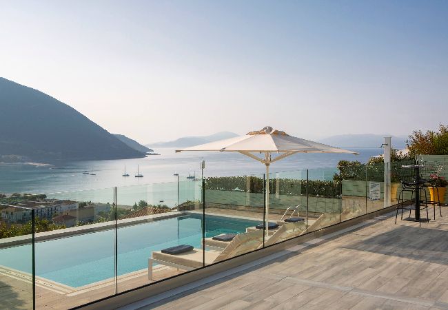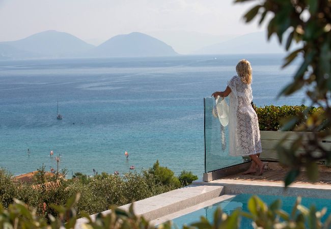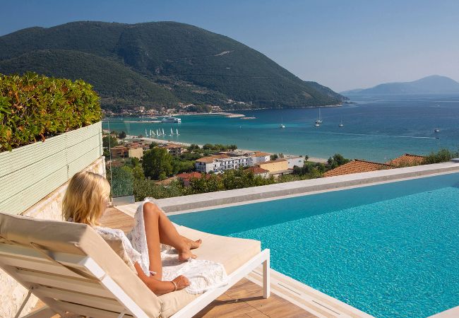 On the mountain above Vasiliki Village, with a breath-taking panoramic view across the Ionian Sea, is beautiful Villa Ostria in Lefkada.
