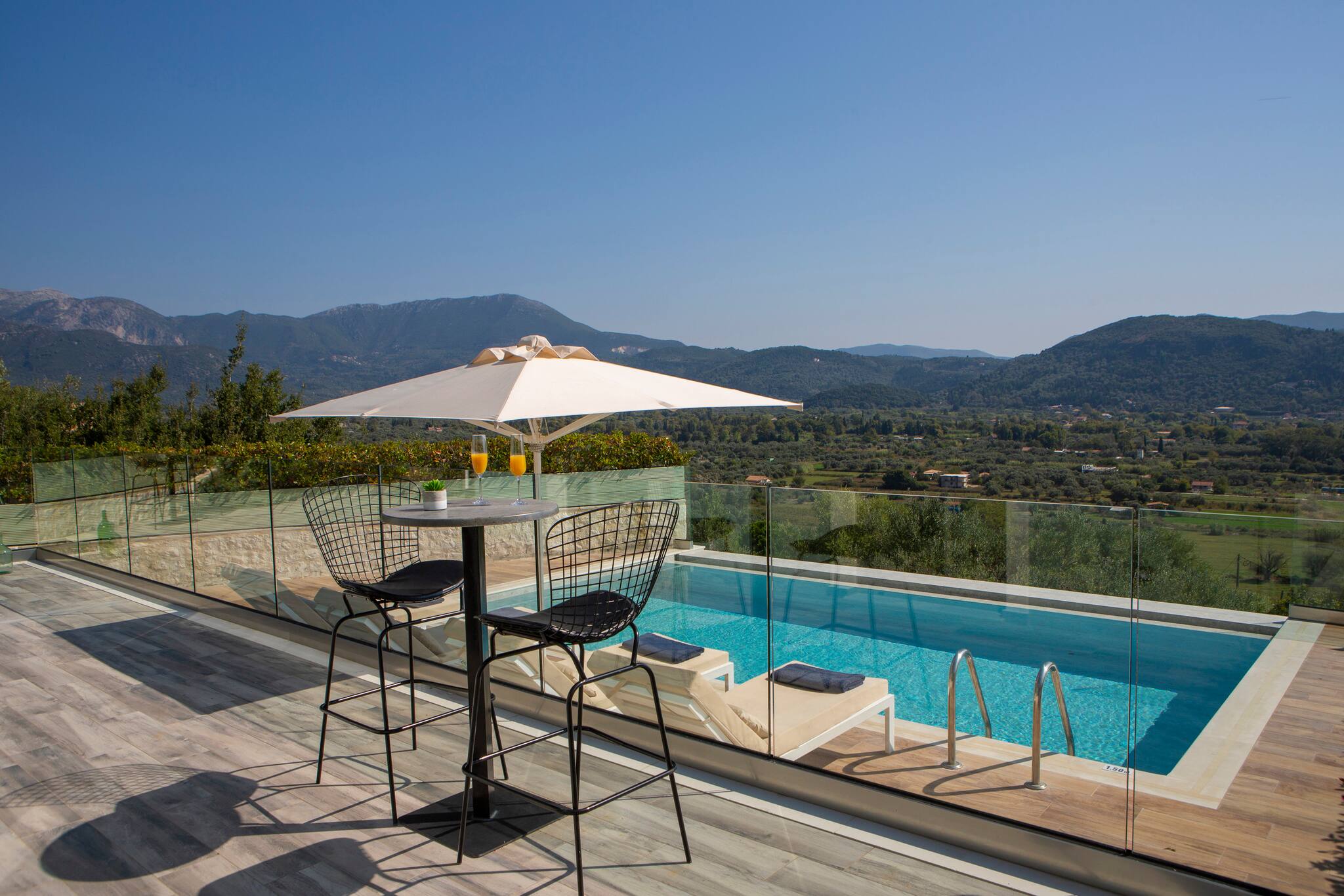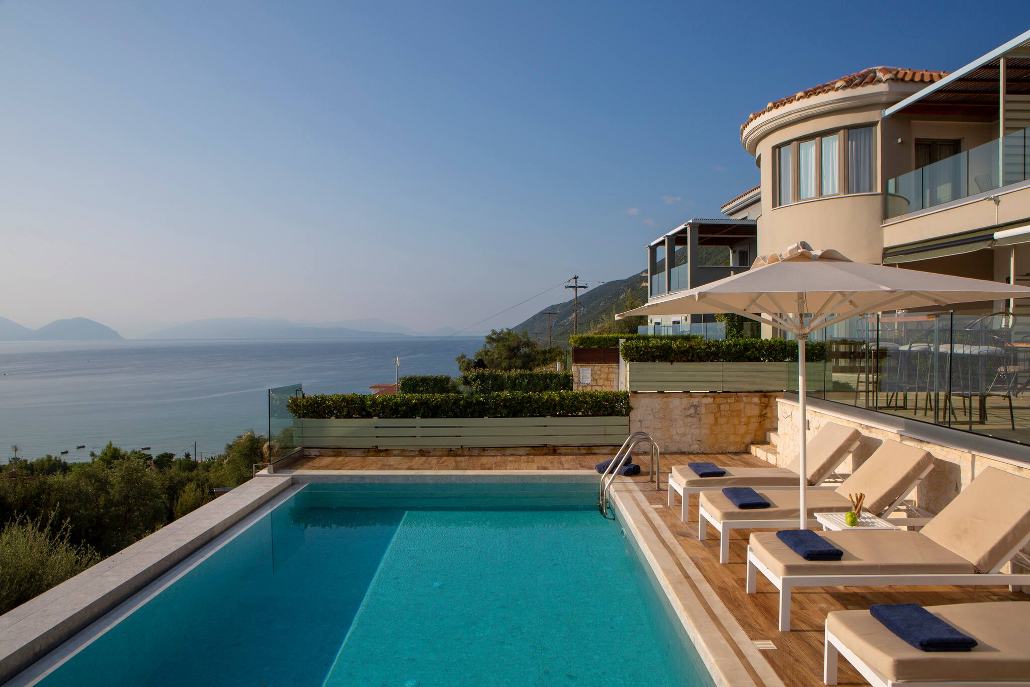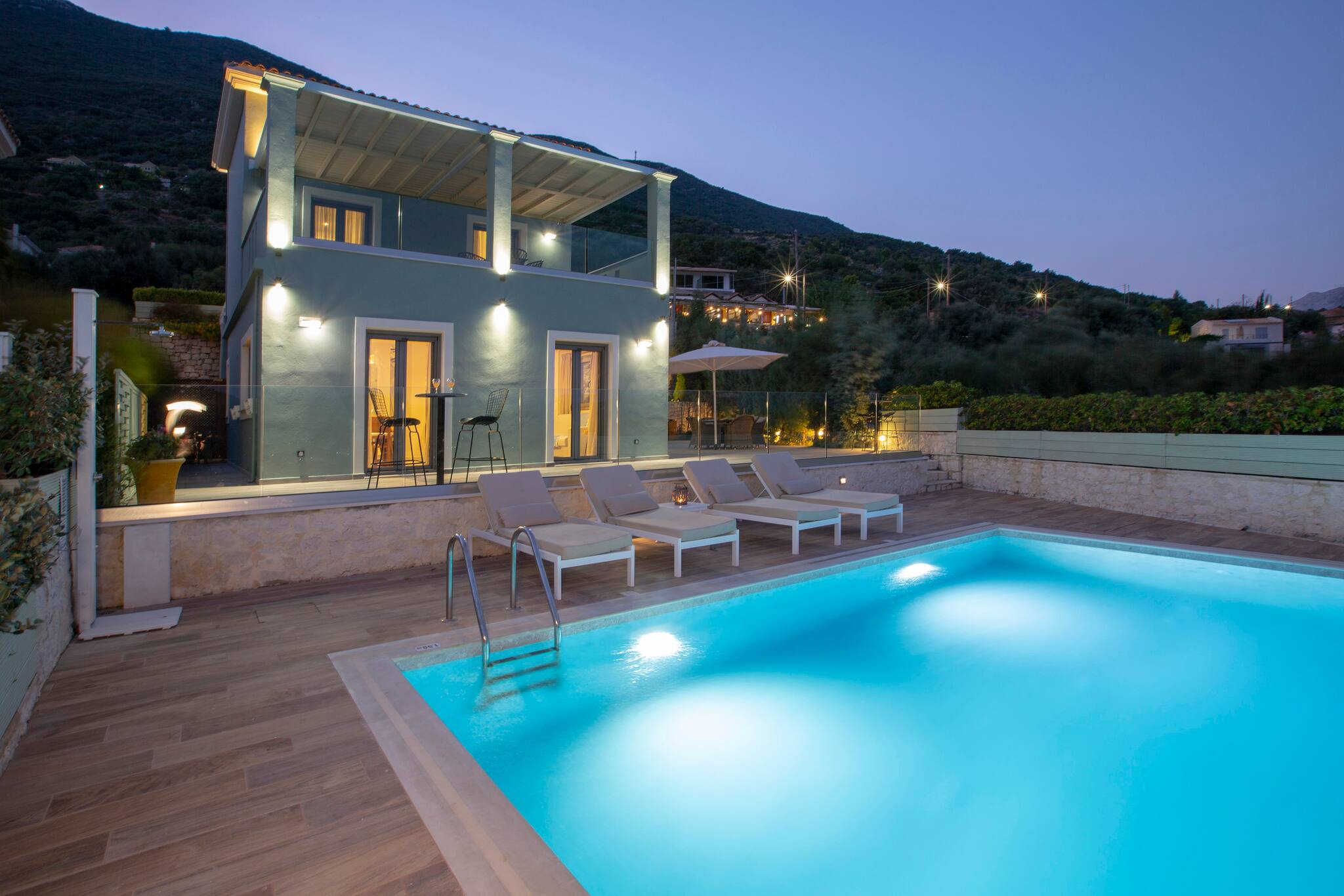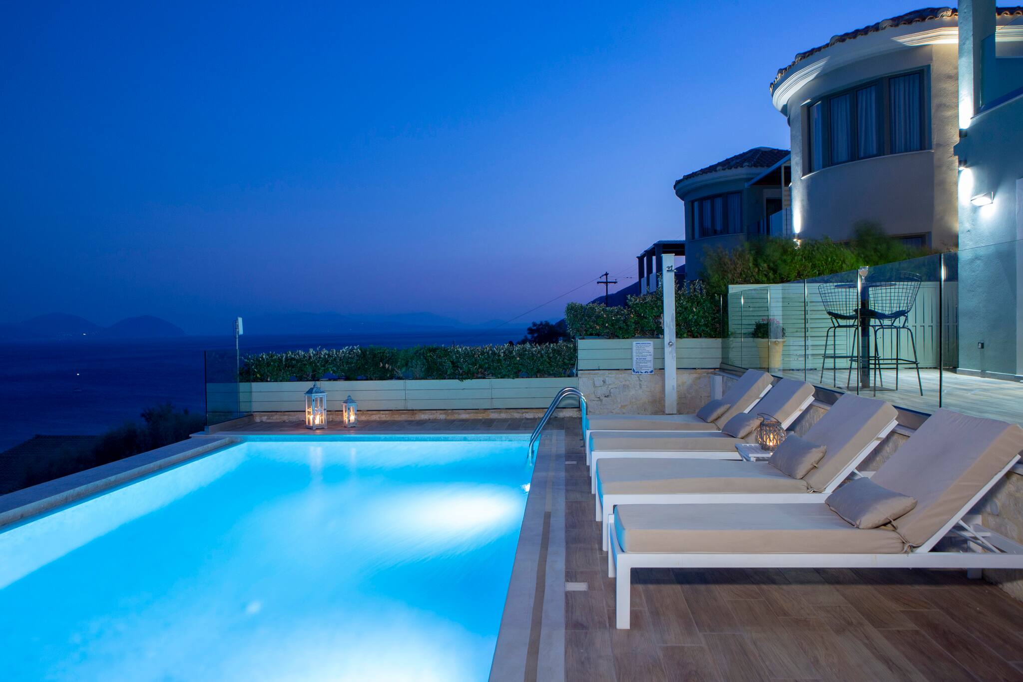Alfresco life at Villa Ostria in Vasiliki is everything you would expect from a Greek Villa Holiday. The private pool is equipped with sun loungers and cushions and with the most amazing sea views.