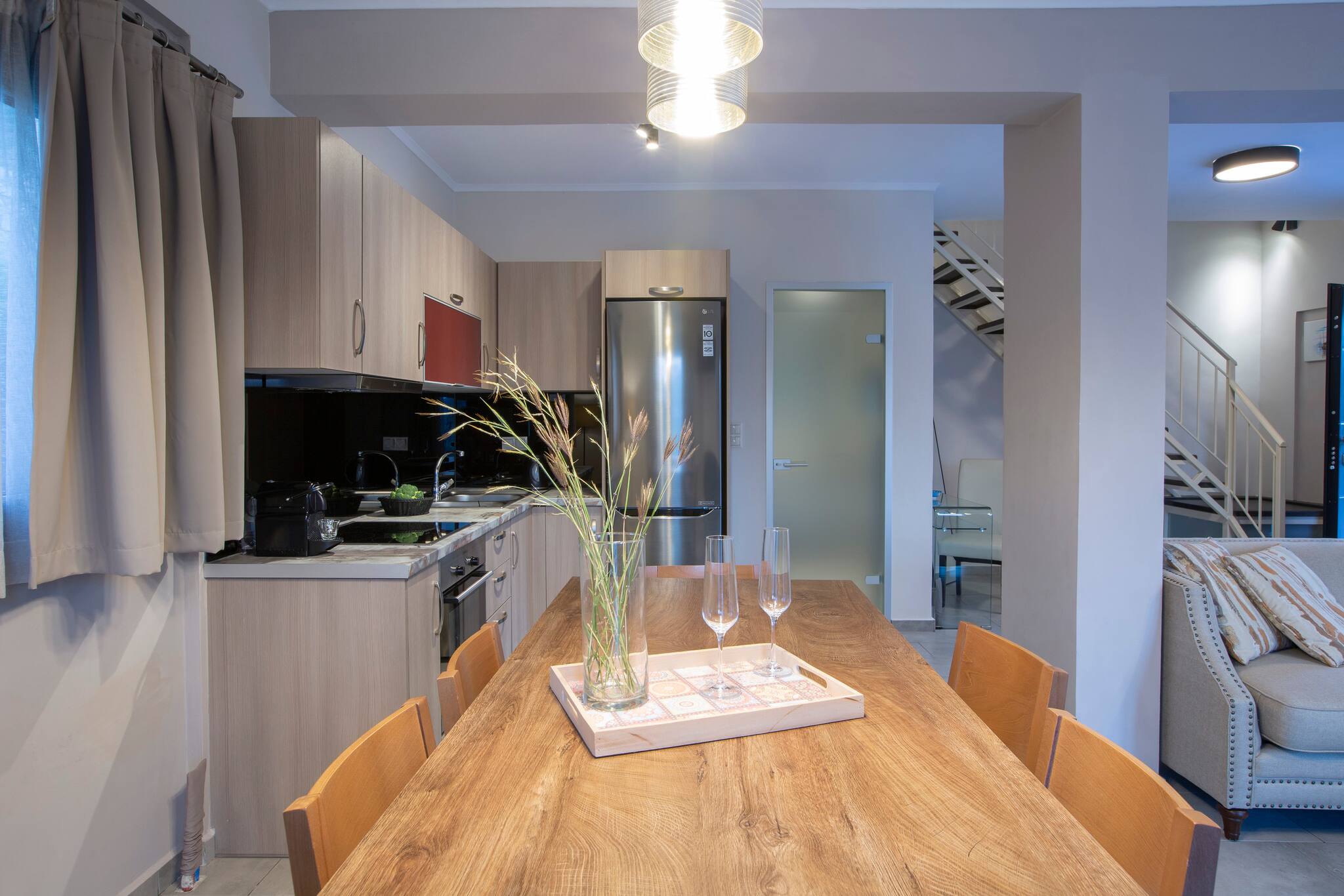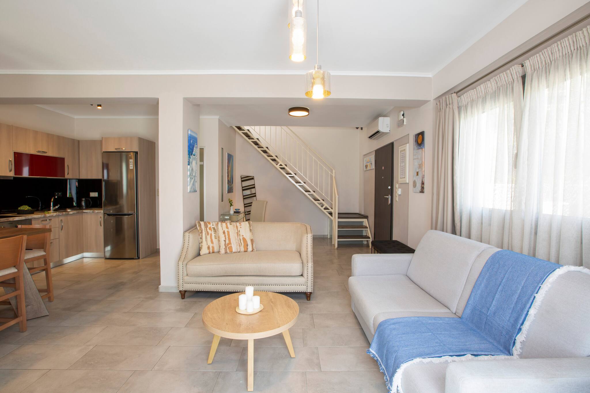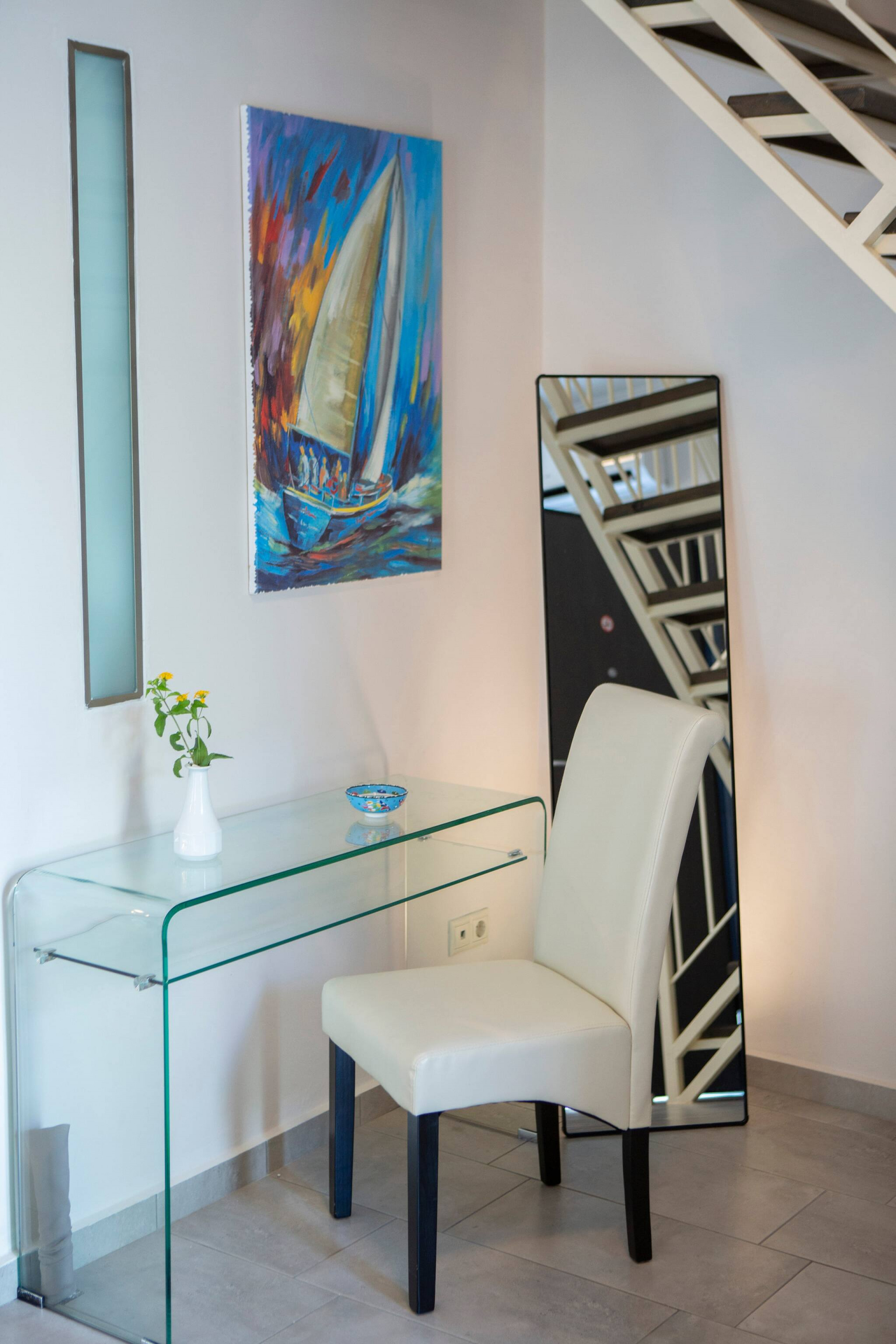 Entering Villa Maria in Vasiliki Lefkada, you walk into the large open plan kitchen, lounge, and dining setting centre piece of the ground level. The kitchen is fully equipped with anything you might need for self-catering. The modern living area offers a comfortable double sofa bed ideal to sleep two additional guests. On the ground floor is a large modern family bathroom with separate WC and shower.