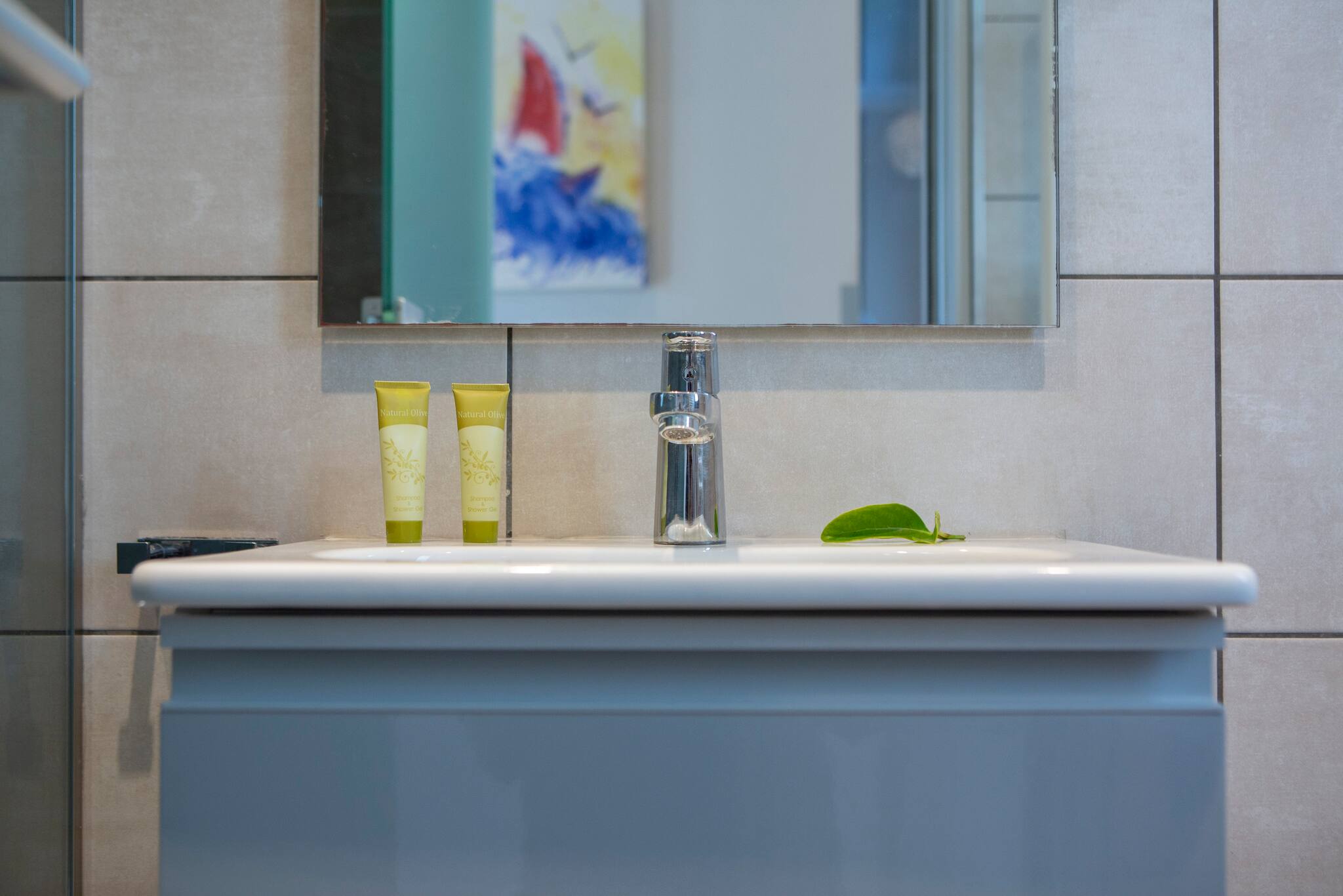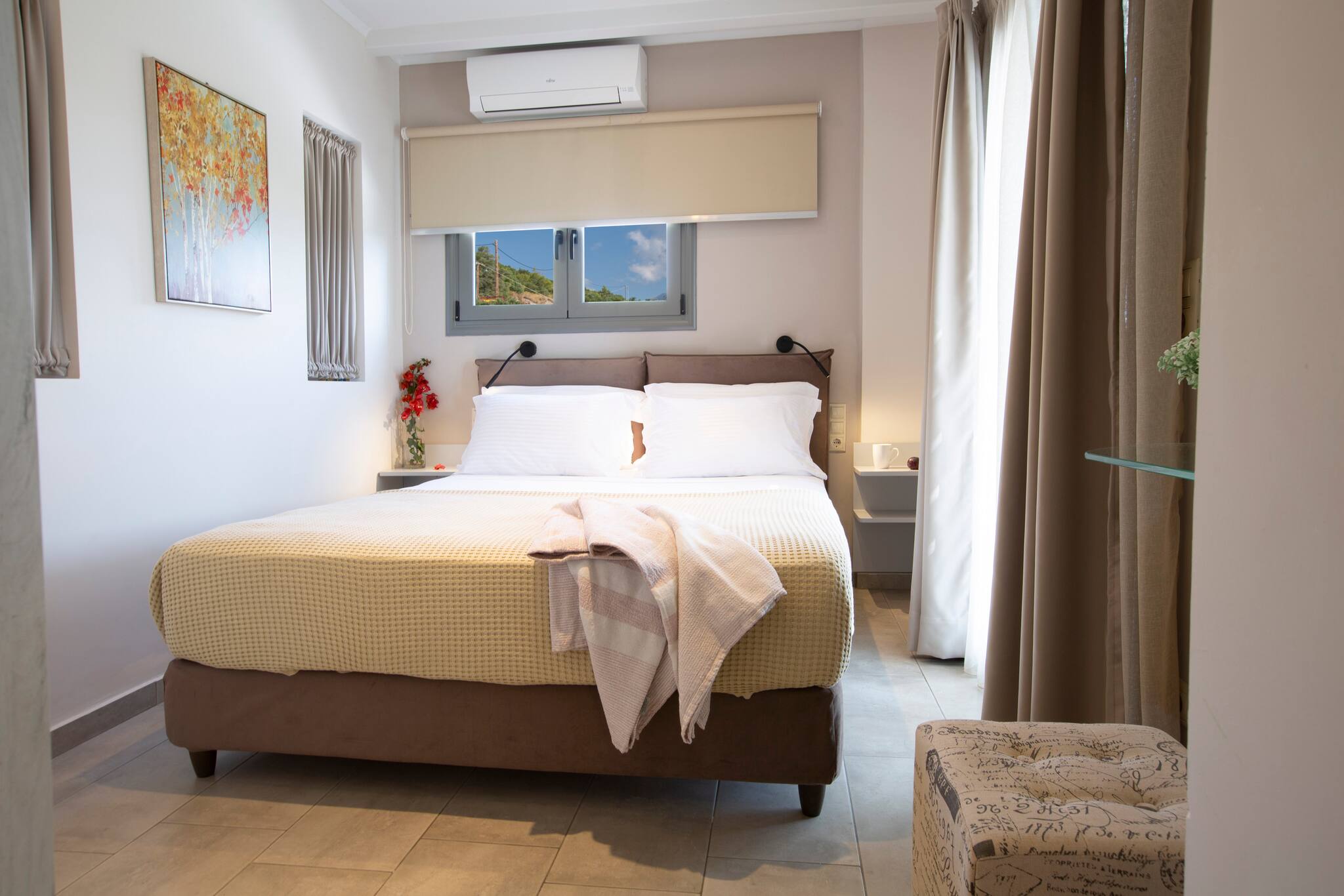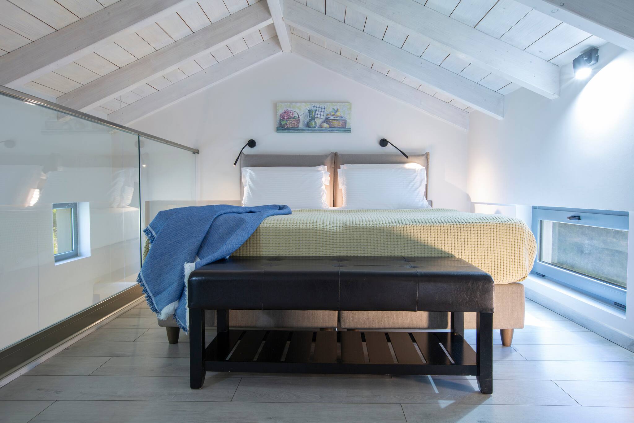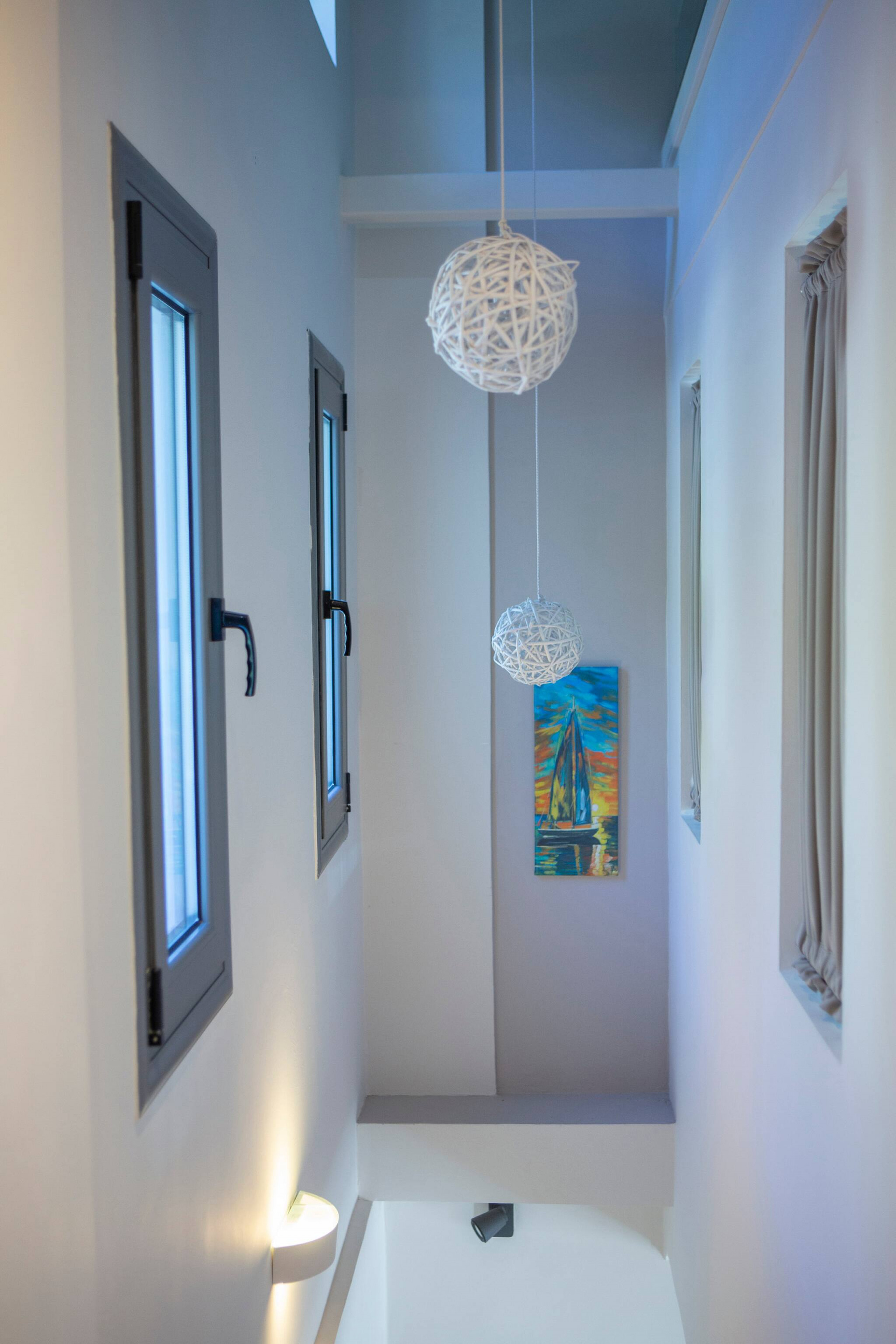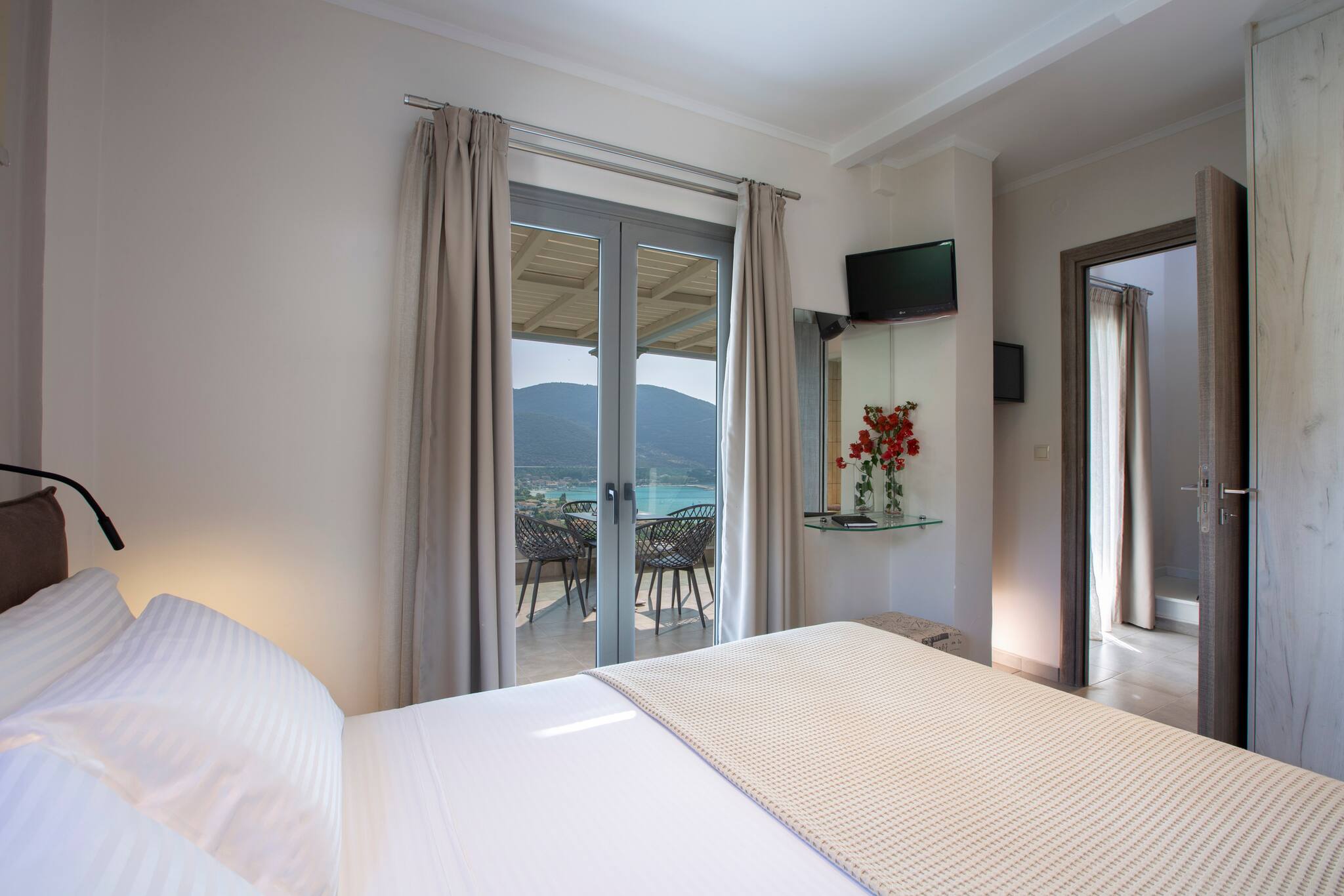 Up the stairs, on the first level, are two double bedrooms. Both bedrooms have the comfort and luxury of en-suite bathrooms and private balcony overlooking the Ionian Archipelagos and Kefalonia in the distance.