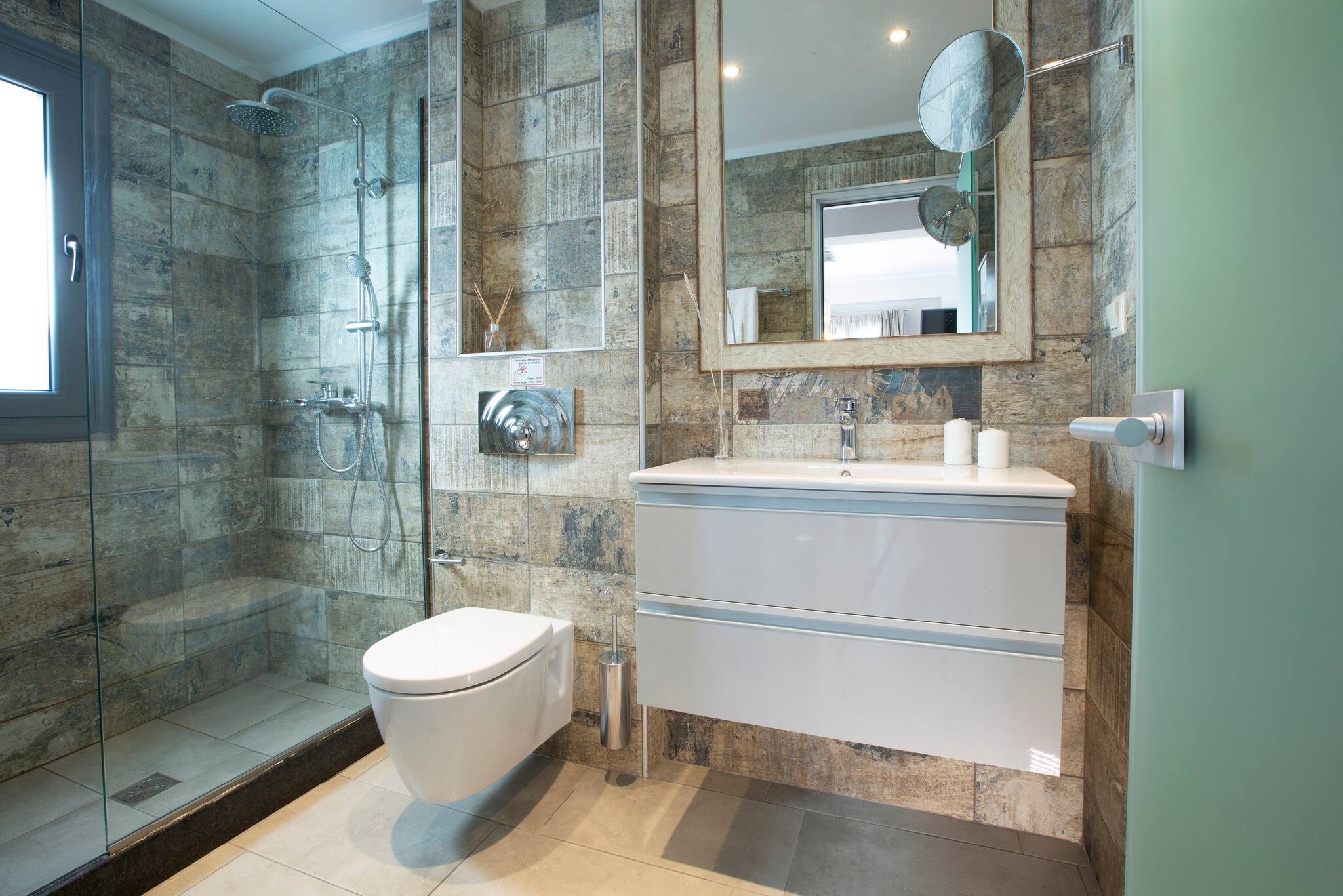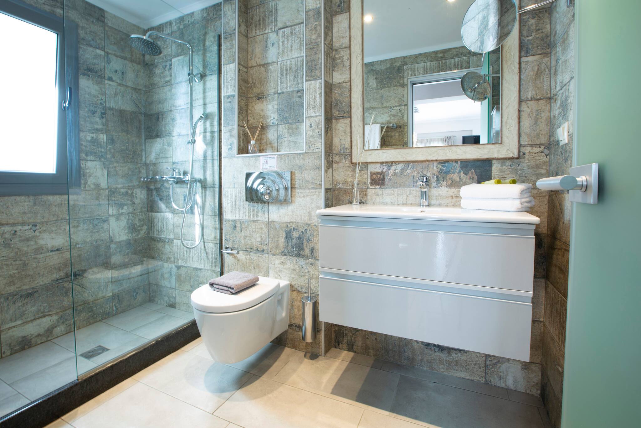 When you enter Villa Dream, you walk into the open living area with as centerpiece the stone built fireplace. Here is also the fully equipped open plan kitchen with the dining table right next to it so you can serve your tasty Greek traditional meals straight to the table. The ground floor offers direct access to the verandah with outdoor dining. There conveniently is a family bathroom with shower on the ground floor.