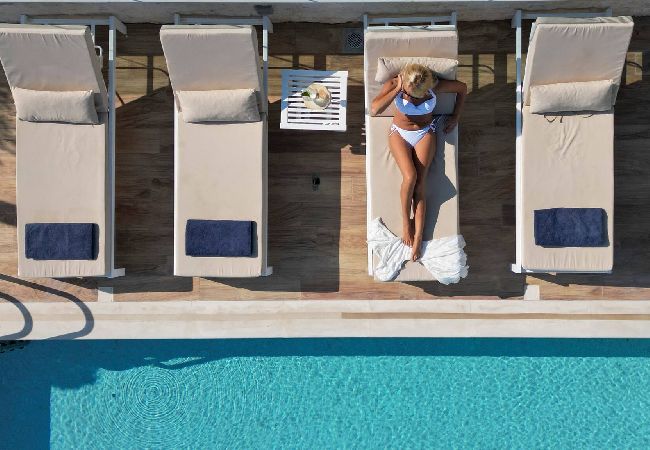 One of the greatest aspects of Villa Dream is the private exterior area. The large swimming pool gracefully lies on the level below Villa Dream, offering the dreamy sea views and privacy you desire. Apart from the wonderful swimming pool, the exterior offers sun beds, seating areas, outdoor dining, private parking, and a stone built BBQ for tasty grilled delicacies.